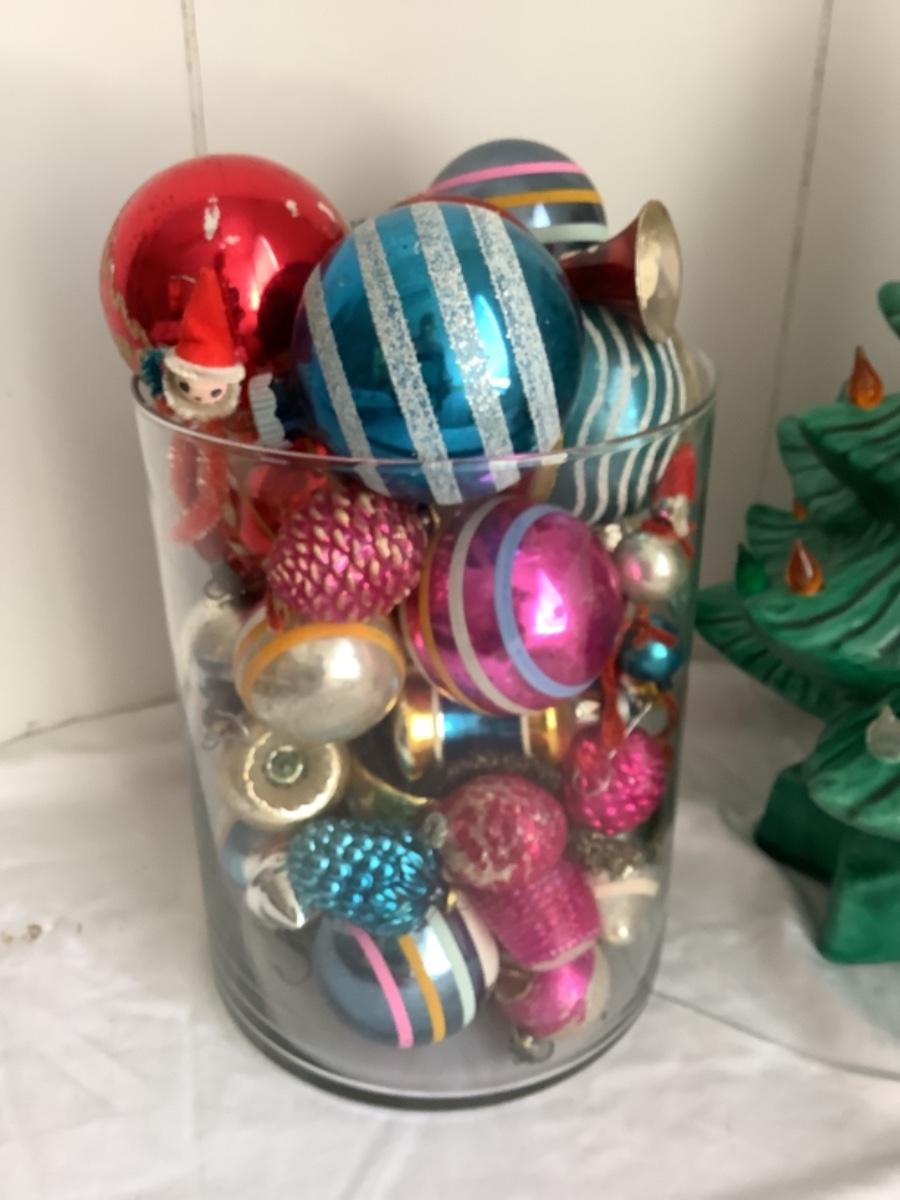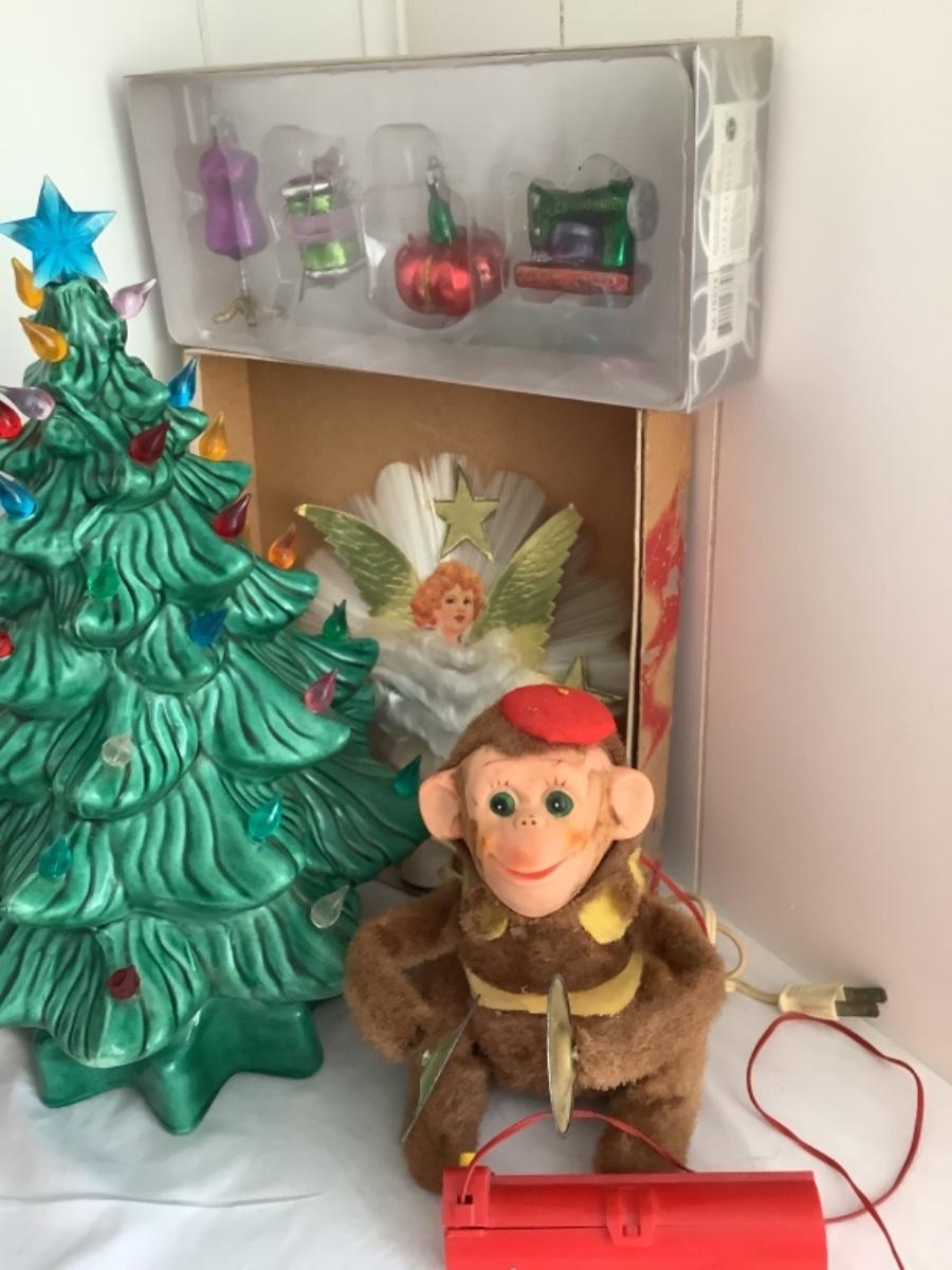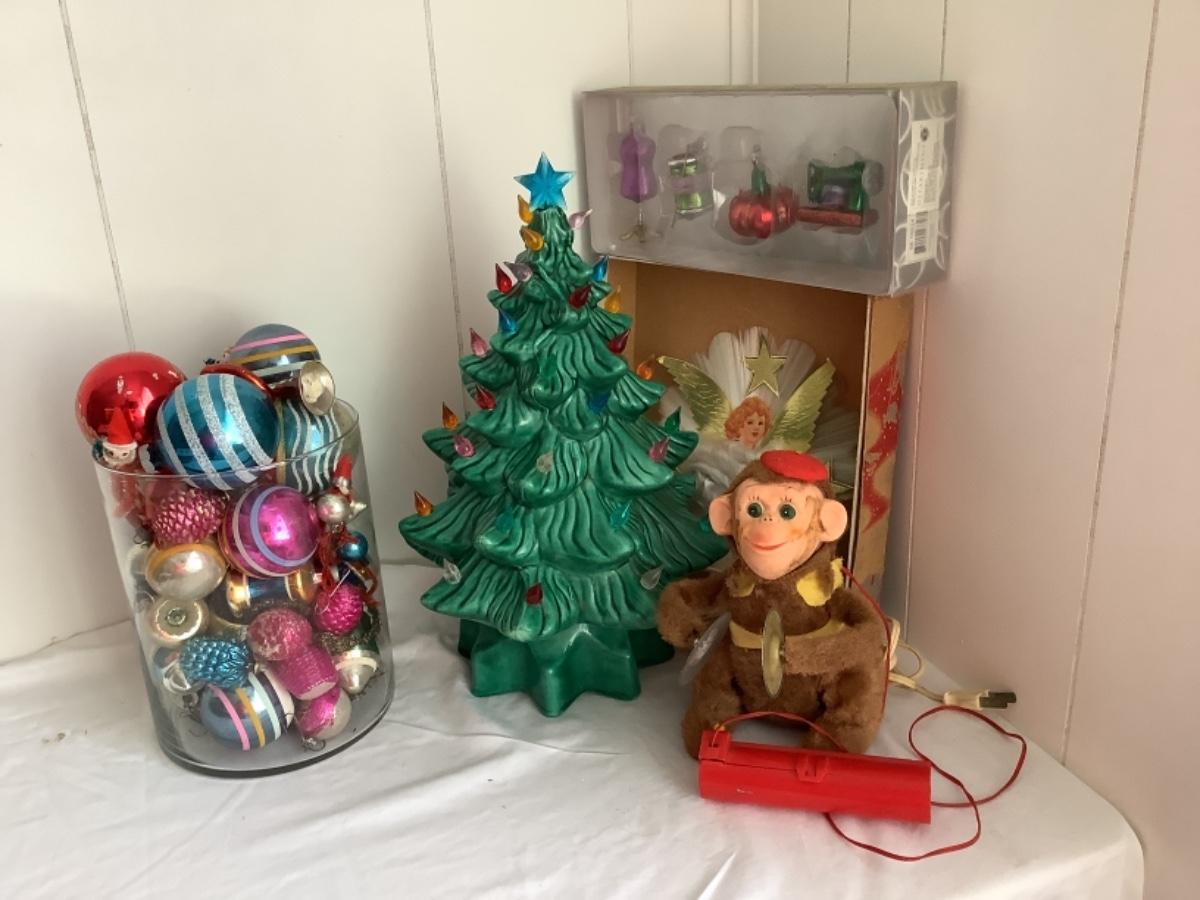 Vintage Christmas Ceramic Tree & Vintage Ornaments , Vintage Monkey and more