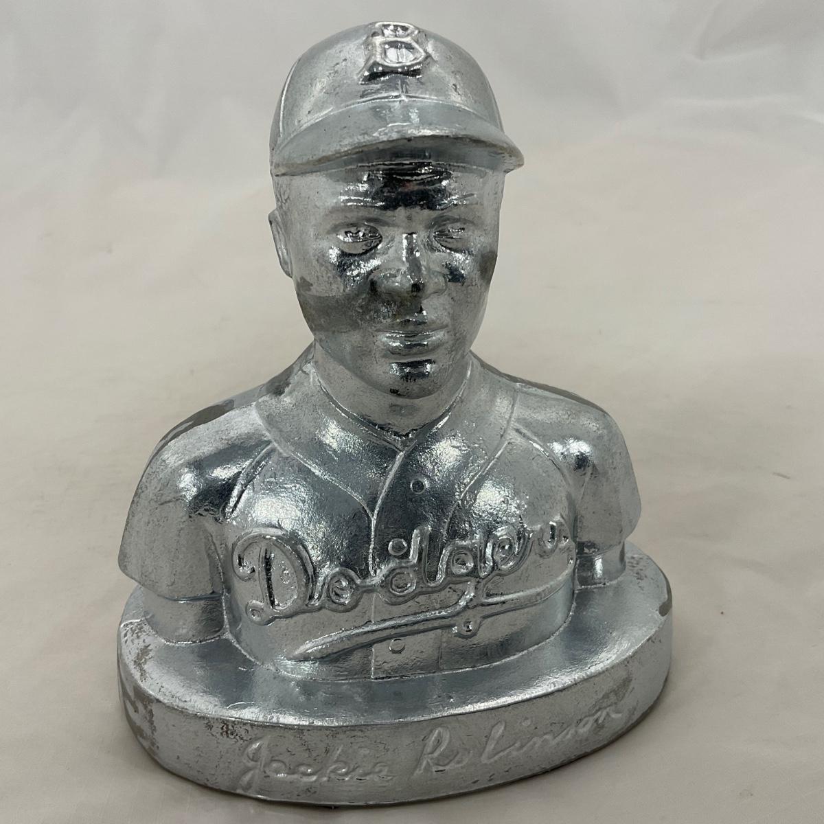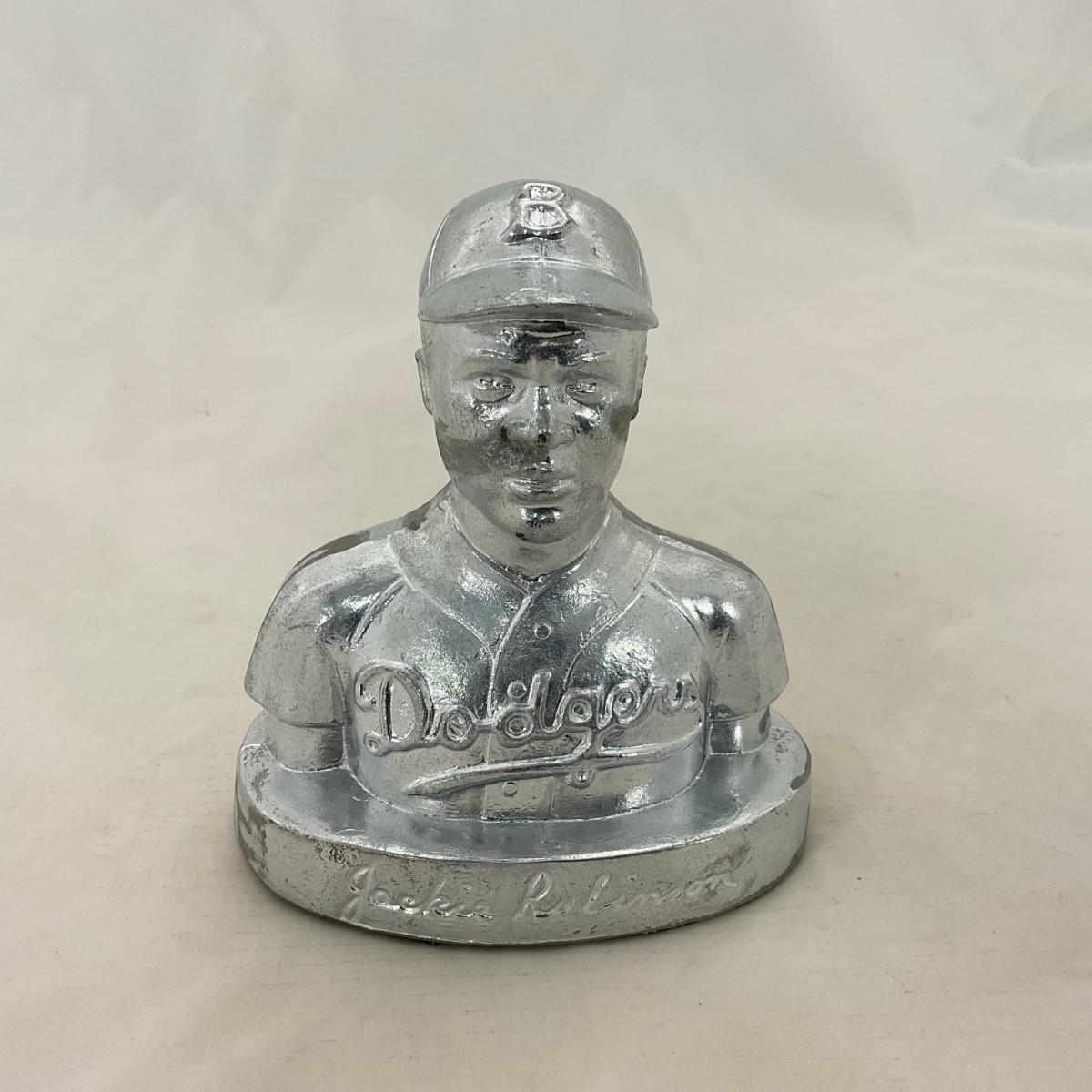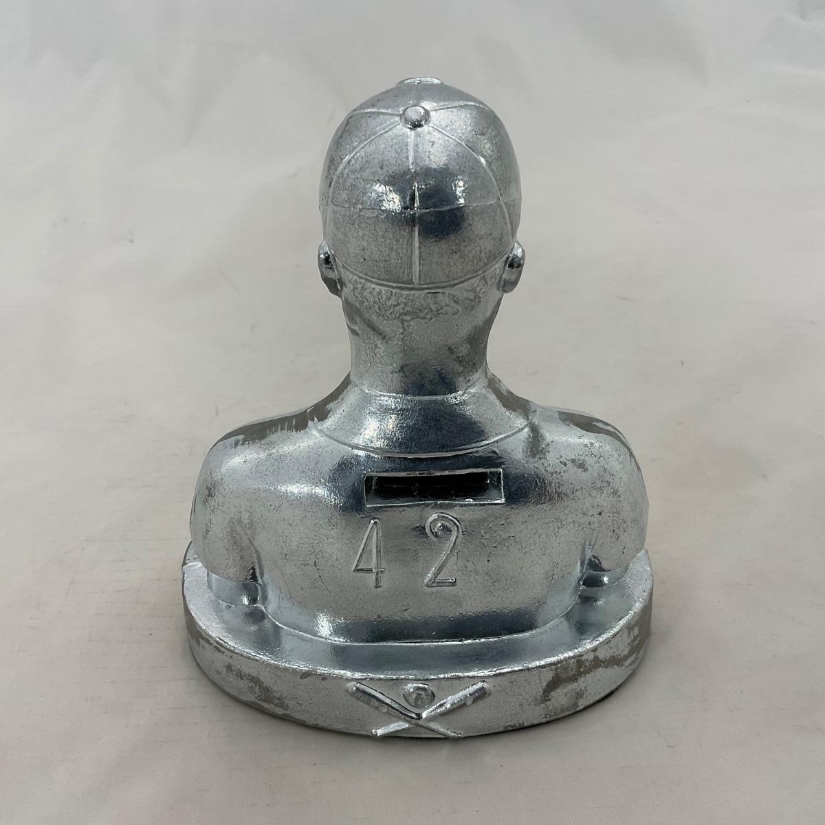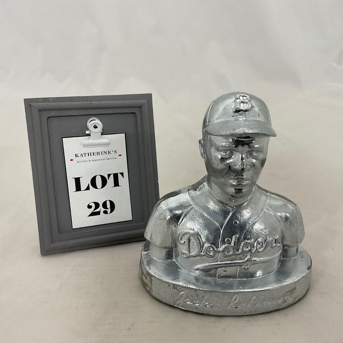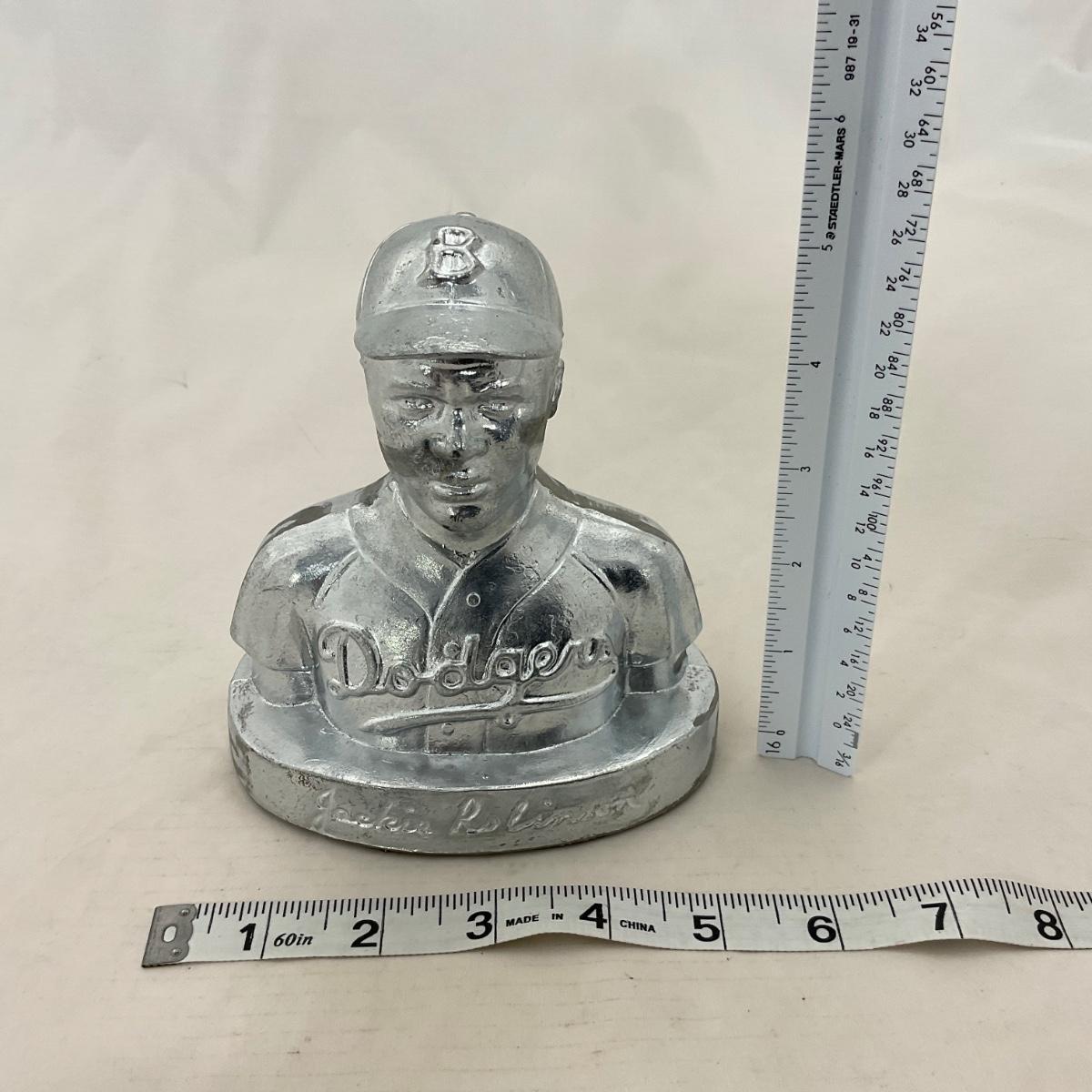 Jackie Robinson #42 Dodgers metal bank. Please see photos for details and condition. ::: Shipping is available on this lot. If you require shipping you must let us know at the close of the auction. We will coordinate with you after the item has been won. Shipping fees will include insurance up to or exceeding the value of all items being mailed. If you have any questions regarding this lot please contact the auctioneer either via this website, by direct email or by phone. PICK UP TIMES and other important information can be found in the TERMS and DESCRIPTION of the auction. Please take a look for pertinent information. Thanks!