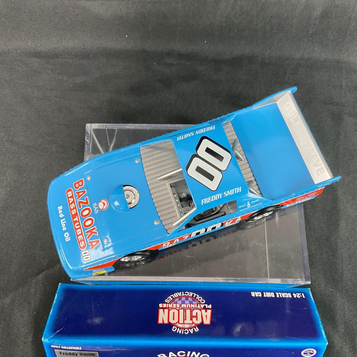 One dirt car 1/24 scale Freddy Smith die-cast model car. Please see photos for details and condition. Any condition statement is given as a courtesy to a client, is an opinion, and should not be treated as a statement of fact. Reference to condition written, oral or within a condition report shall not be regarded as a full account of condition and may not include all defects, alterations, or restorations. Absence of a condition report does not imply a lot is flawless or lacking imperfections or damage. Katherine’s Auction & Appraisal Service shall have no responsibility for any error or omission. Returns shall not be accepted on the basis of condition. ::: Shipping is available on this lot. If you require shipping you must let us know at the close of the auction. We will coordinate with you after the item has been won. Shipping fees will include insurance up to or exceeding the value of all items being mailed. If you have any questions regarding this lot please contact the auctioneer either via this website, by direct email or by phone. PICK UP TIMES and other important information can be found in the TERMS and DESCRIPTION of the auction. Please take a look for pertinent information. Thanks!