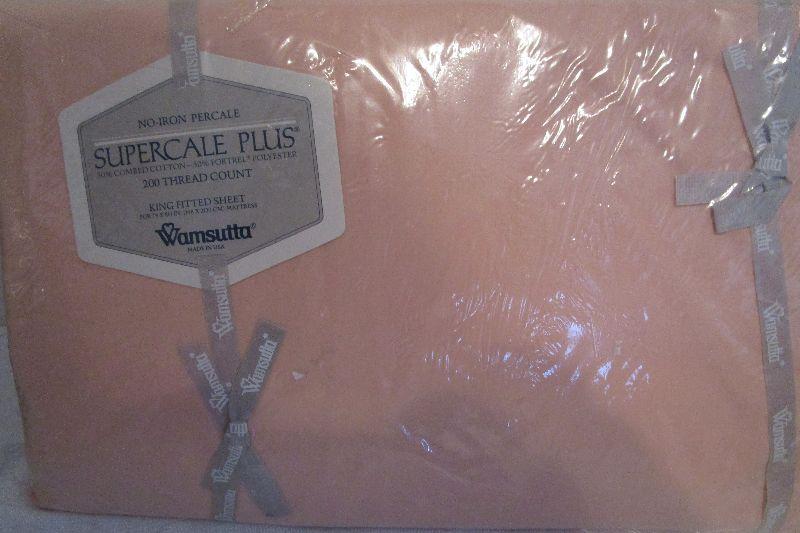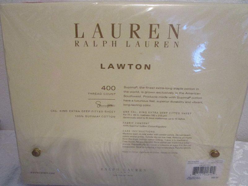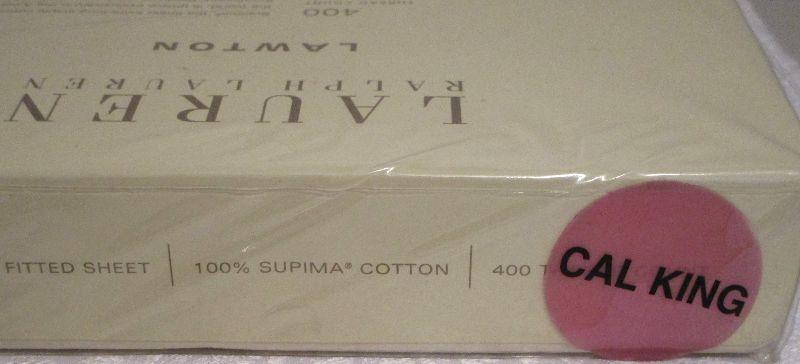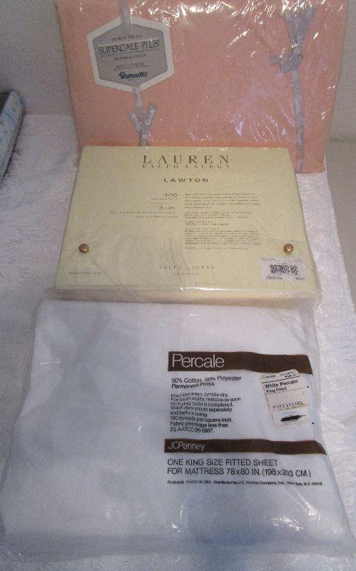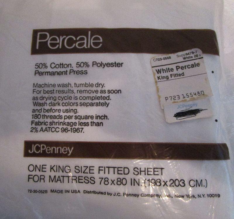 JCPenney King size Percale fitted sheet 50% cotton, 50% Polyester permanent press; Wamsutta No-Iron Supercale Plus fitted sheet 50% cotton 50% Fortrel Polyster 200 thread count; Ralph Lauren Lawton 400 tread count California King extra deep fitted sheet 100% Supima cotton