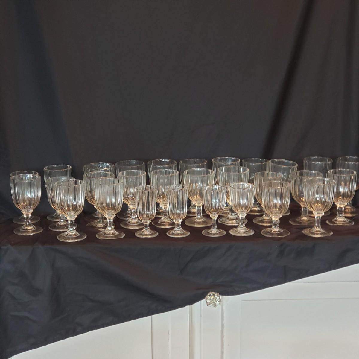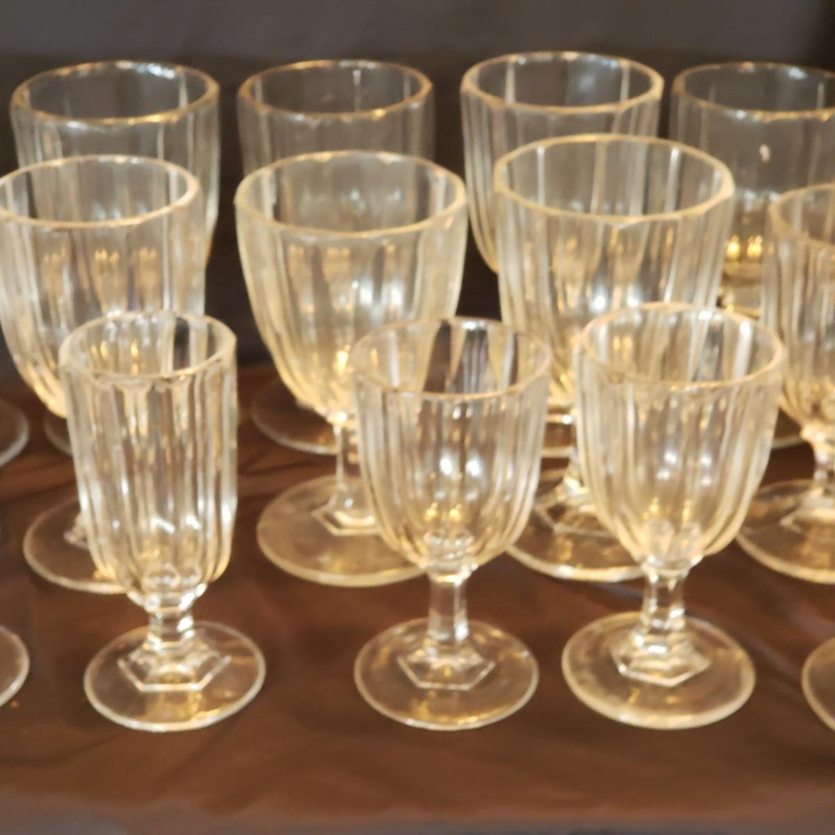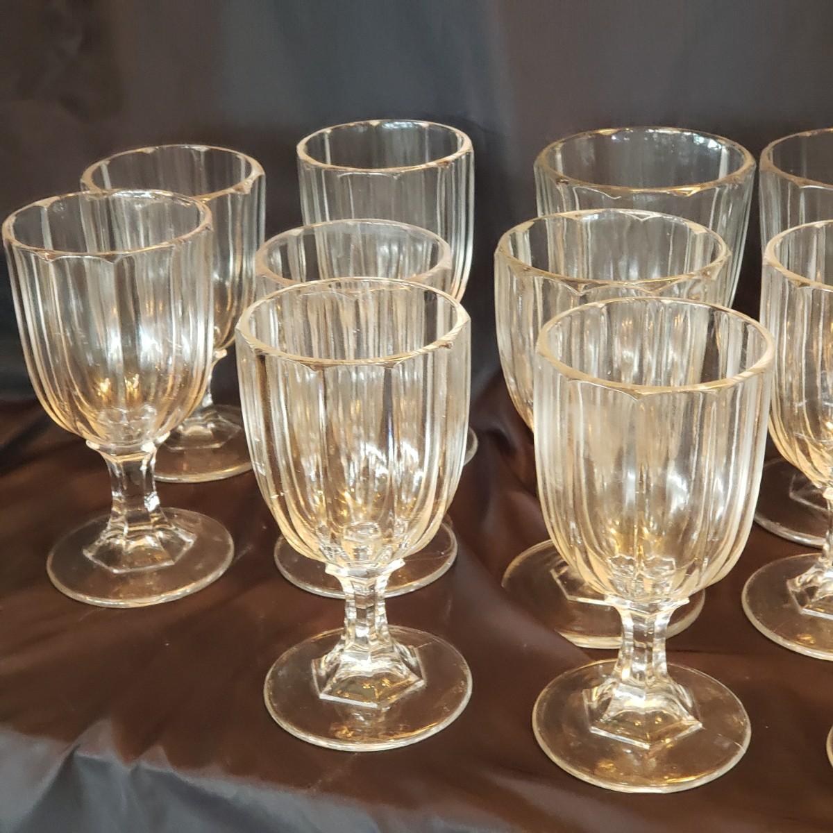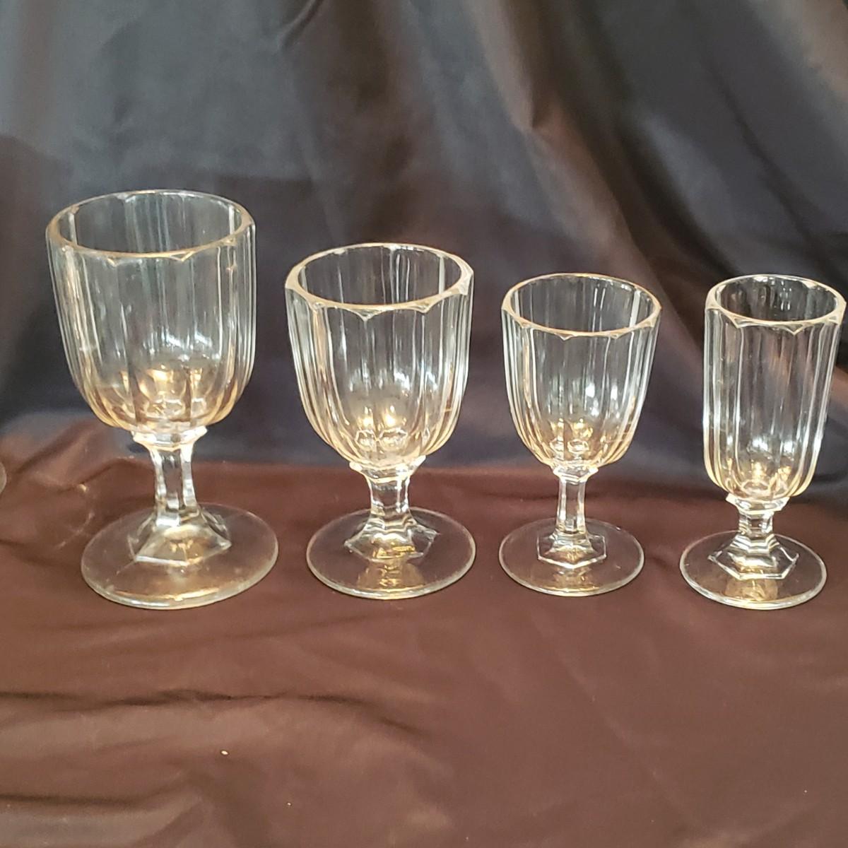 This large lot of 29 glasses has 4 different sizes. The style is Huber Flint, but there are no marks to be sure of the manufacturer. There are two small glasses measuring 2.5" x 5" H. The next two glasses in size measure approximately 3" x 5" H. The remaining 25 glasses measure approximately 3" x 6" H.