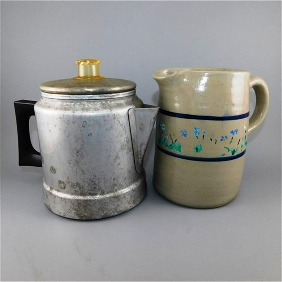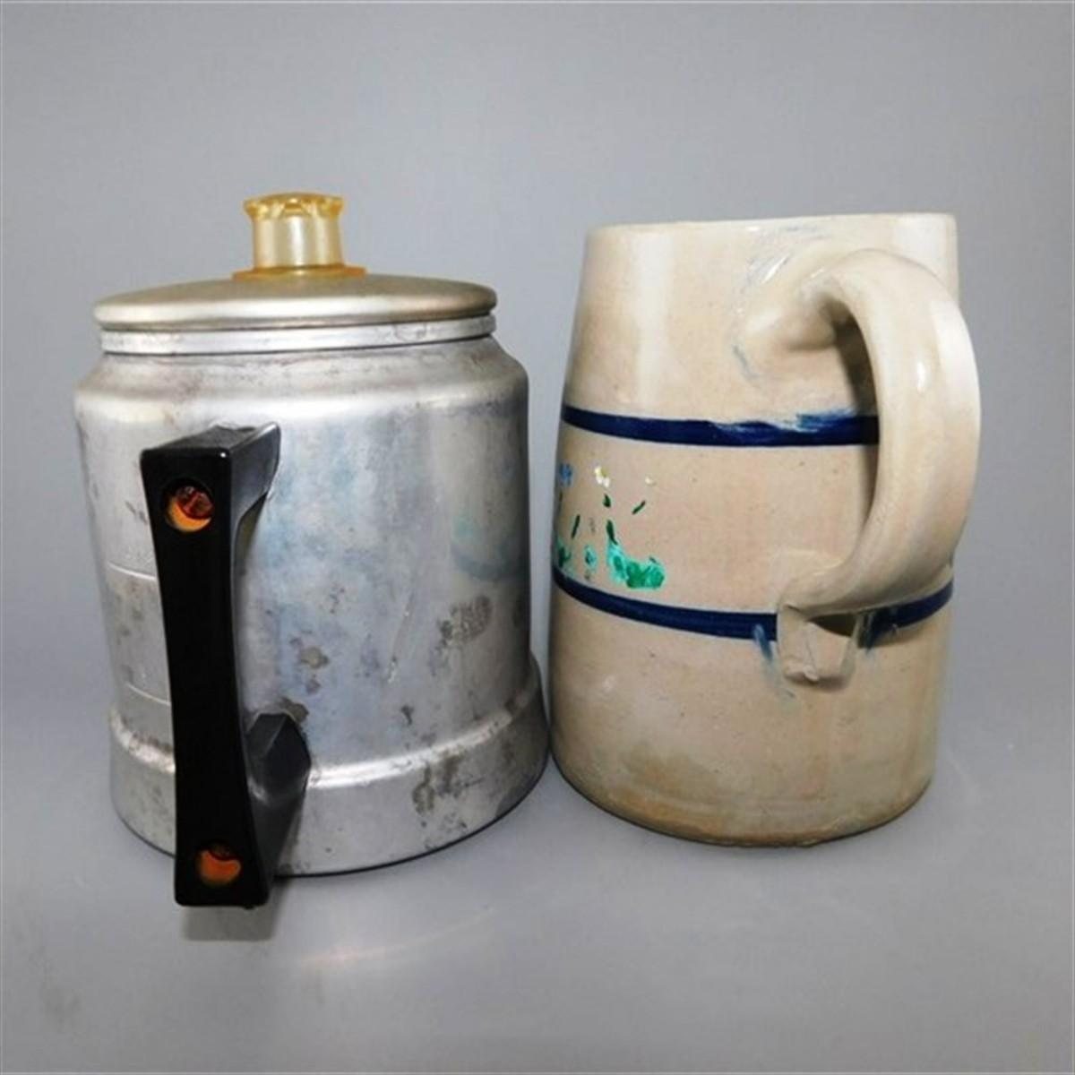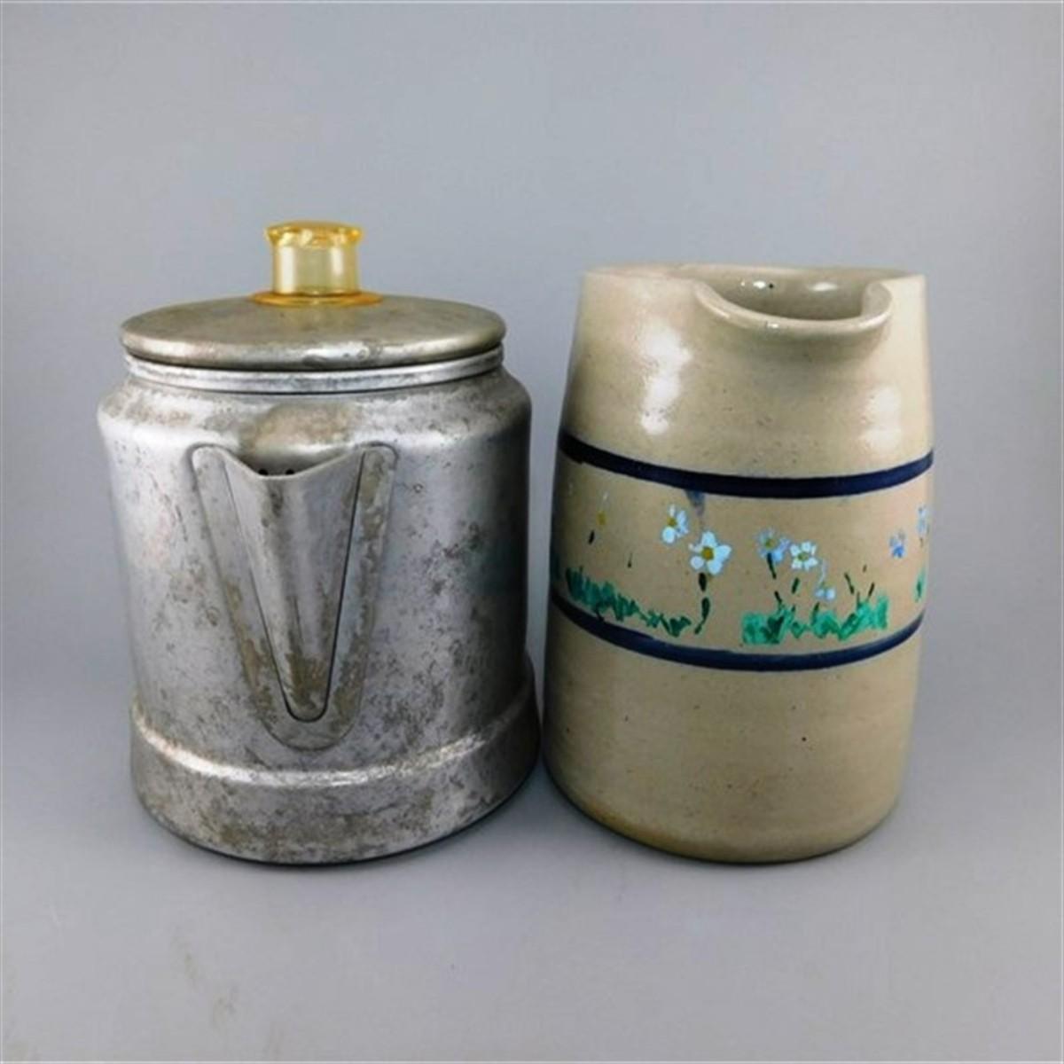 29 Lot of 2 Vintage Kitchen - 6" Aluminum Coffee Kettle and 5 1/2" Crock Jug