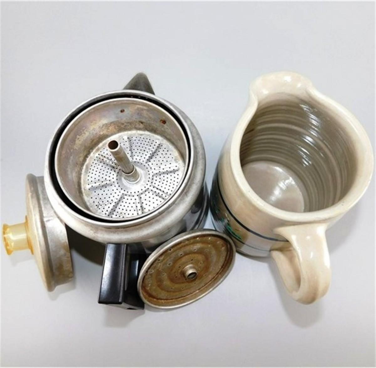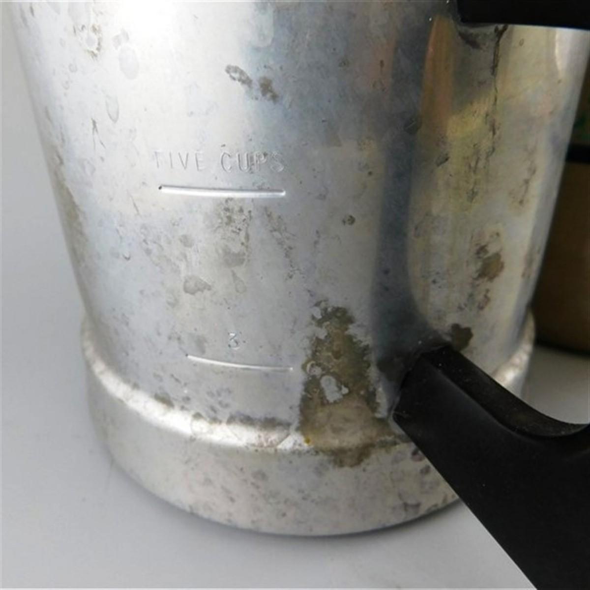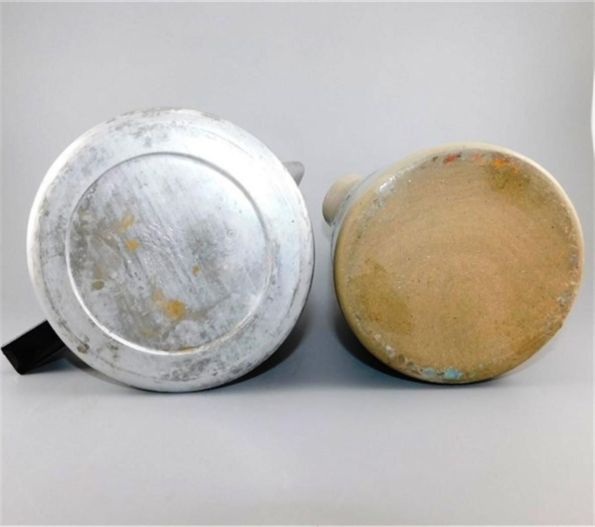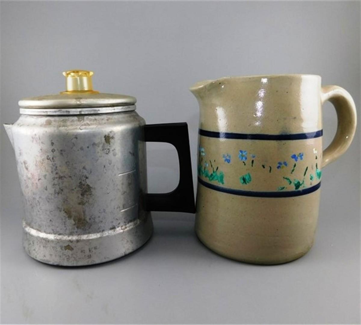 29 Lot of 2 Vintage Kitchen - 6" Aluminum Coffee Kettle and 5 1/2" Crock Jug