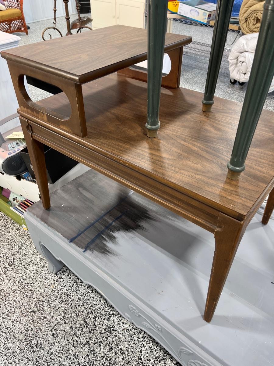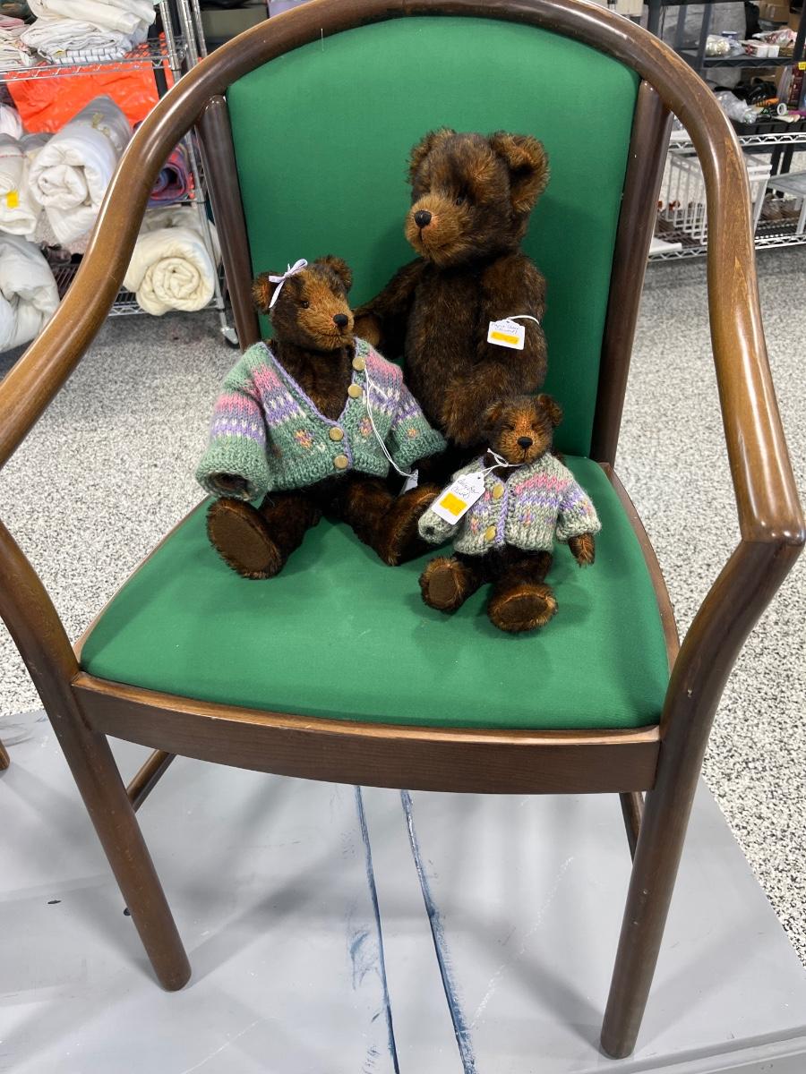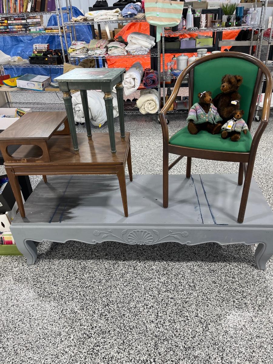 29- MCM end table, chair, plant stand. Teddy bears, project coffee table