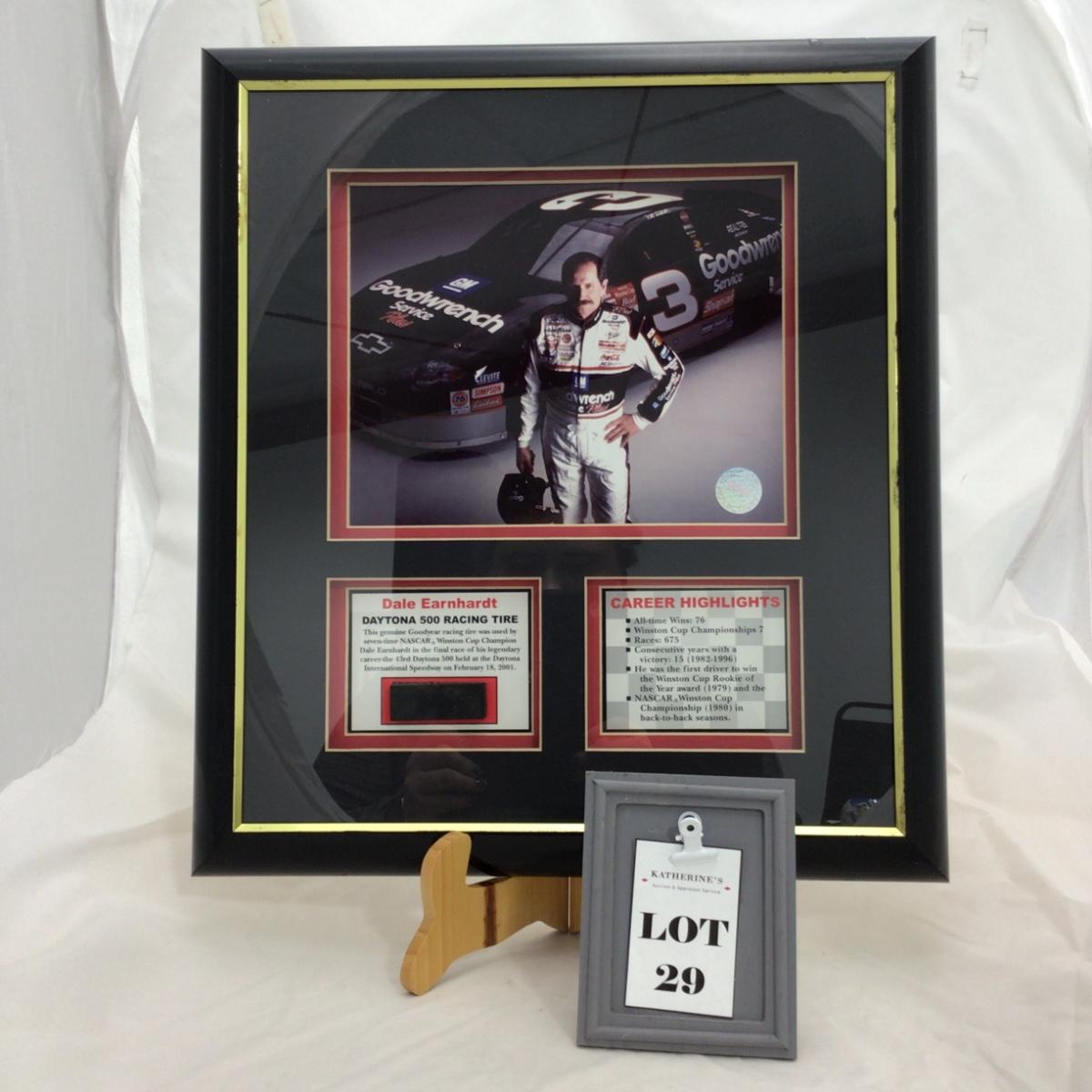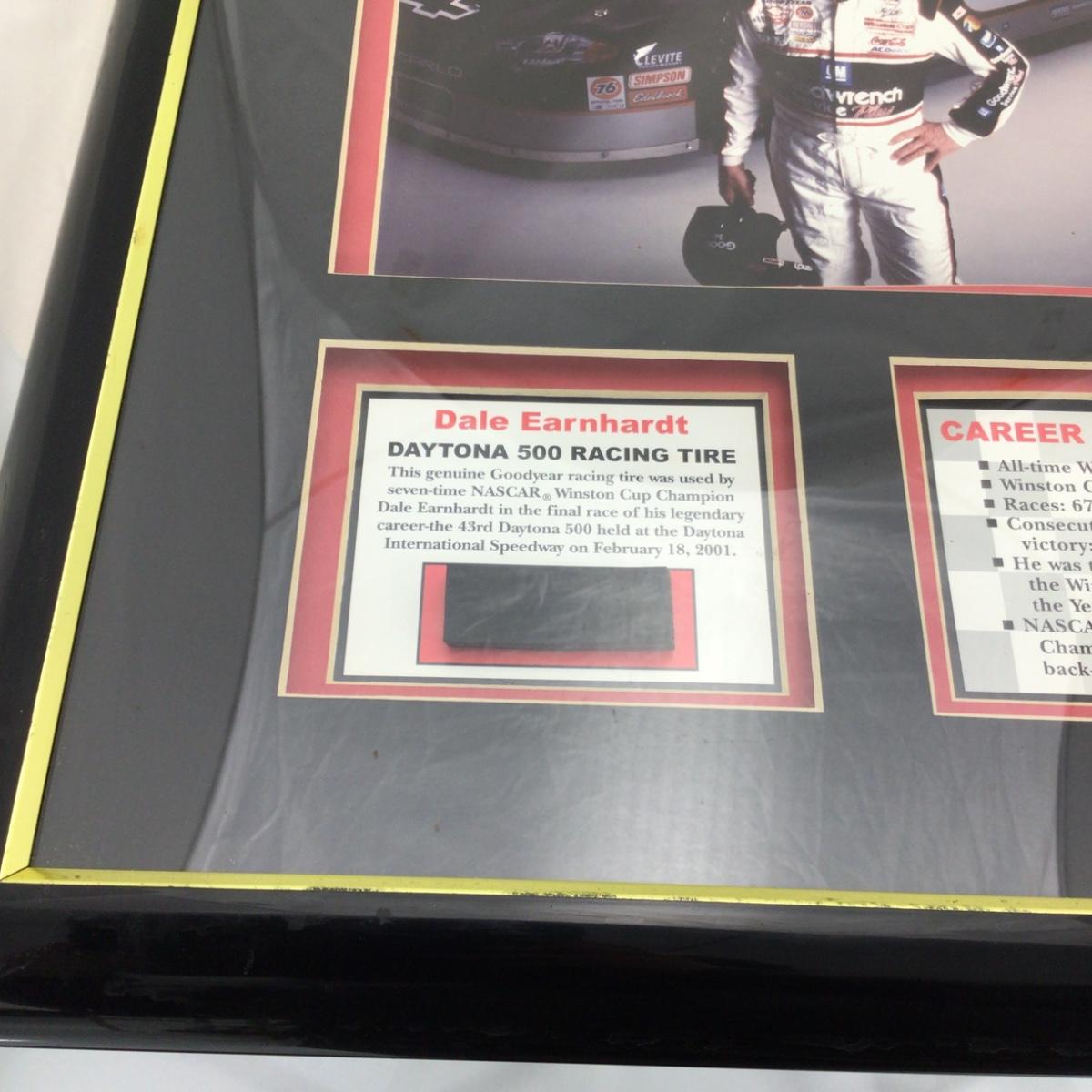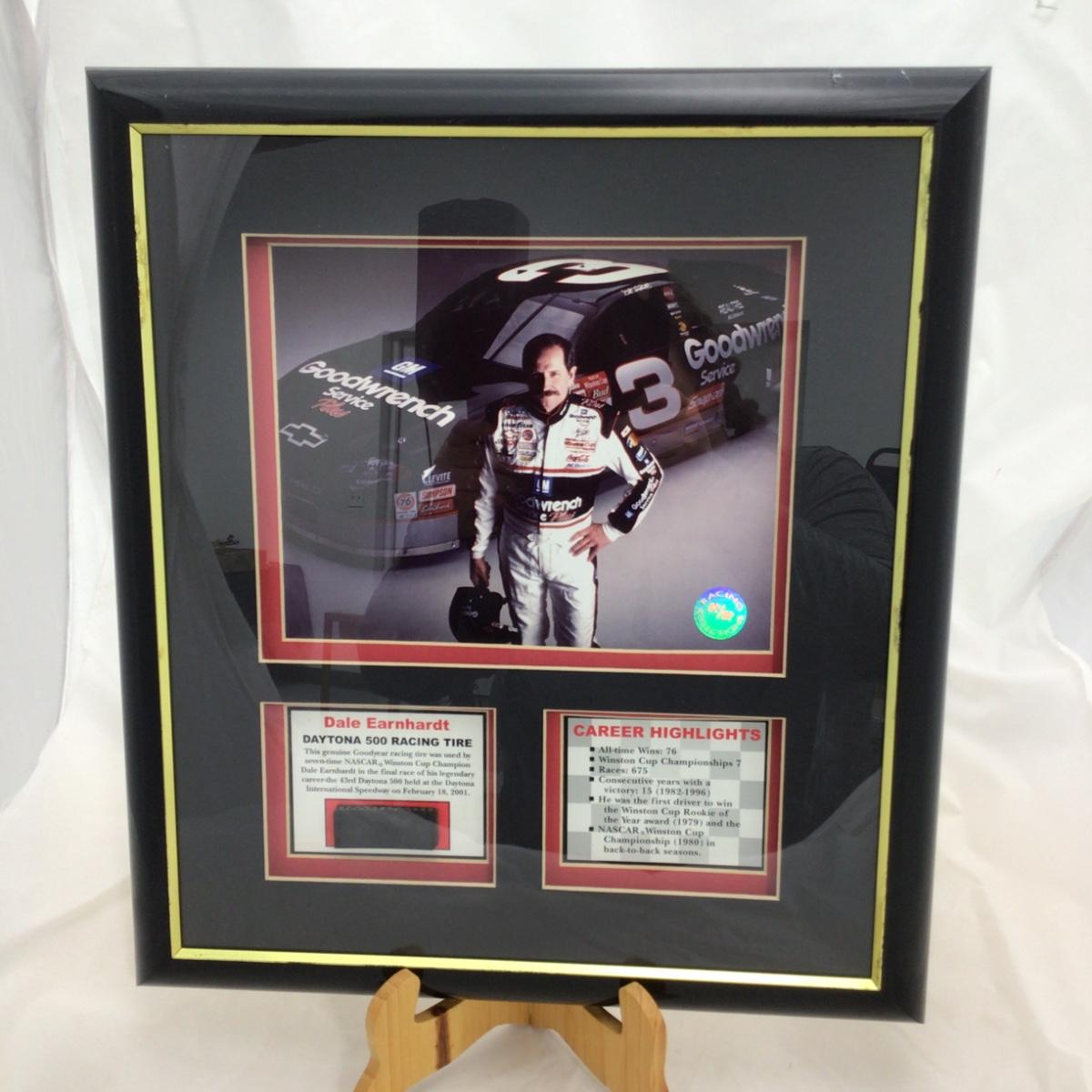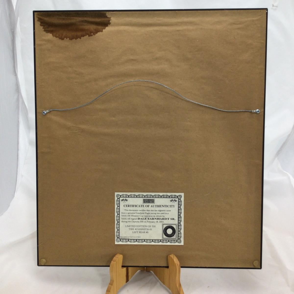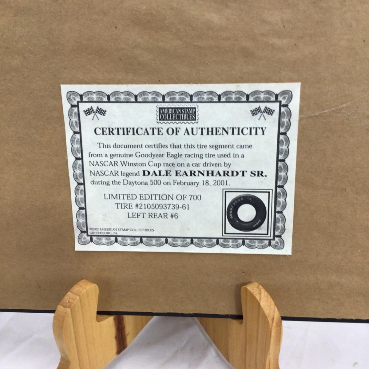 Tire segment from a genuine Goodyear Eagle racing tire used in a NASCAR Winston Cup race on a car driven by Dale Earnhardt Sr. During the Daytona 500 on February 18, 2001 with certificate of authenticity. Some damage pictured. 16 inches by 18 inches. Please see photos for details and condition. ::: Shipping is available on this lot. If you require shipping you must let us know at the close of the auction. We will coordinate with you after the item has been won. Shipping fees will include insurance up to or exceeding the value of all items being mailed. If you have any questions regarding this lot please contact the auctioneer either via this website, by direct email or by phone. PICK UP TIMES and other important information can be found in the TERMS and DESCRIPTION of the auction. Please take a look for pertinent information. Thanks!