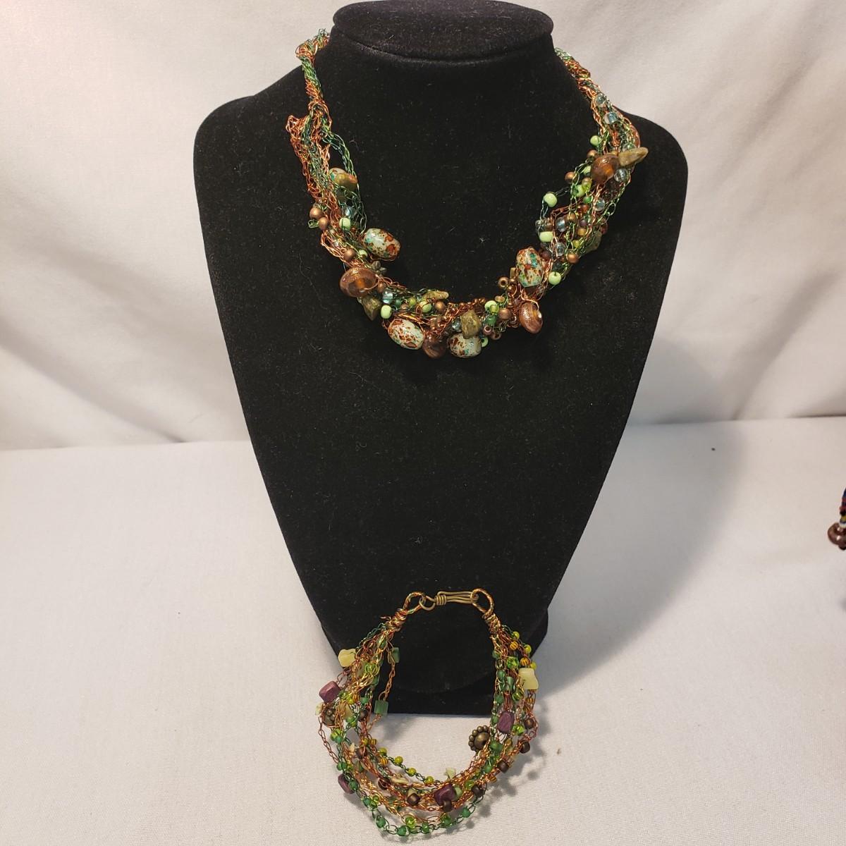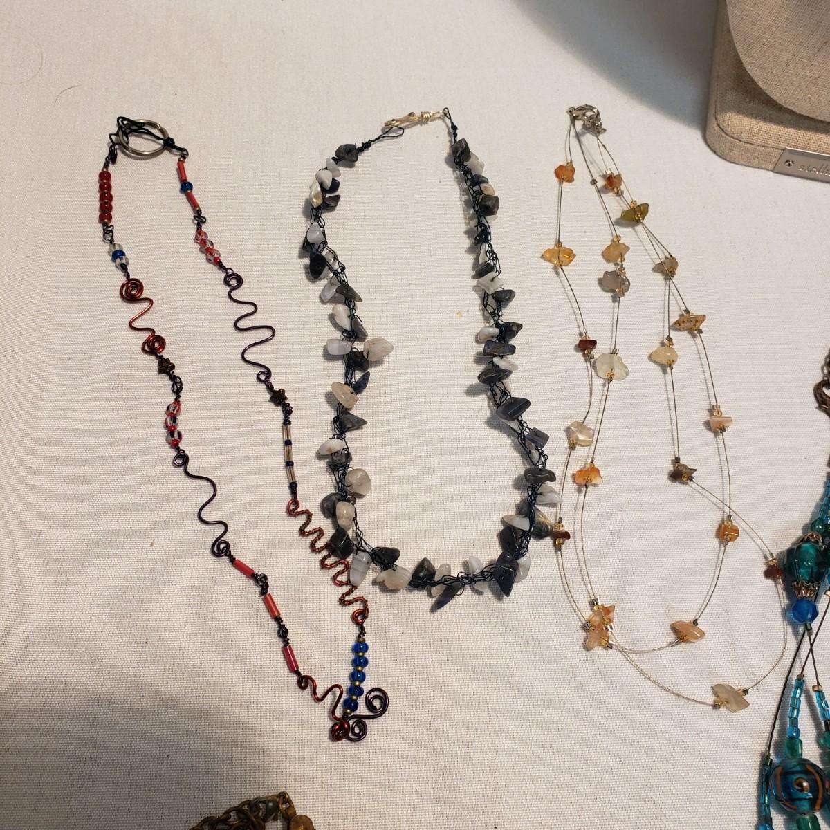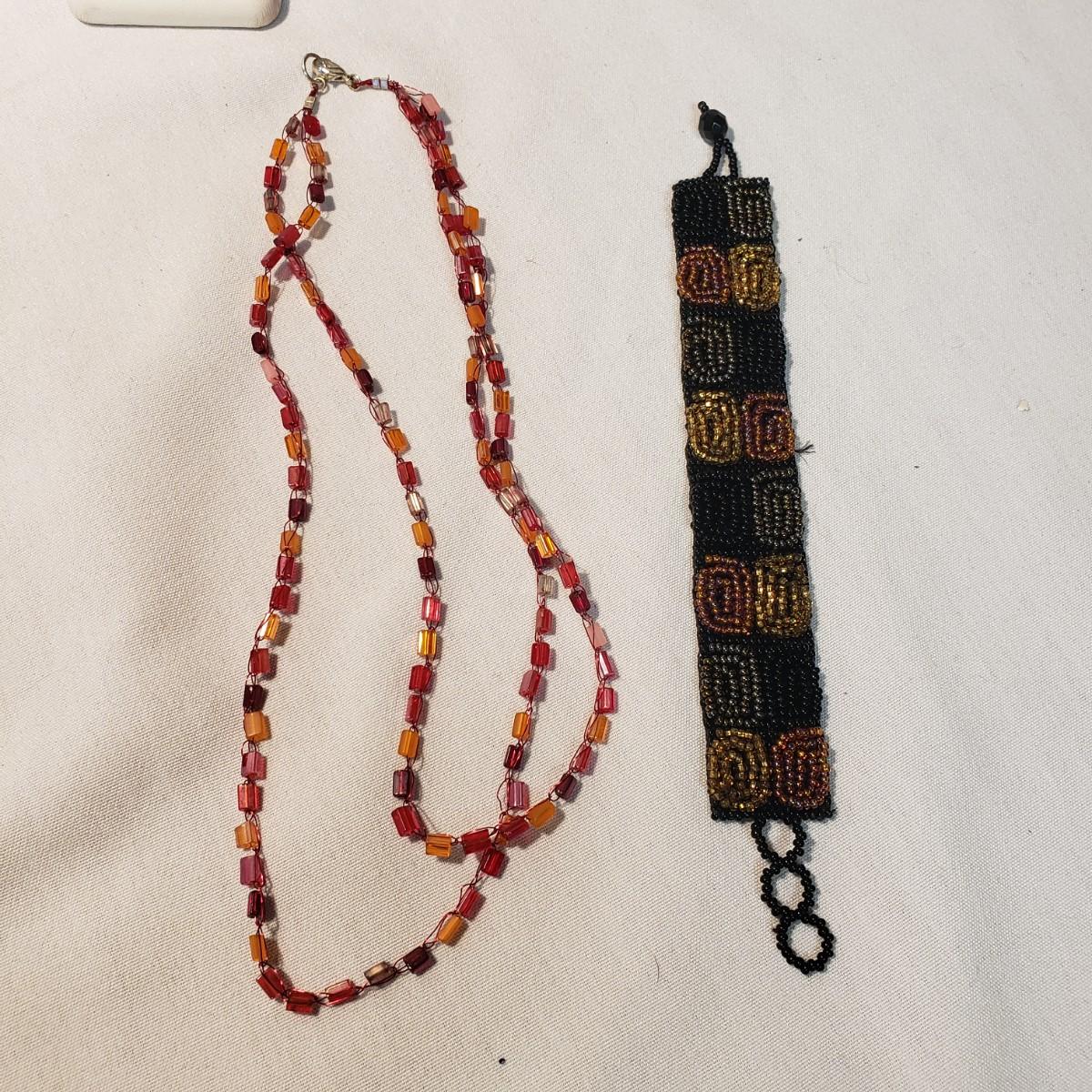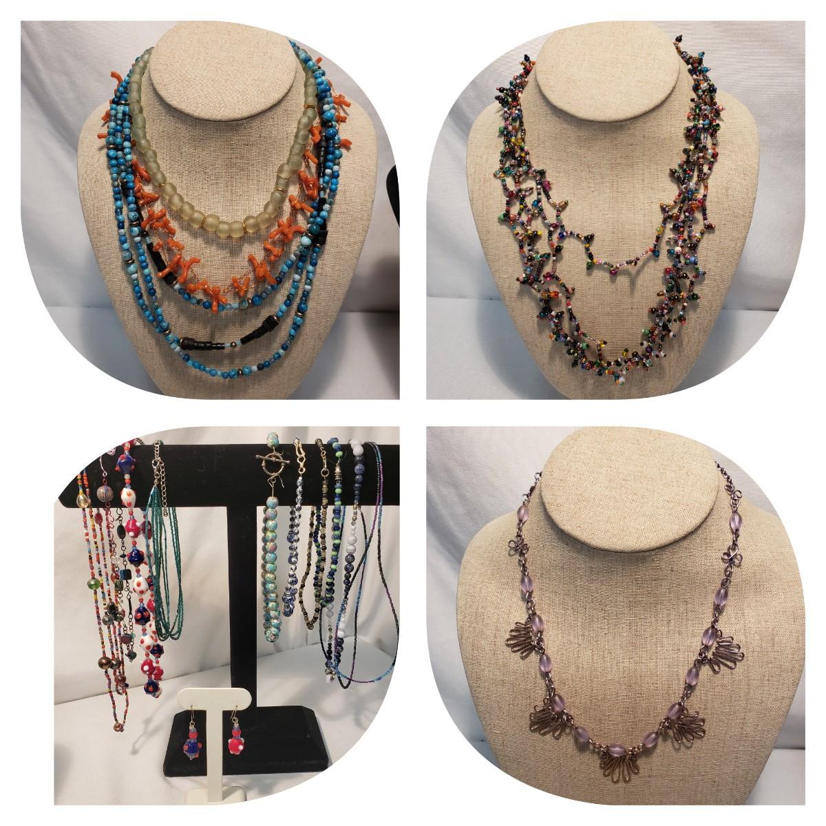 This large lot of beaded necklaces, bracelets and one set of matching earrings are absolutely stunning. There are two sets with matching items, a gold and green colored wire and beads necklace and matching bracelet. The other is a red, white and blue glass beaded necklace with matching earrings. The orange three prong beaded necklace on copper colored wire measures 18".