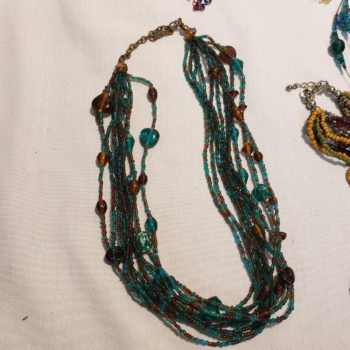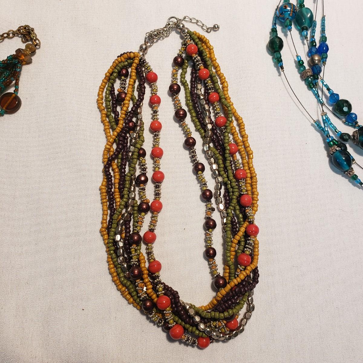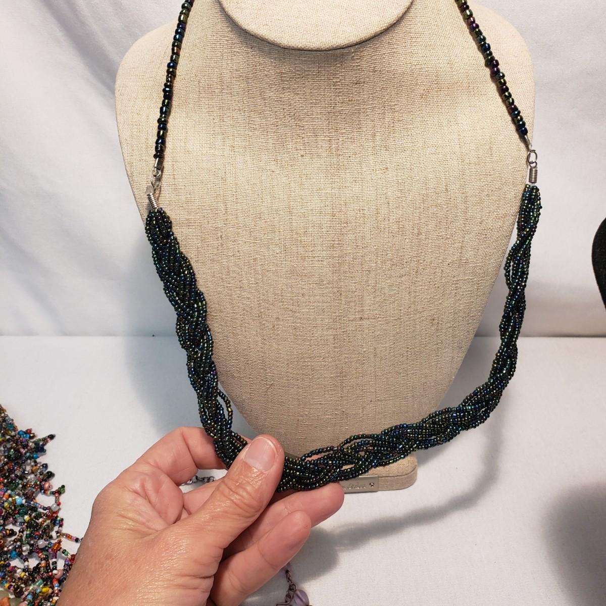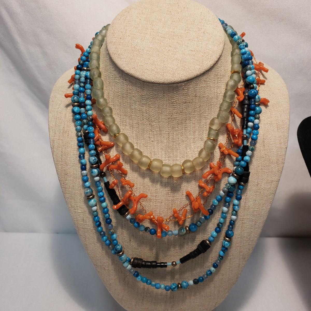 This large lot of beaded necklaces, bracelets and one set of matching earrings are absolutely stunning. There are two sets with matching items, a gold and green colored wire and beads necklace and matching bracelet. The other is a red, white and blue glass beaded necklace with matching earrings. The orange three prong beaded necklace on copper colored wire measures 18".