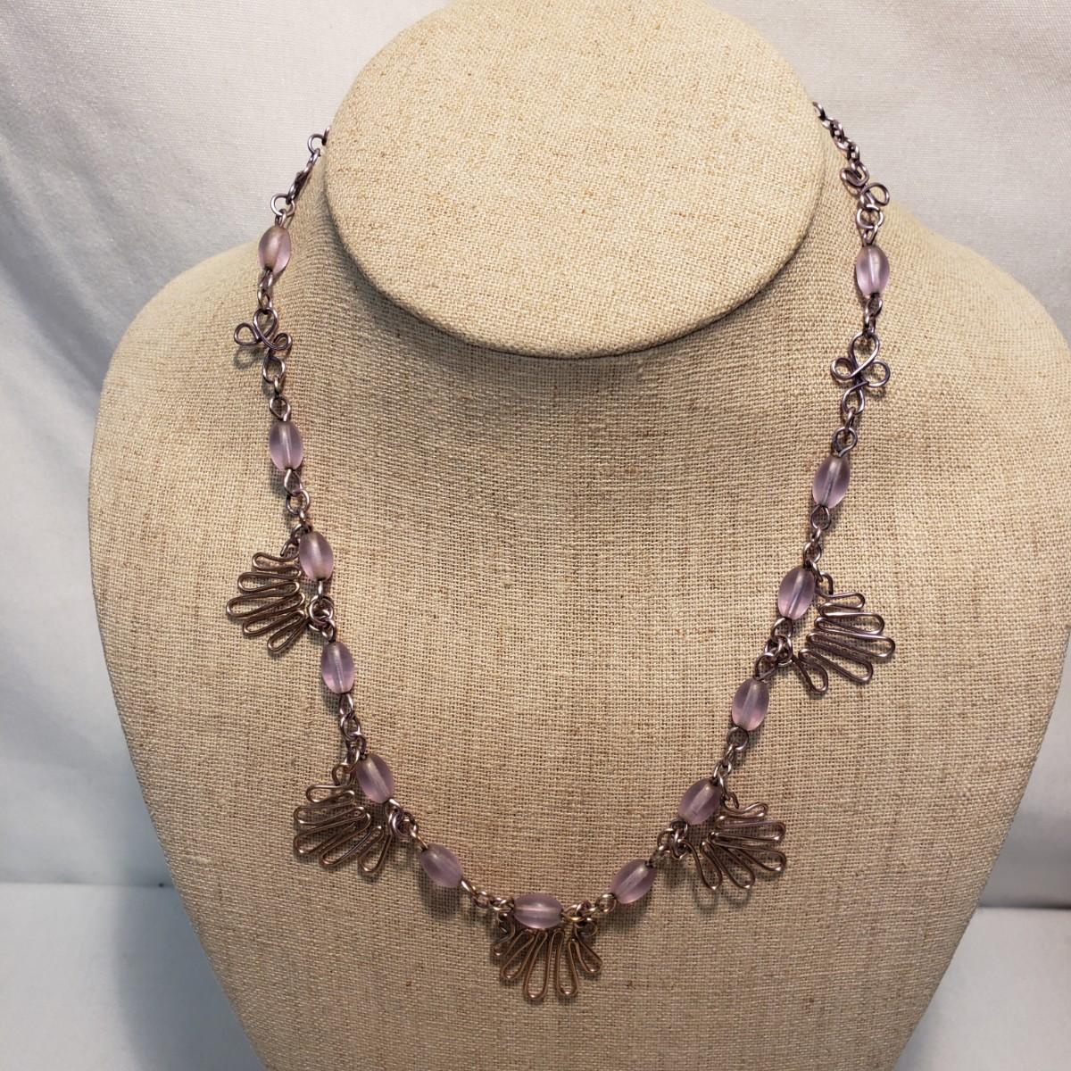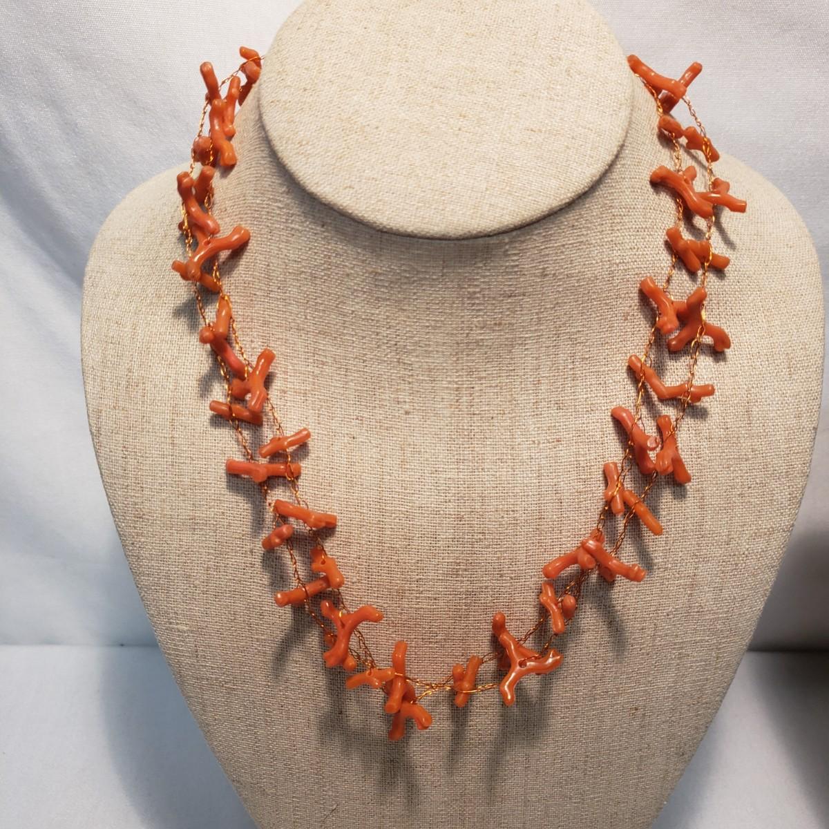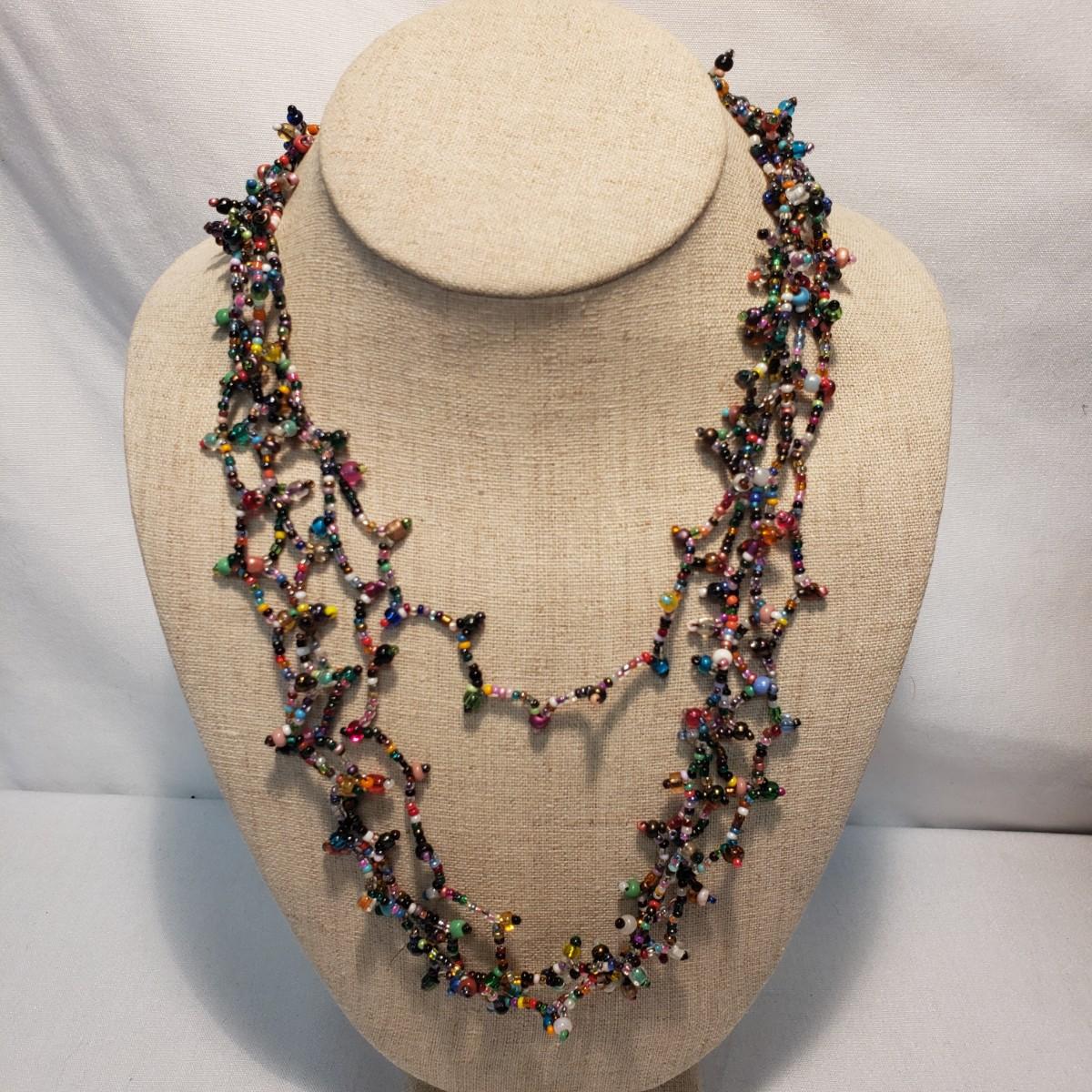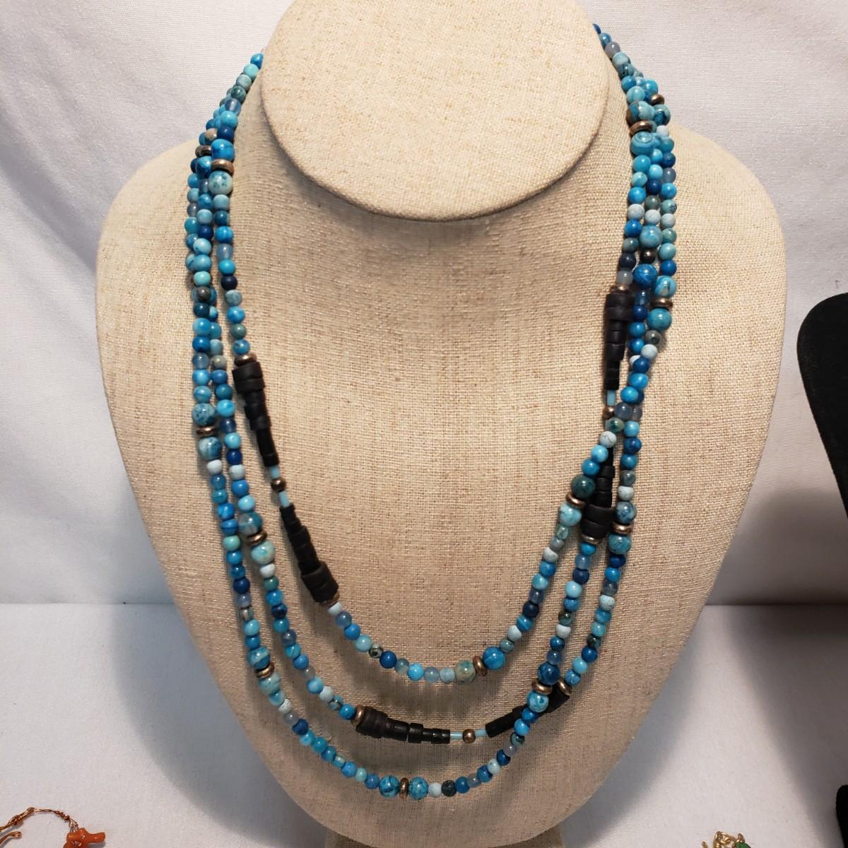 This large lot of beaded necklaces, bracelets and one set of matching earrings are absolutely stunning. There are two sets with matching items, a gold and green colored wire and beads necklace and matching bracelet. The other is a red, white and blue glass beaded necklace with matching earrings. The orange three prong beaded necklace on copper colored wire measures 18".