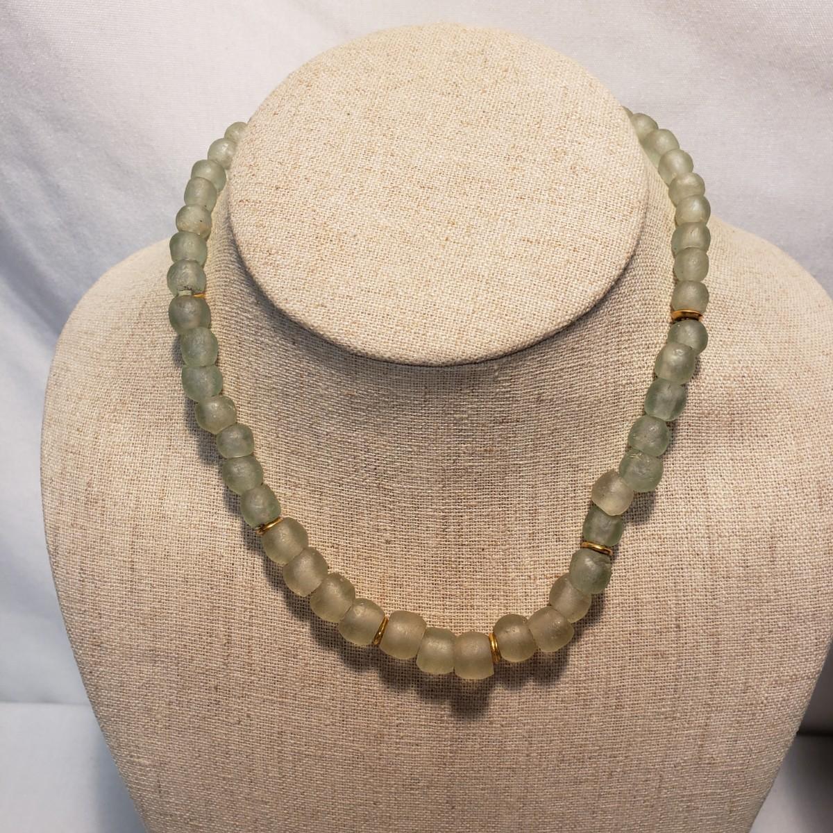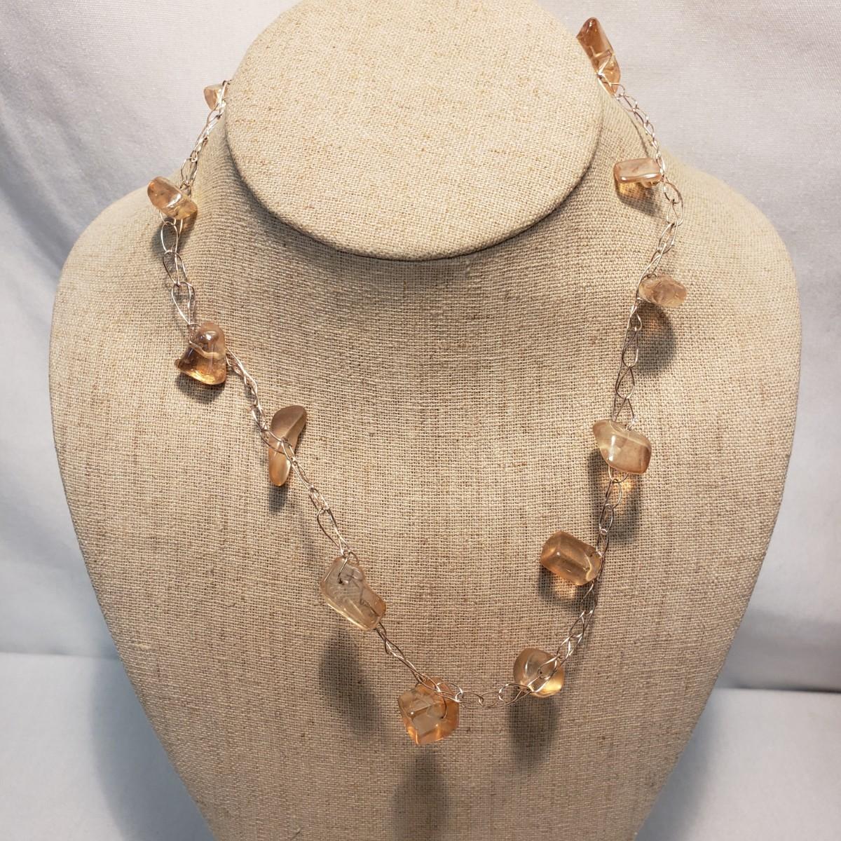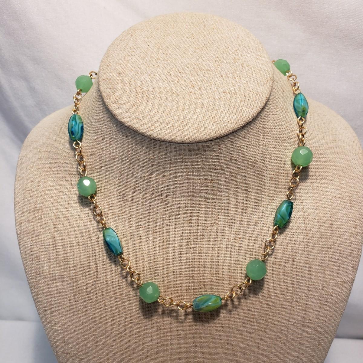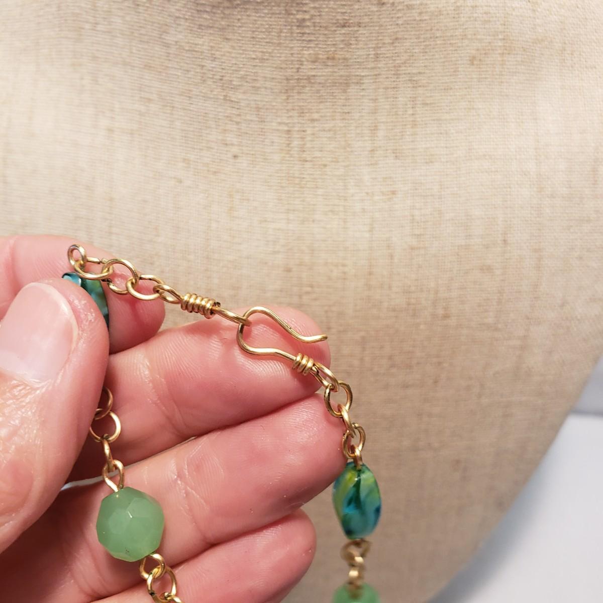 This large lot of beaded necklaces, bracelets and one set of matching earrings are absolutely stunning. There are two sets with matching items, a gold and green colored wire and beads necklace and matching bracelet. The other is a red, white and blue glass beaded necklace with matching earrings. The orange three prong beaded necklace on copper colored wire measures 18".
