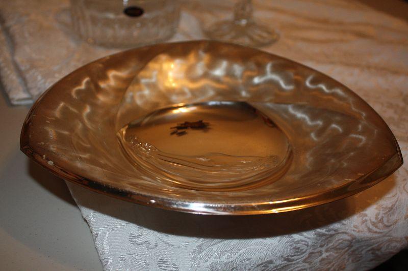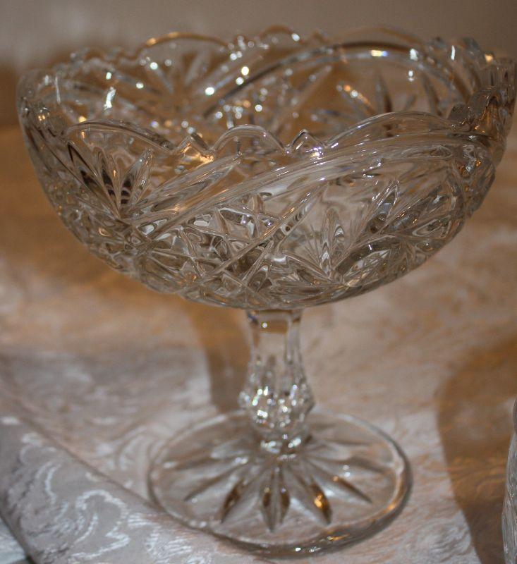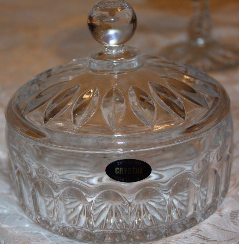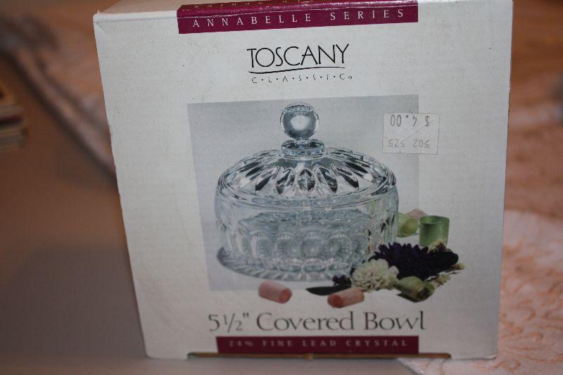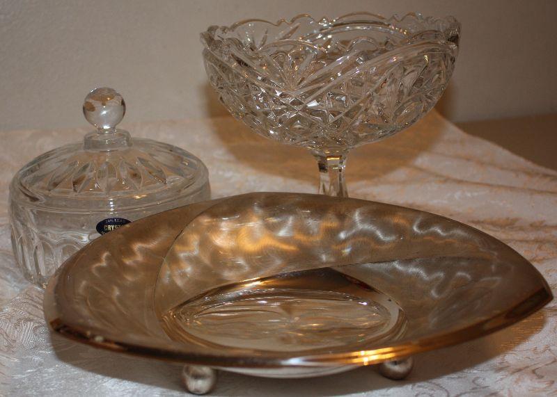 A new in the box Toscany 24% fine lead Crystal 5 1/2" covered bowl; A pedestal Bowl 7" high x 7" wide; A metal polished dish 10 1/2" wide with 3 ball style feet