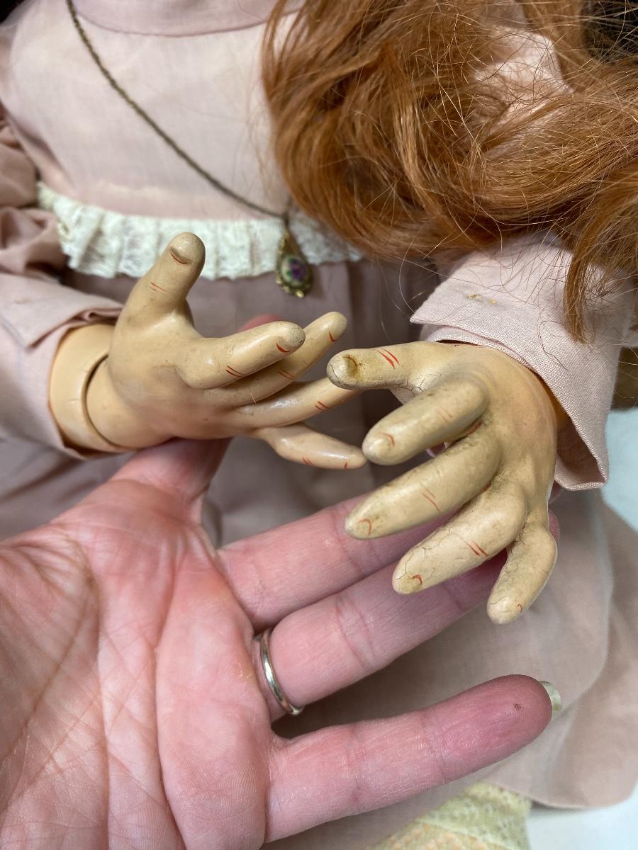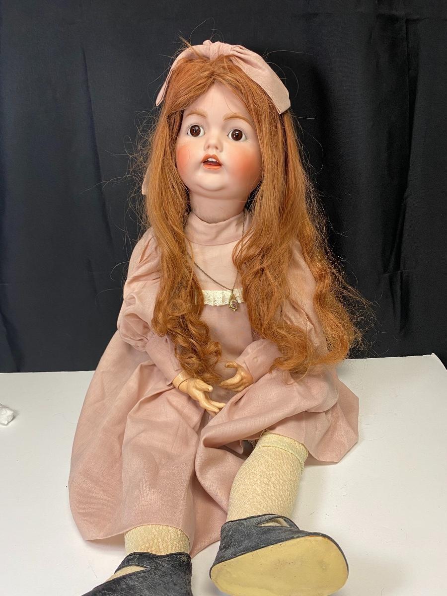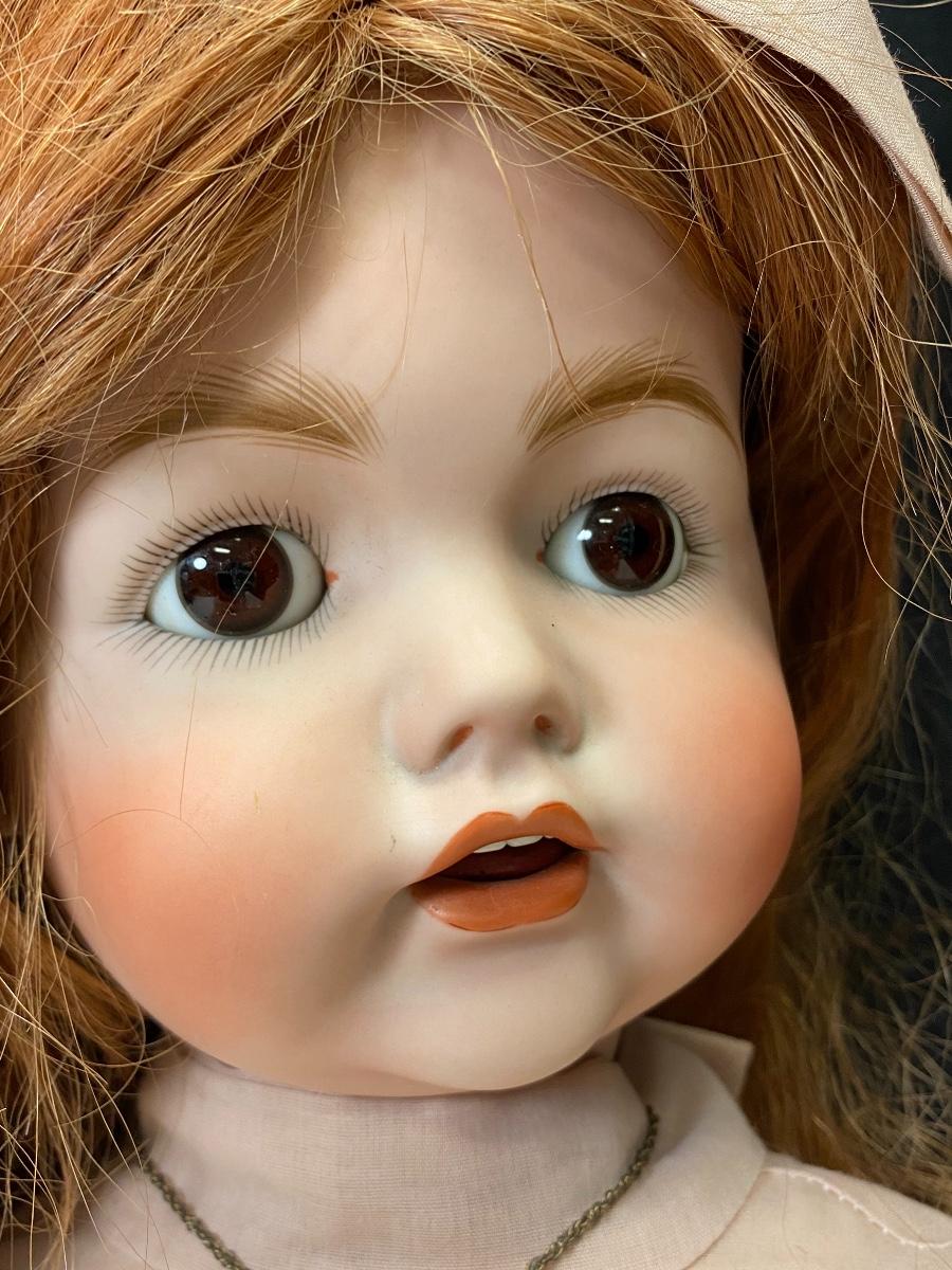 arge 29" Linda V Cheek reproduction doll. Bisque head with a composite jointed body. Long red hair with dark brown eyes. Head is a JDK 257 mold. Body has wear and knees have been poorly repaired, pins are sticking out. Signed and dated 1979.
