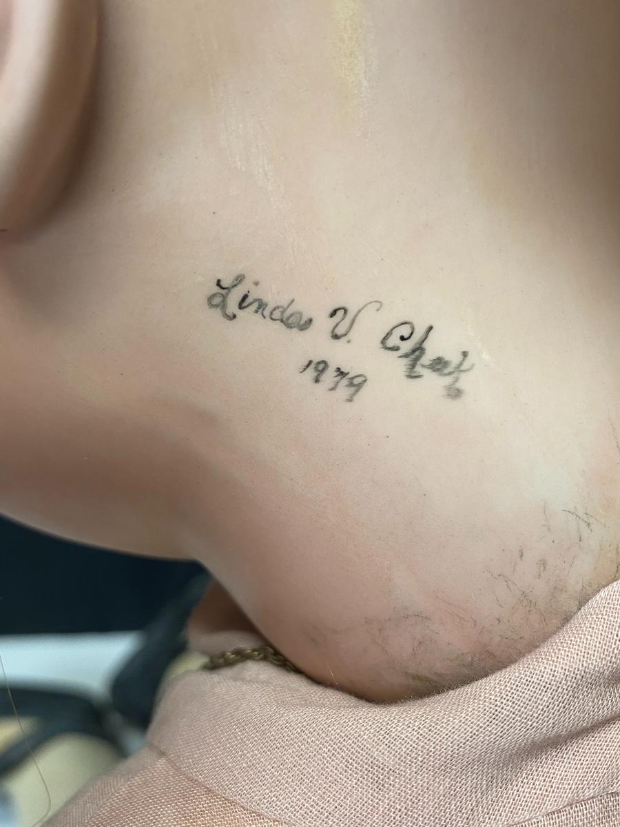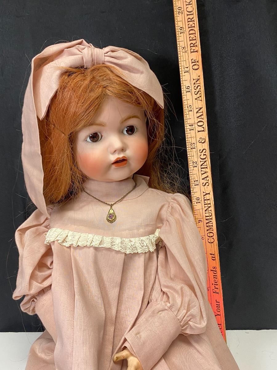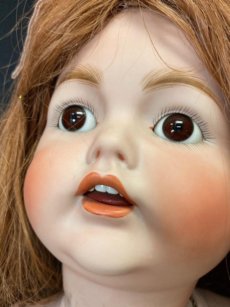 arge 29" Linda V Cheek reproduction doll. Bisque head with a composite jointed body. Long red hair with dark brown eyes. Head is a JDK 257 mold. Body has wear and knees have been poorly repaired, pins are sticking out. Signed and dated 1979.