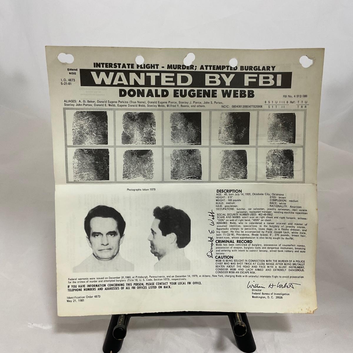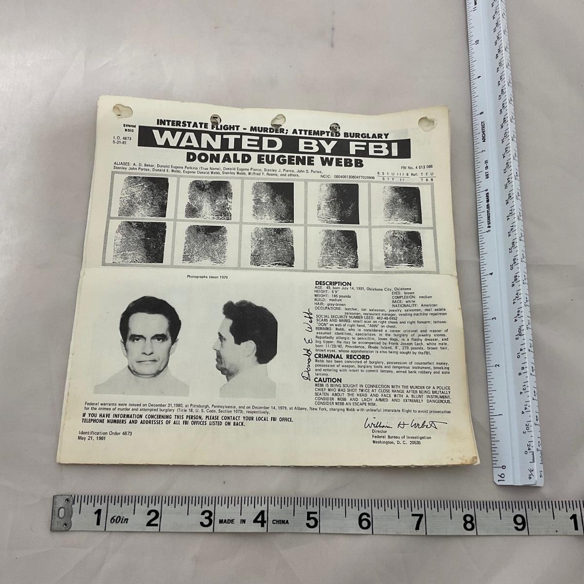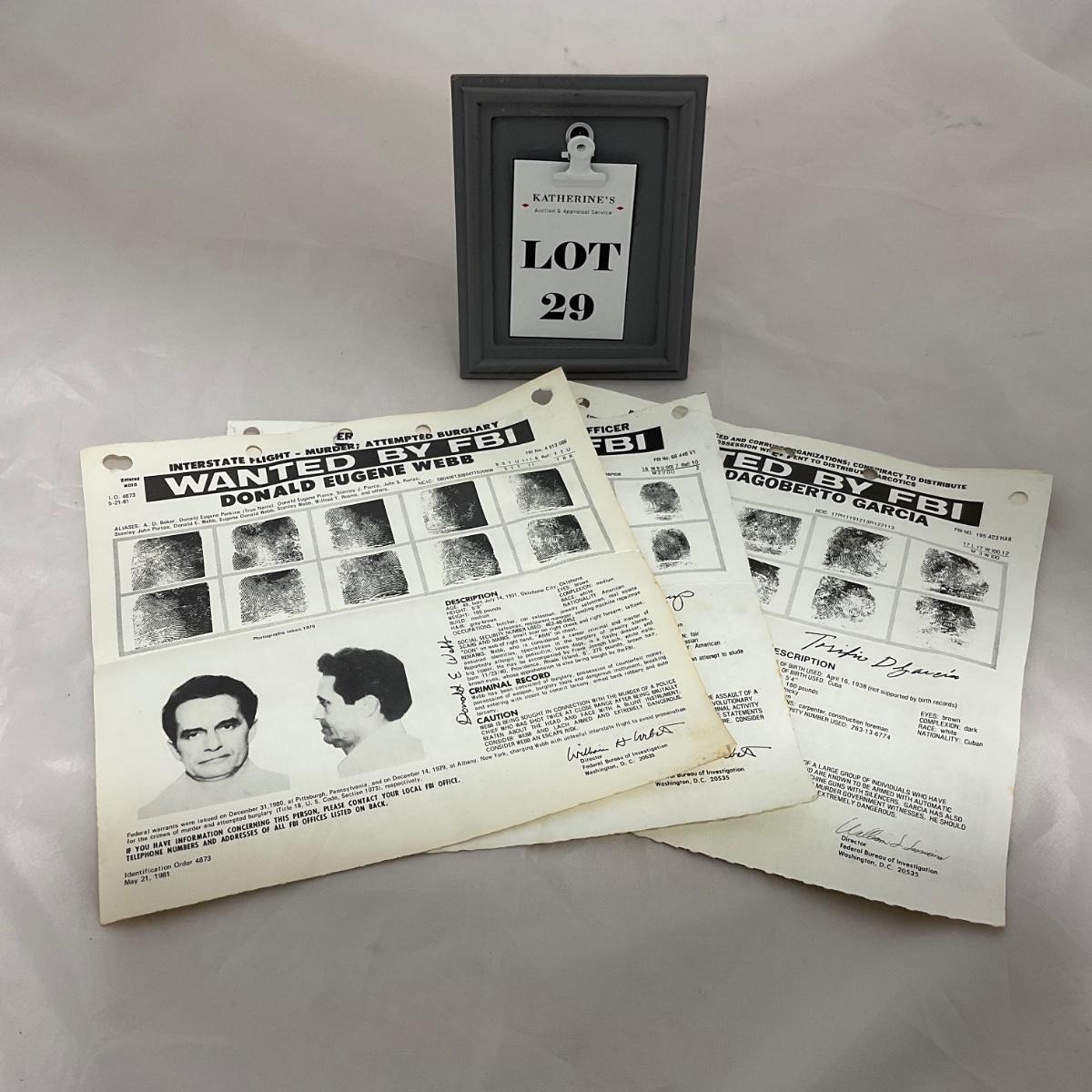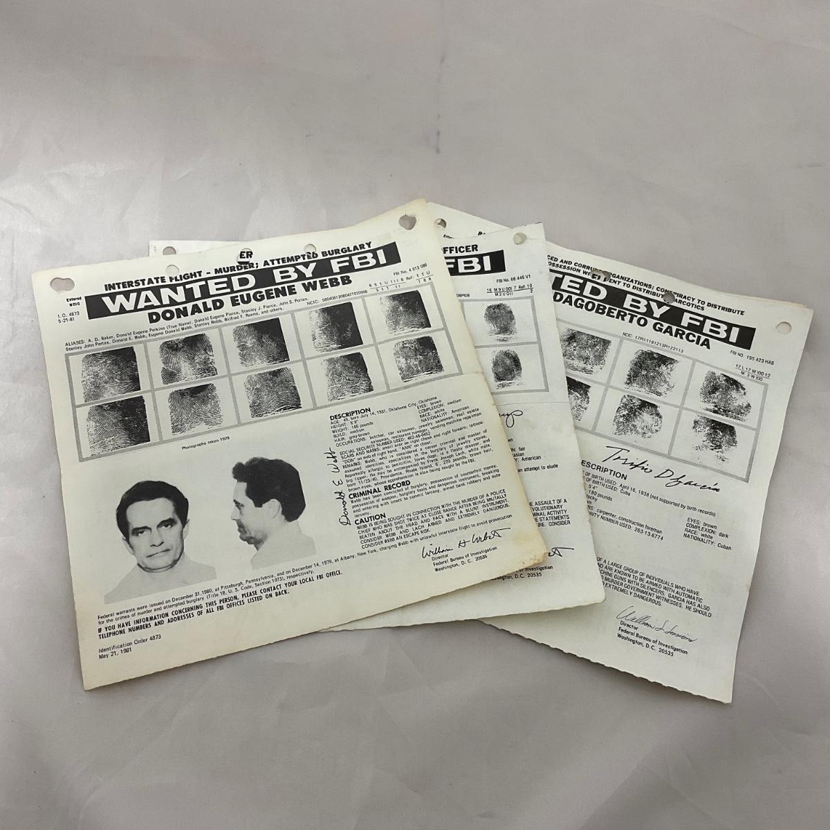 Four vintage small FBI wanted posters. Please see photos for details and condition. ::: Shipping is available on this lot. If you require shipping you must let us know at the close of the auction. We will coordinate with you after the item has been won. Shipping fees will include insurance up to or exceeding the value of all items being mailed. If you have any questions regarding this lot please contact the auctioneer either via this website, by direct email or by phone. PICK UP TIMES and other important information can be found in the TERMS and DESCRIPTION of the auction. Please take a look for pertinent information. Thanks!