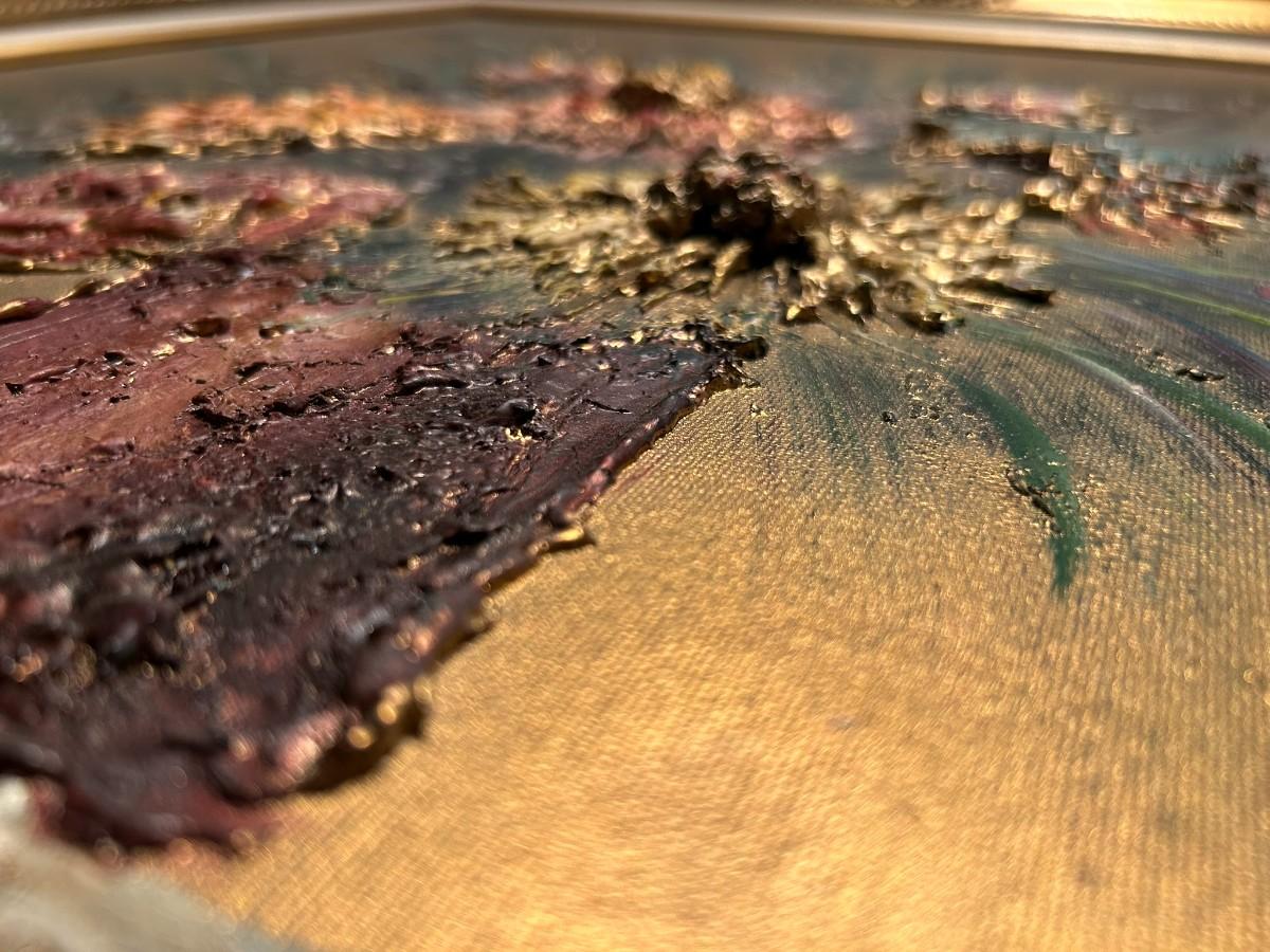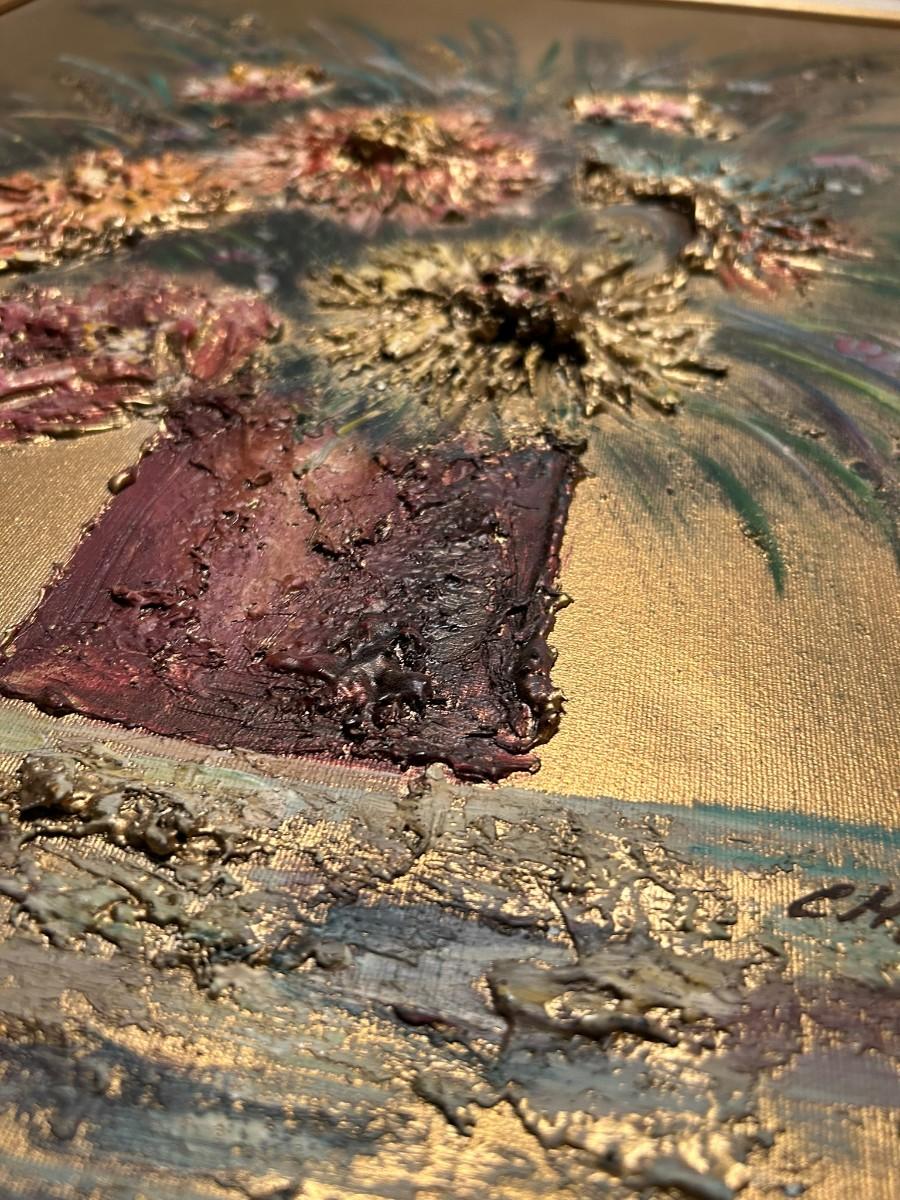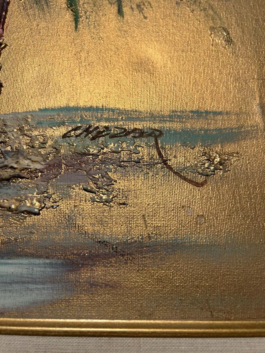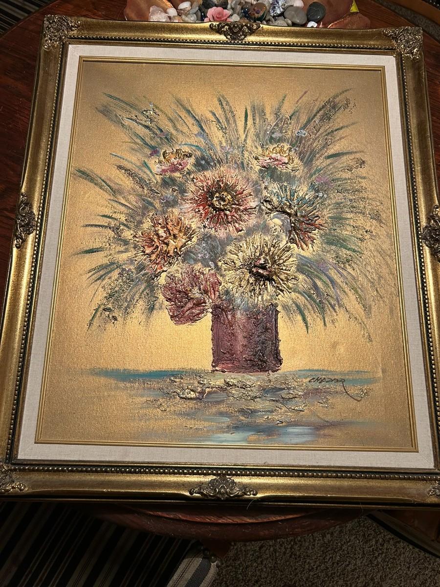 The depth on the oil of this painting is what makes it really unique. I personlly like the colrs as well. With the gold back ground and gold frame it could easly fit in to a Hollywood Regency Style Decor. Many art pieces at ths home. If you are picking up you are welcome to shop the sale as well.