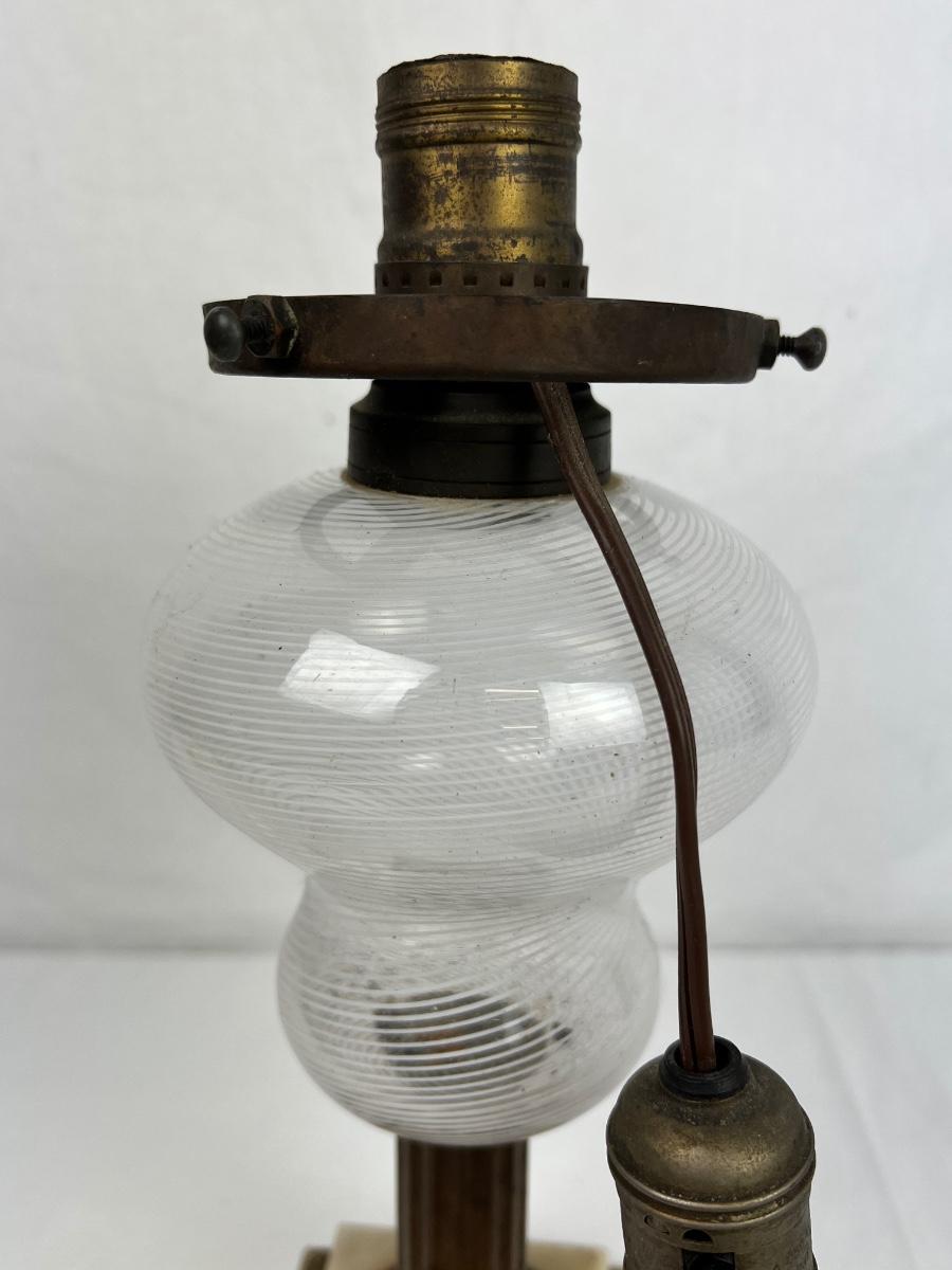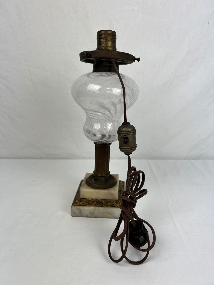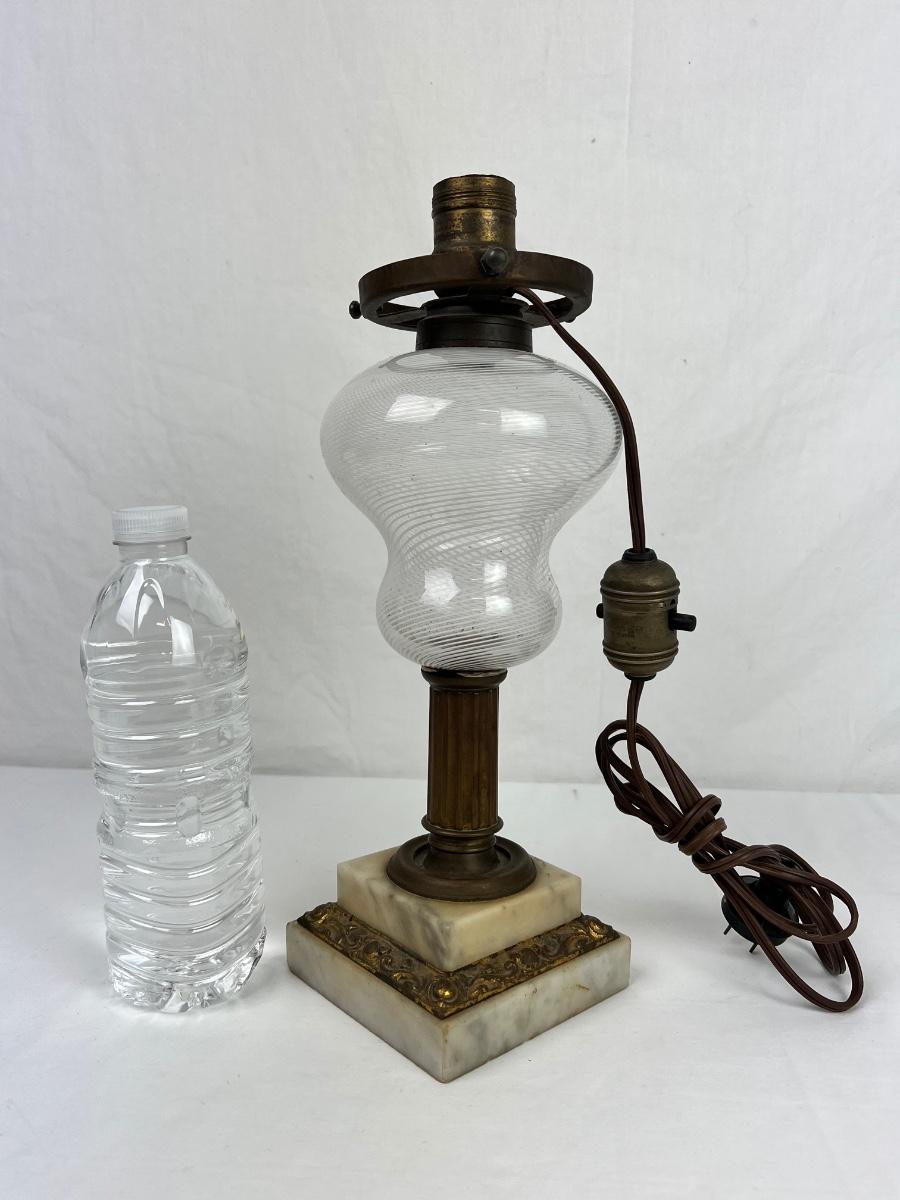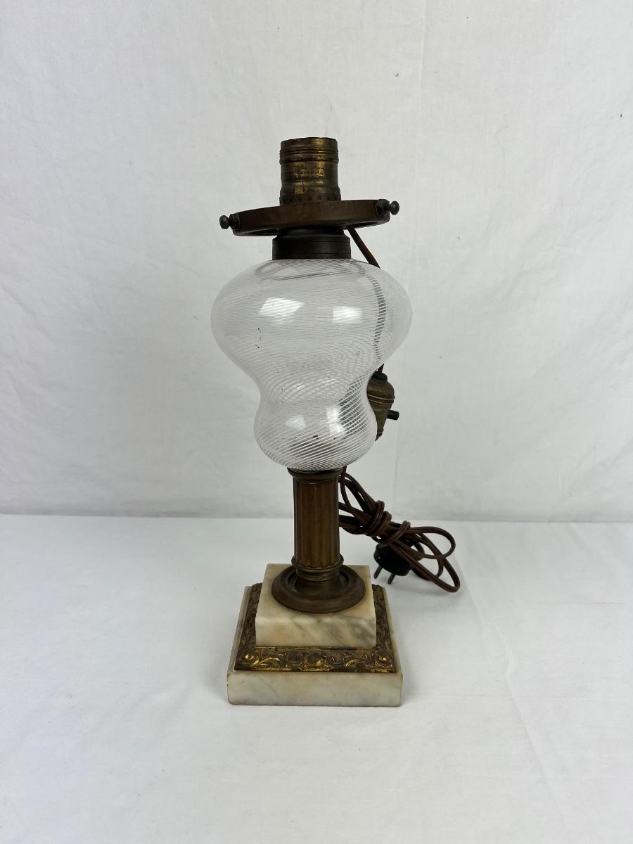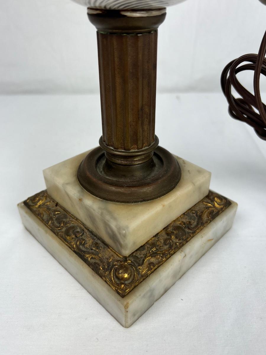 Antique marble base, with white swirled glass, this lamp used to be an oil lamp that was converted into an electrical lamp. Measuring 13” tall with no shade