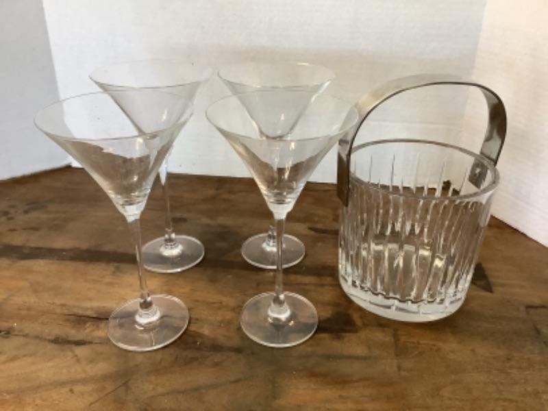 Set of four Lenox Tuscany Classics Martini Glasses and a glass ice bucket with silver tone handle.