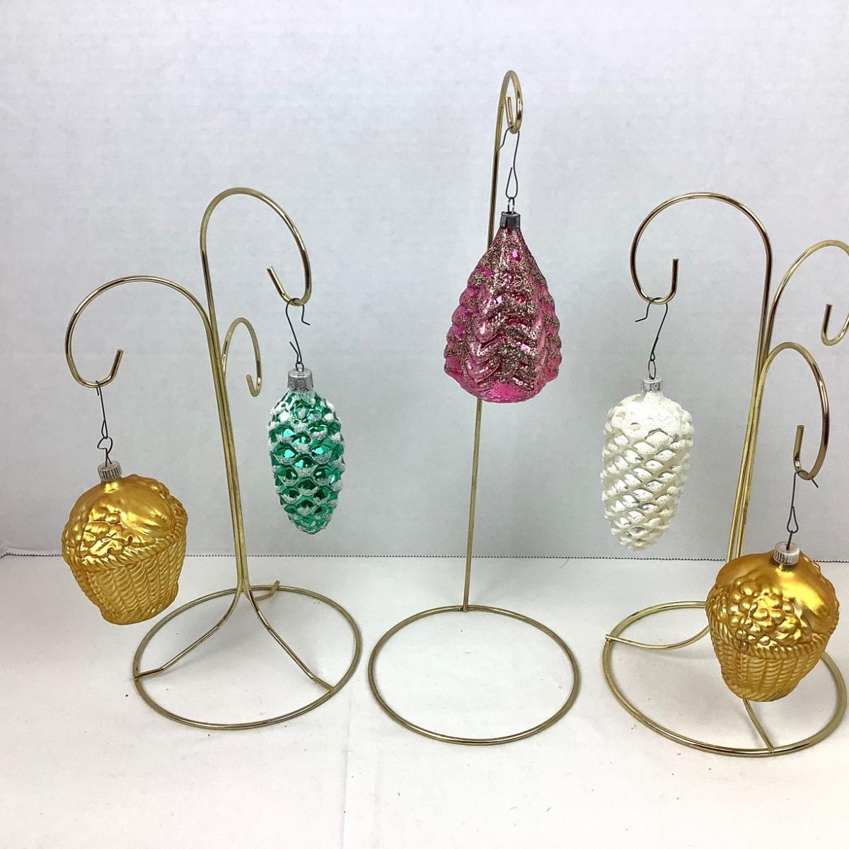 The bells are 3" x 2.5" and there are 6 of them with scenes from Little Red Riding Hood on them, there are 5 ball ornaments that are 2" in diameter.
