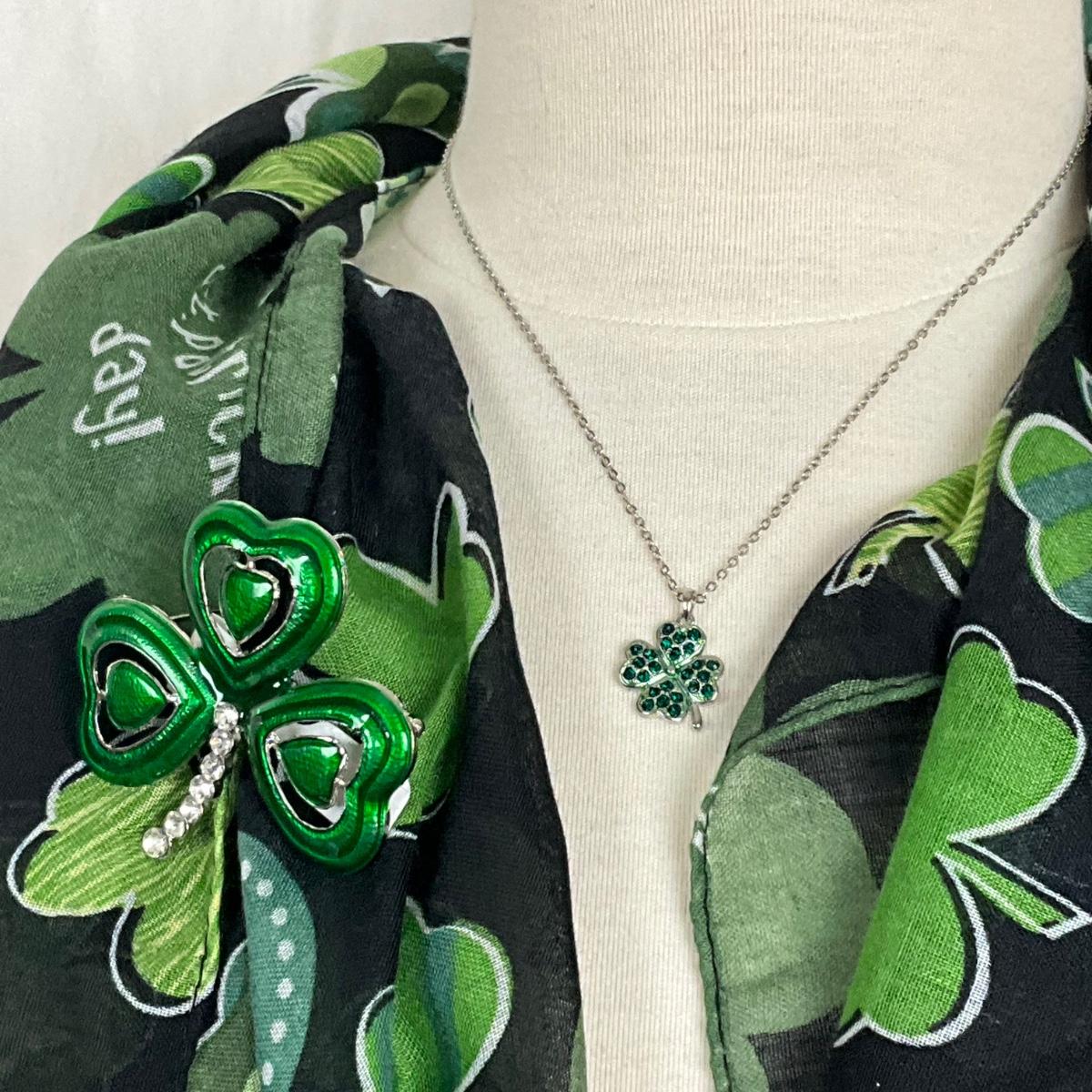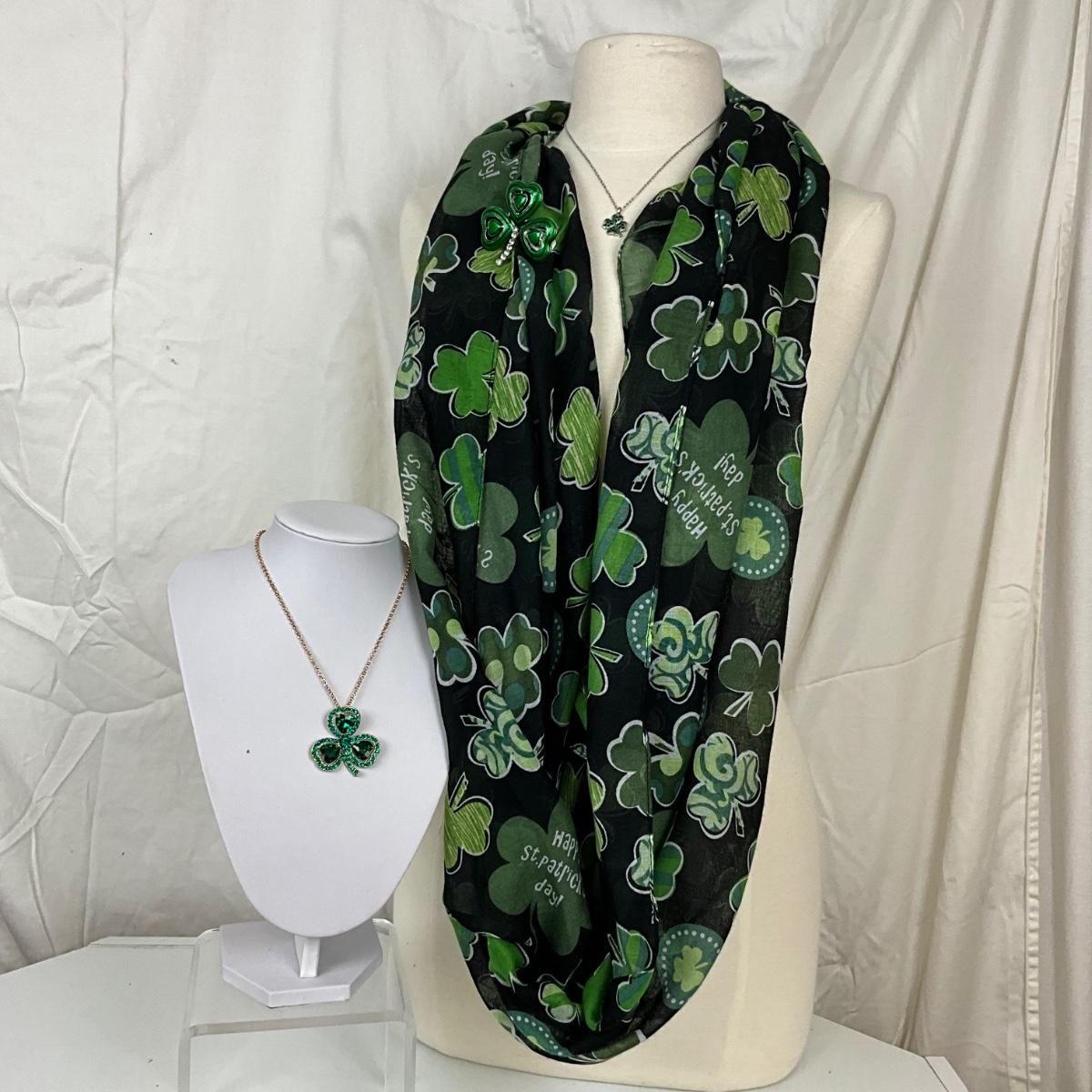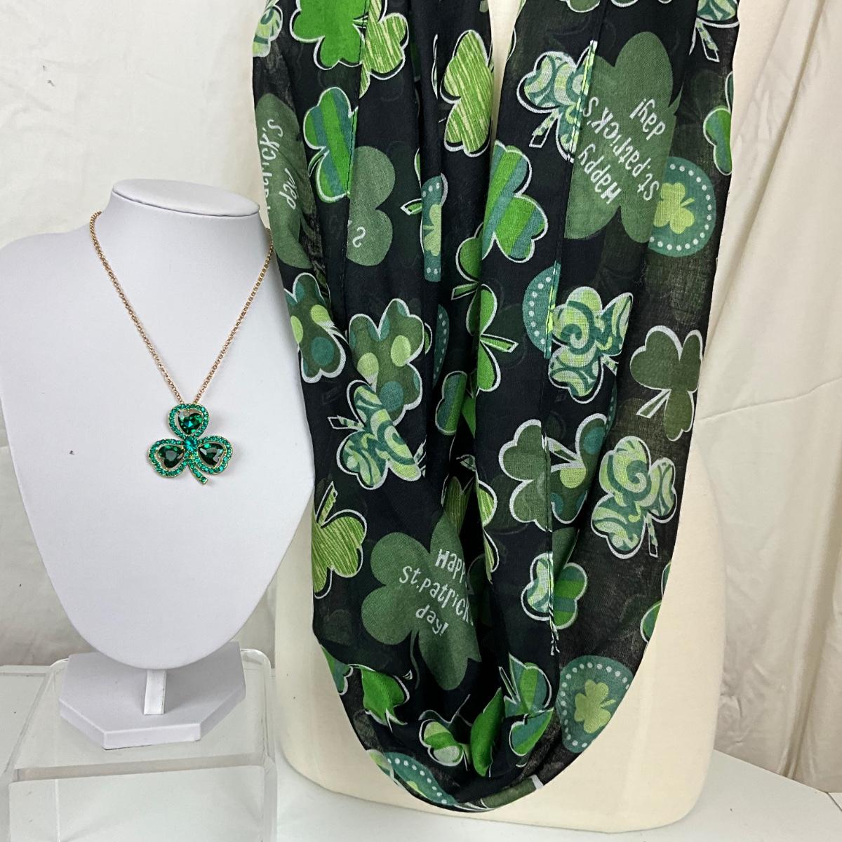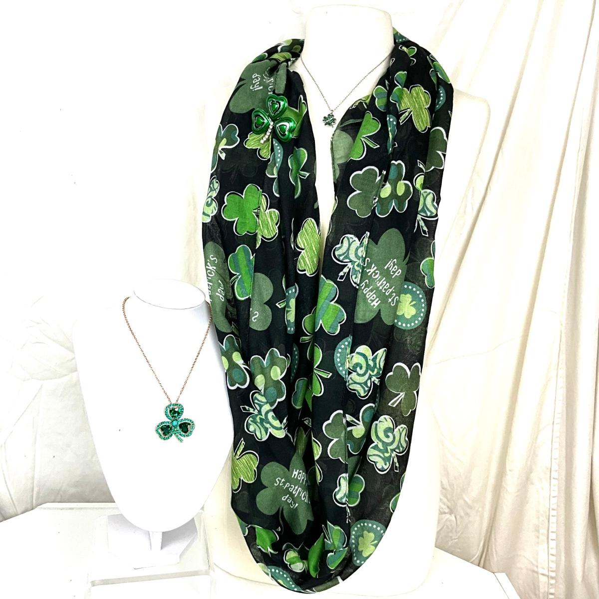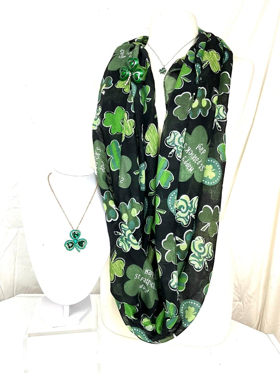 291 Black Green Shamrock Infinity Scarf with Rhinestone Shamrock Necklace, Brooch