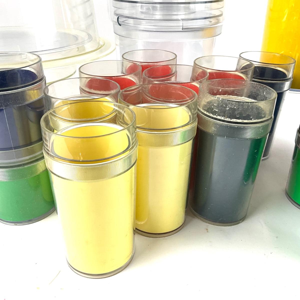 Large collection of plastic ware including 4 mugs , one cake cover, ice bucket, pitcher, 9 tall tumblers, 10 small tumblers