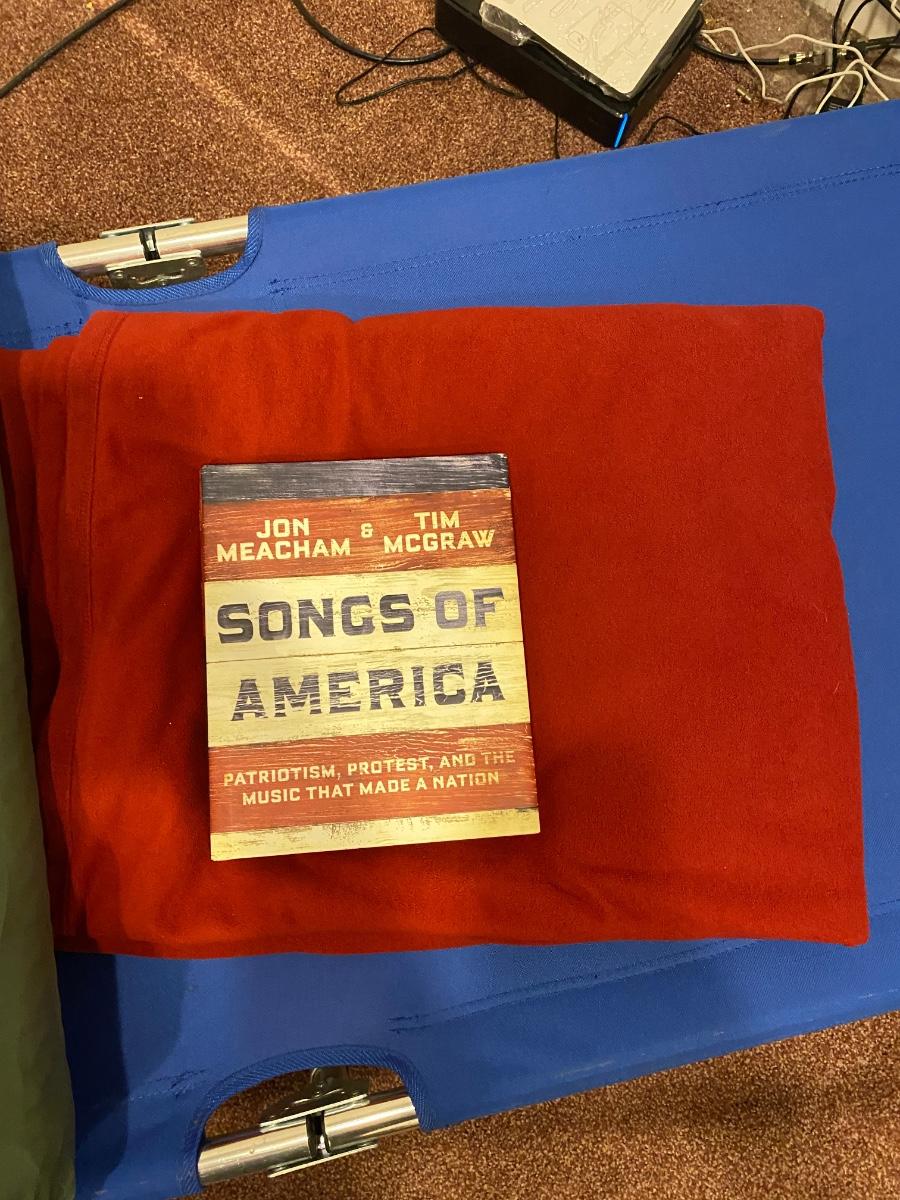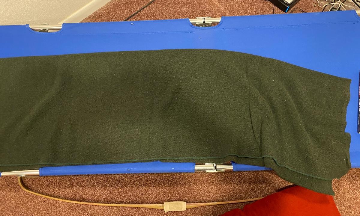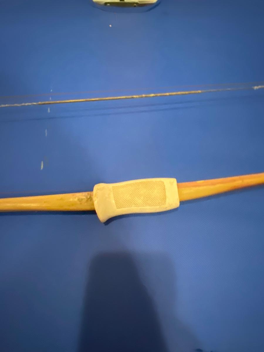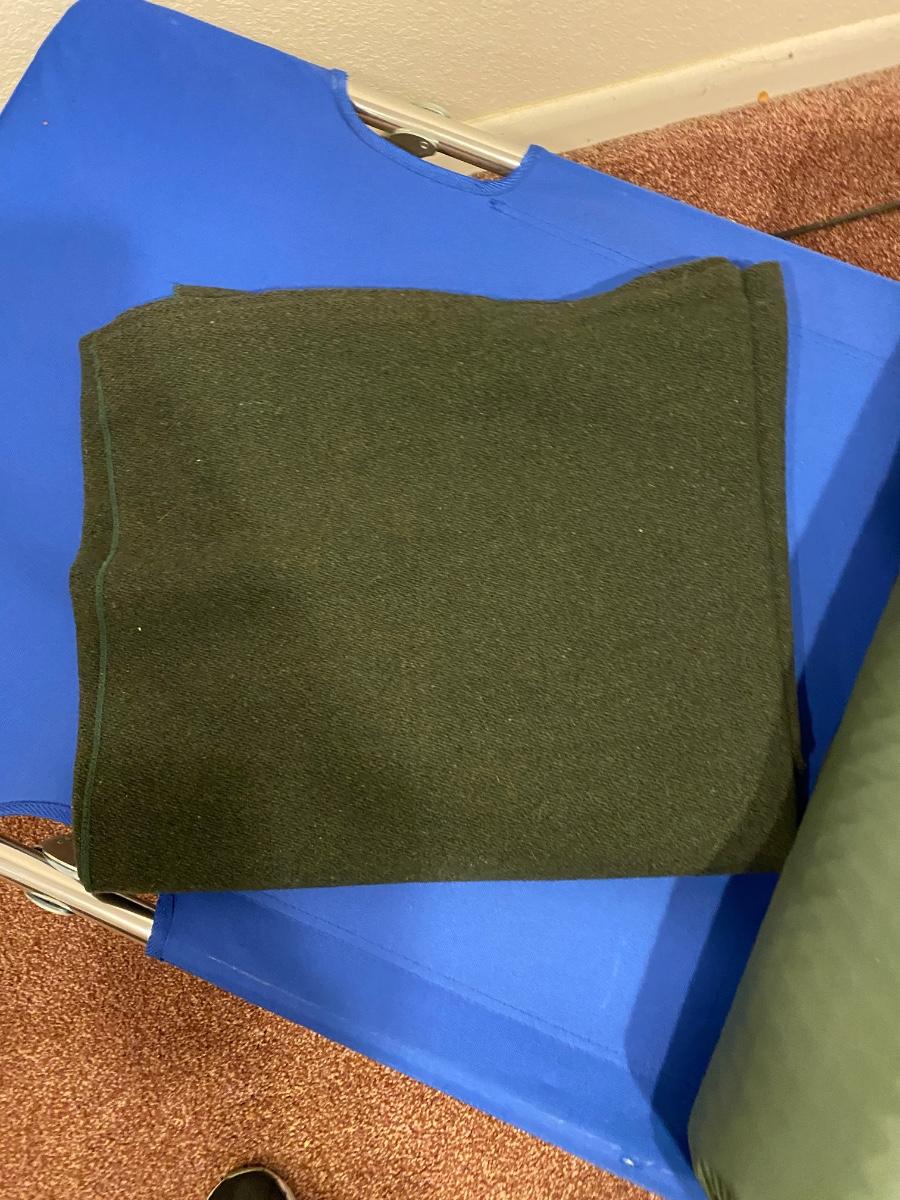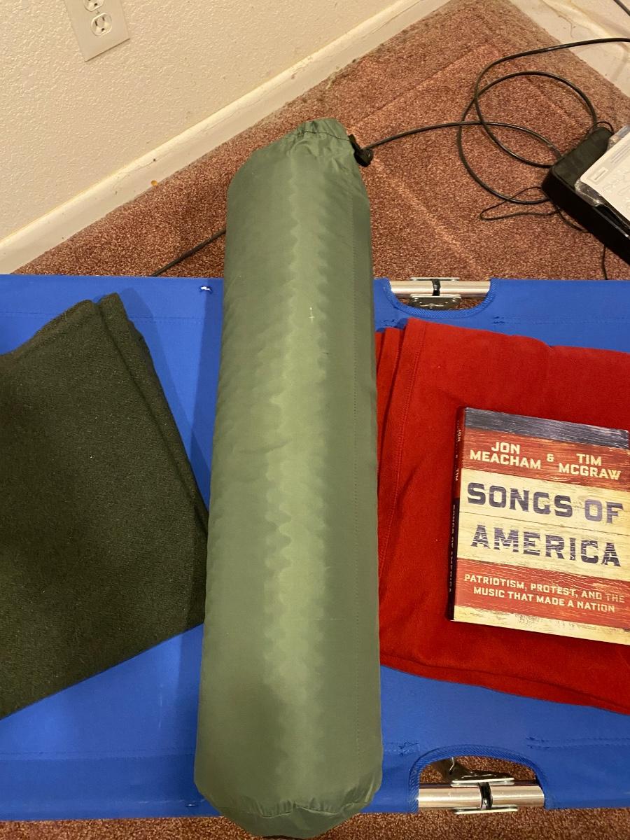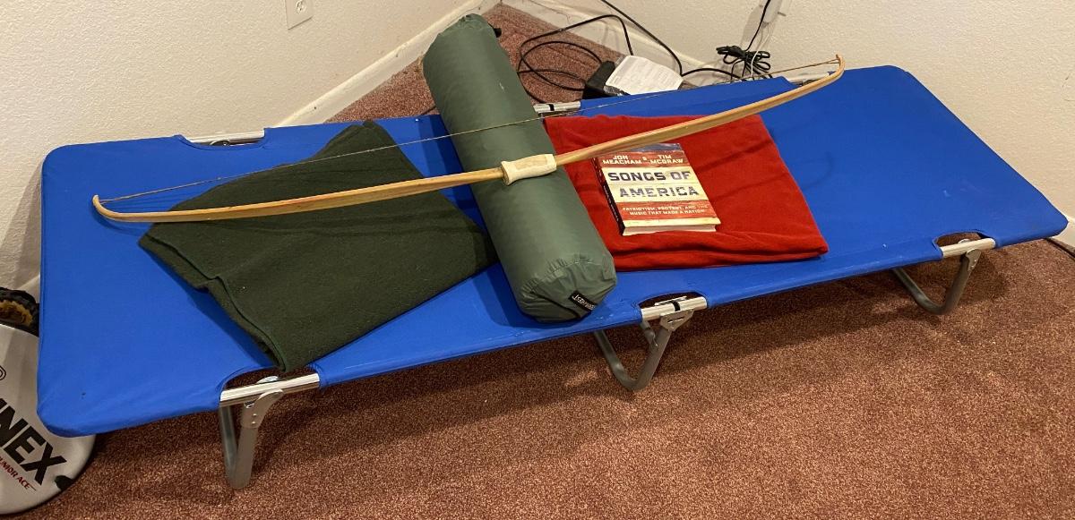 BOW, SLEEPING COT, WOOL BLANKET, FLEECE BLANKET, INFLATABLE SLEEPING PAD, AND A SONG BOOK FOR SINGING WHILE YOU CAMP!