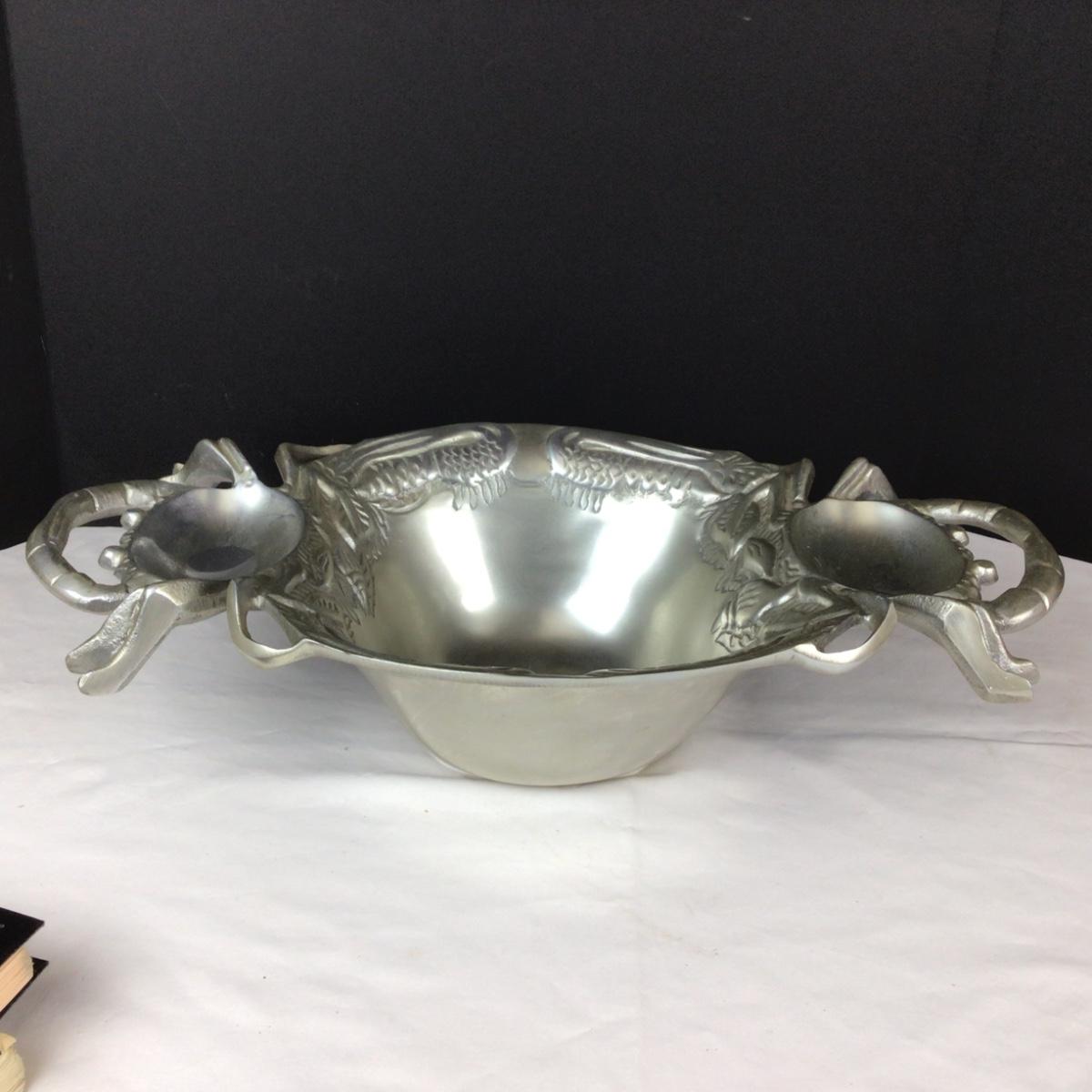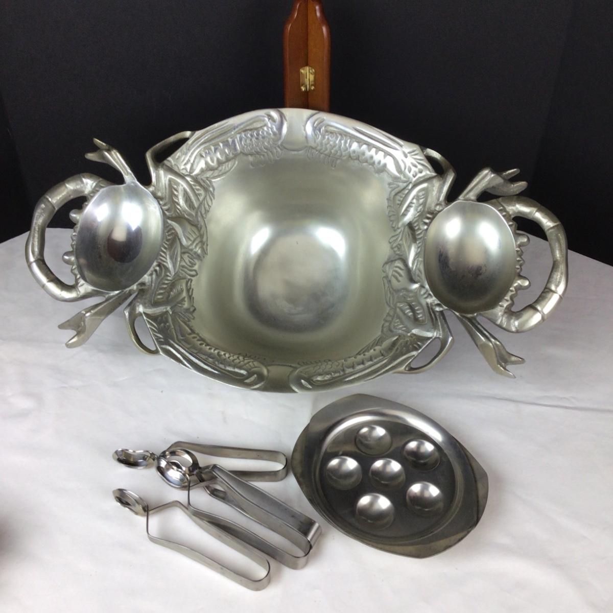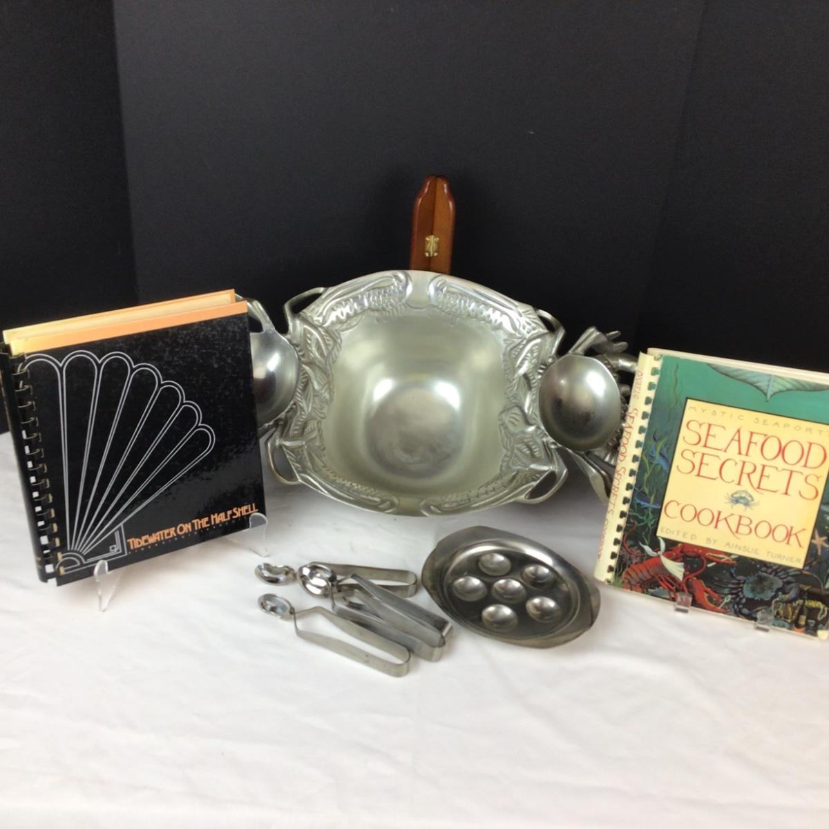 Lot contains 2 cookbooks, 4 escargot plates with tongs, large silver tone serving bowl with crabs on each side and it measures 20” x 11” x 5”.