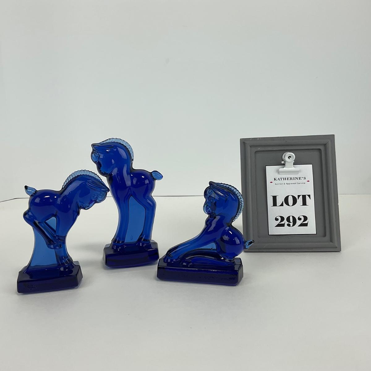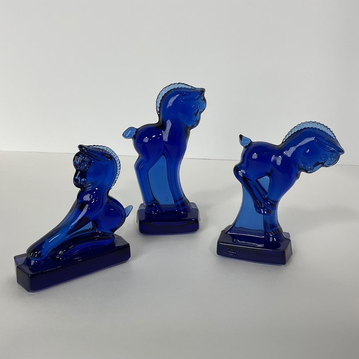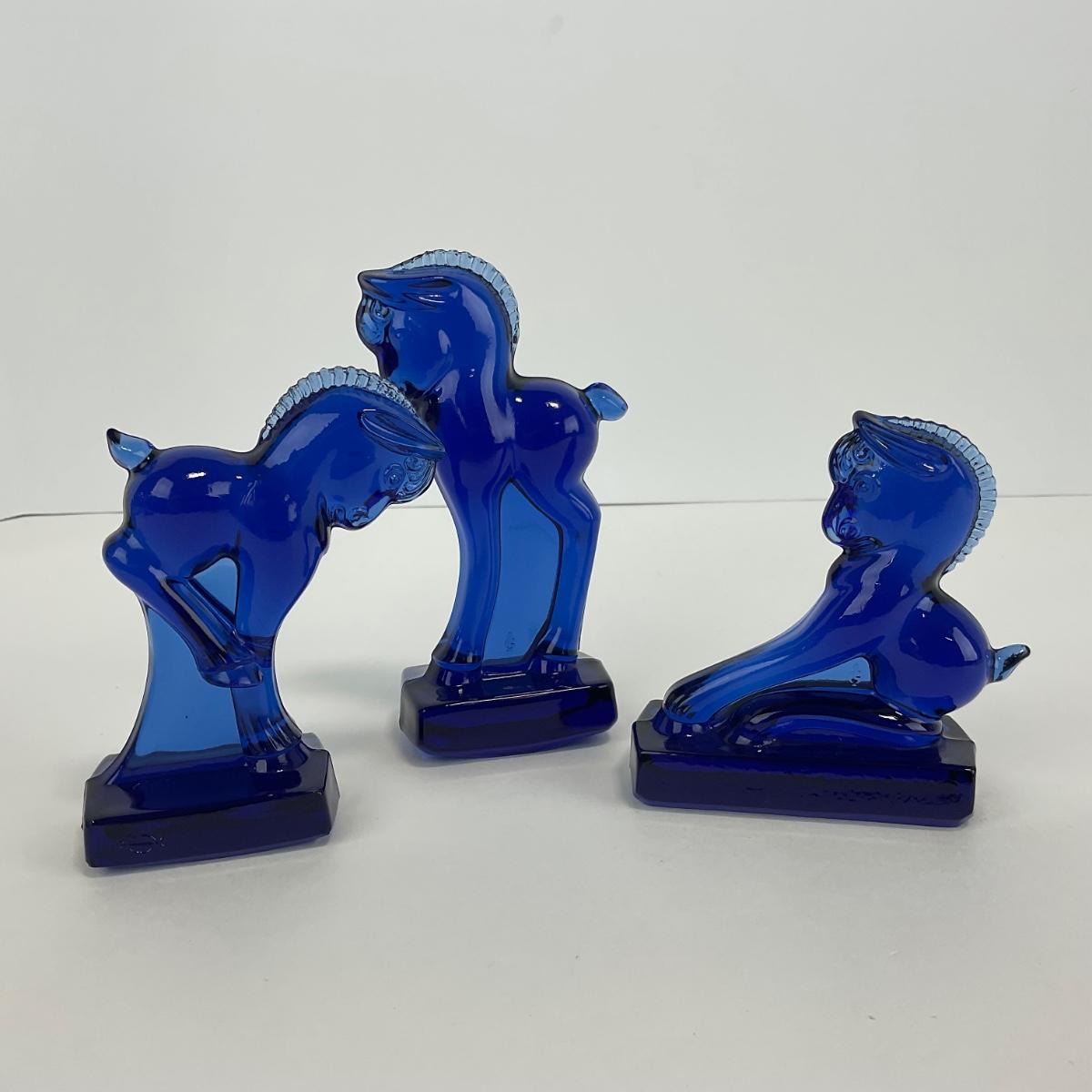 Three Heisey by Mosser blue colt pony horses. One standing one balking and one kicking all marked. This piece has no damage, and appears to be in great shape with no visable chips, cracks, or broken pieces. Please see photos for details and condition. Any condition statement is given as a courtesy to a client, is an opinion, and should not be treated as a statement of fact. Reference to condition written, oral or within a condition report shall not be regarded as a full account of condition and may not include all defects, alterations, or restorations. Absence of a condition report does not imply a lot is flawless or lacking imperfections or damage. Katherine’s Auction & Appraisal Service shall have no responsibility for any error or omission. Returns shall not be accepted on the basis of condition. ::: Shipping is available on this lot. If you require shipping you must let us know at the close of the auction. We will coordinate with you after the item has been won. Shipping fees will include insurance up to or exceeding the value of all items being mailed. If you have any questions regarding this lot please contact the auctioneer either via this website, by direct email or by phone. PICK UP TIMES and other important information can be found in the TERMS and DESCRIPTION of the auction. Please take a look for pertinent information. Thanks!