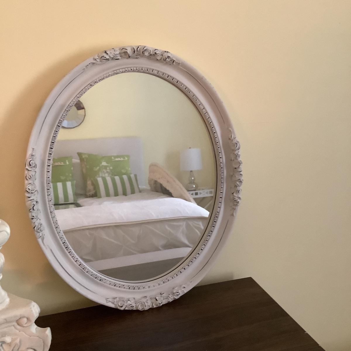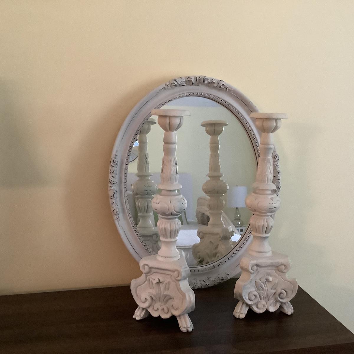 292 Pair of Shabby Chic White Wooden Painted Candlesticks and Oval Mirror