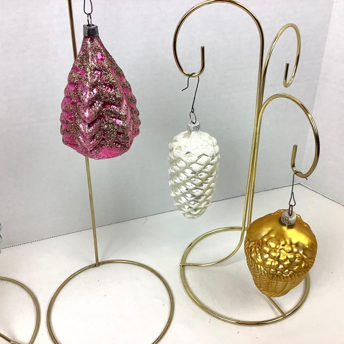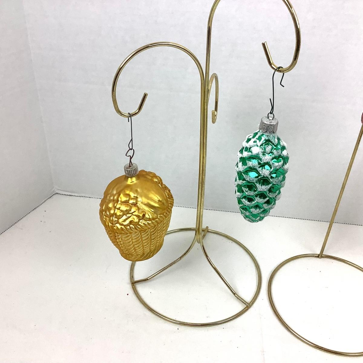 There are 3 glass pine cone ornaments marked Poland, there are 2 golden glass baskets with fruit. The ornaments range in size from 2"-4".