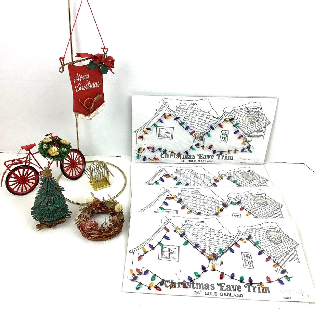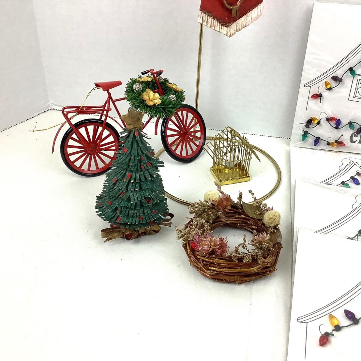 The lot contains 4 packages of bulb garland, metal christmas tree, red bike with wreath, wreath for the door and bird cage with bird.