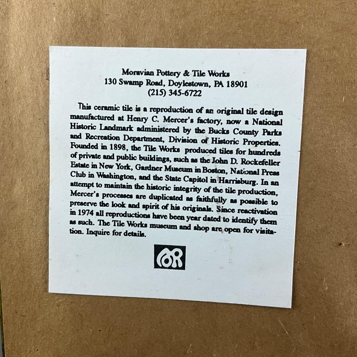 This is a reproduction of Henry C. Mercer's design manufactured from the Moravian Pottery And Tile Company In Doylestown, PA