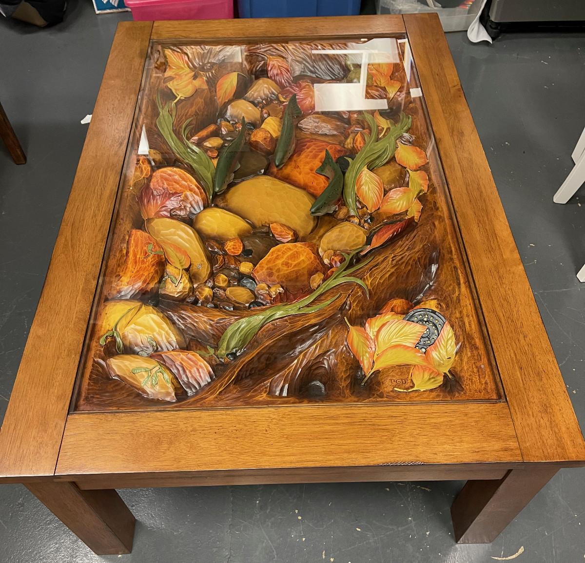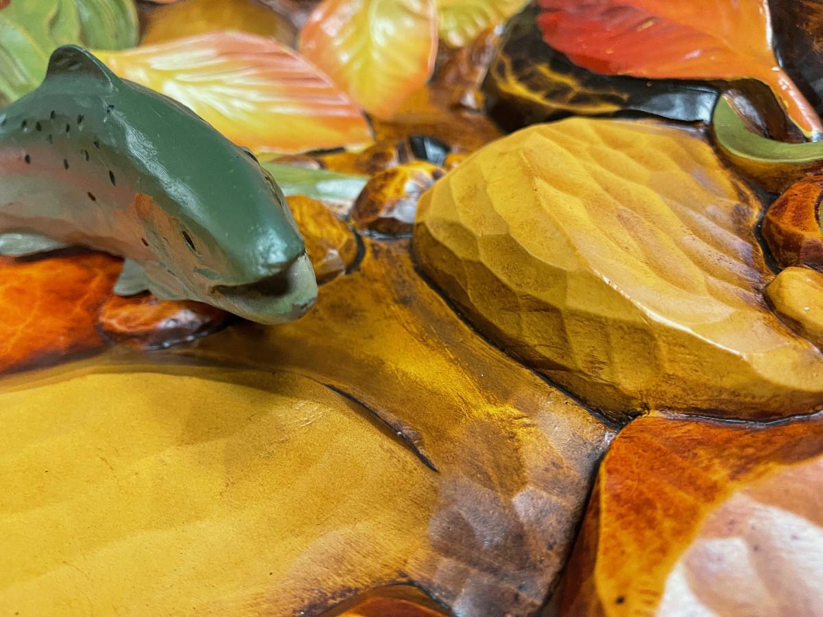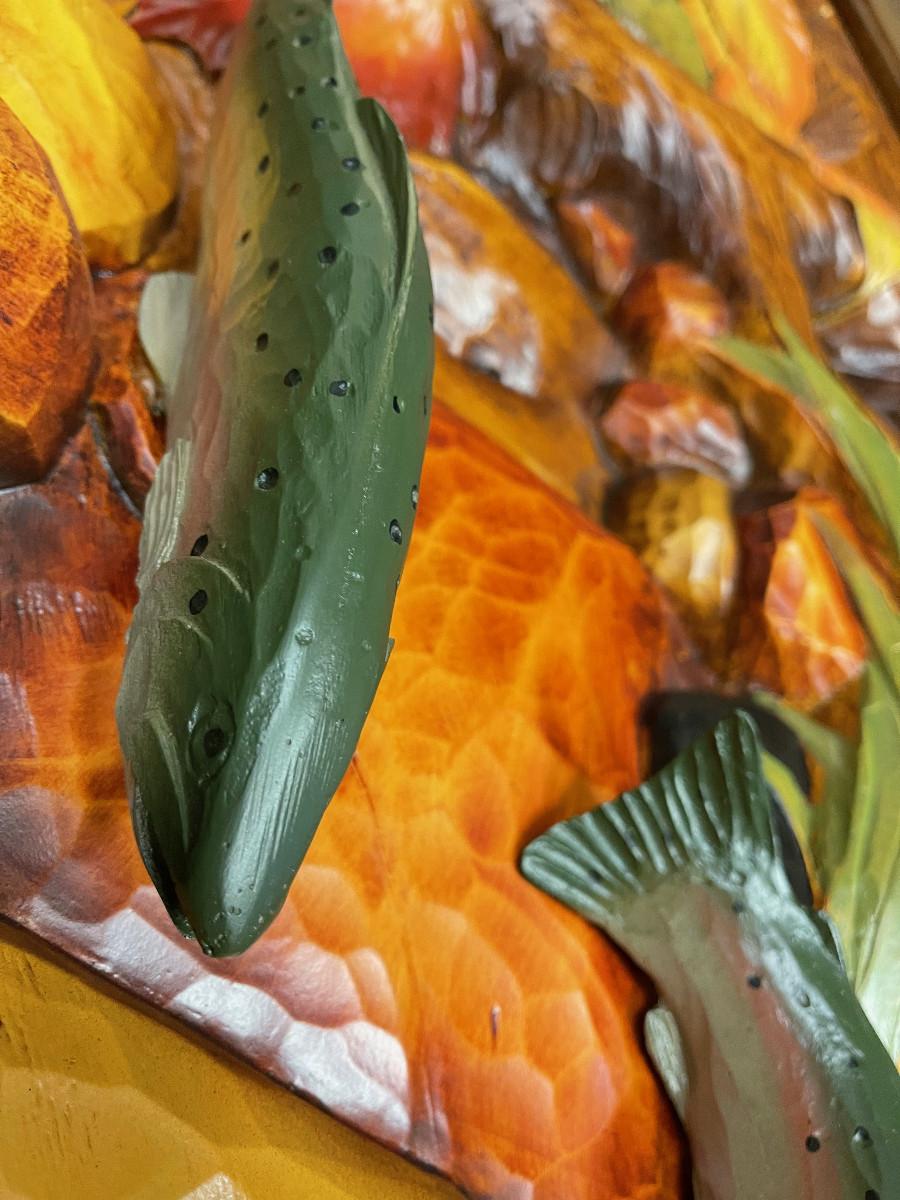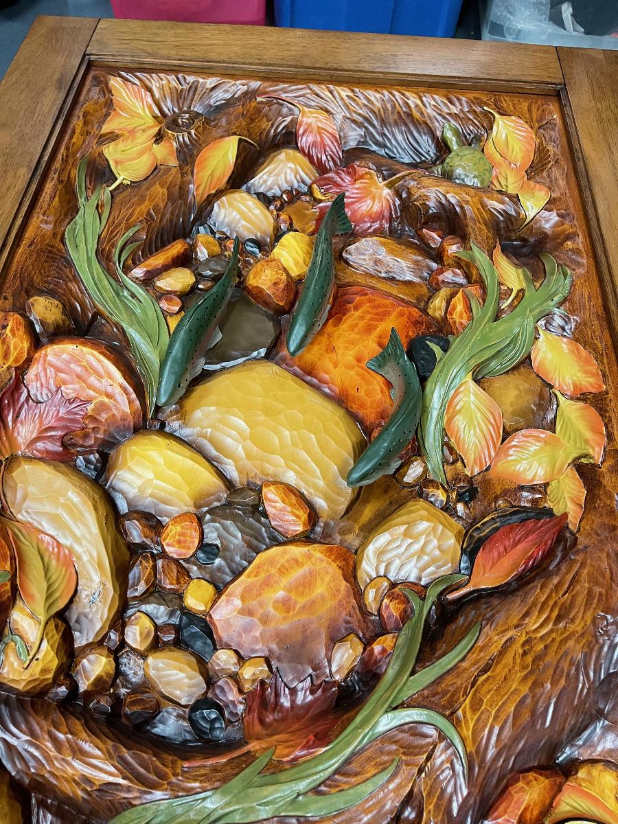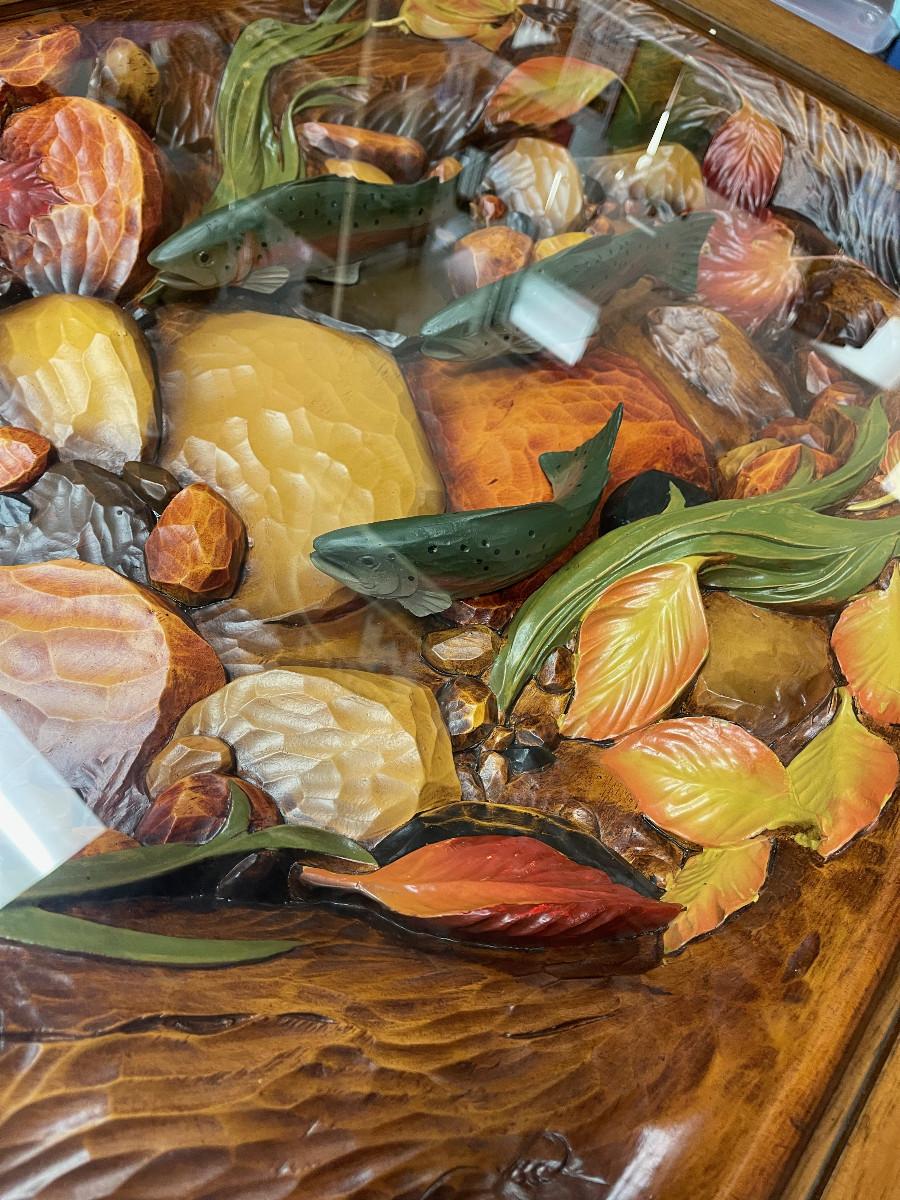#293 Trout In the Stream Coffee Table, Carved Wood. UNIQUE