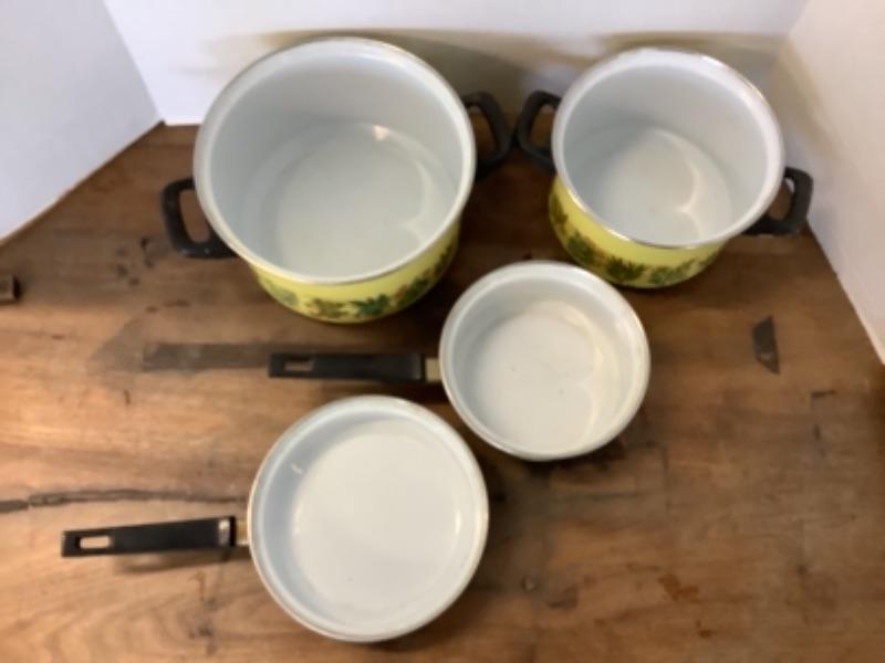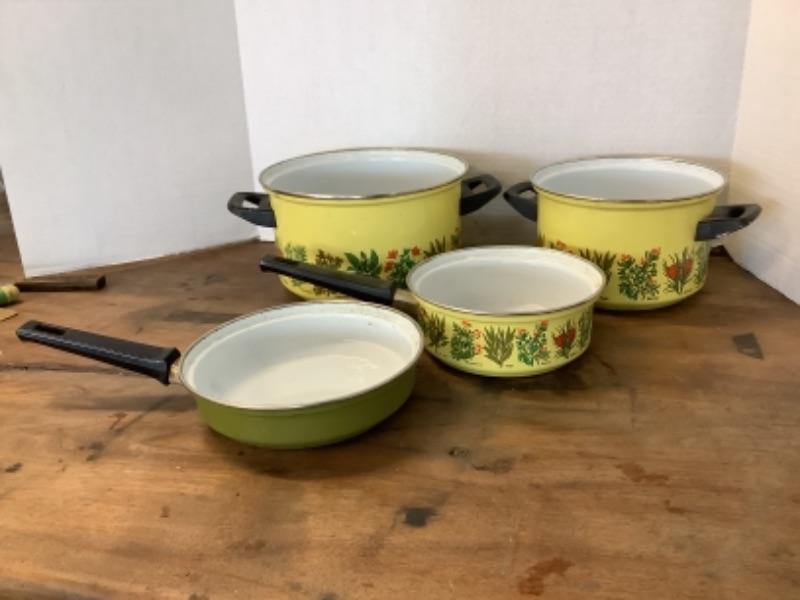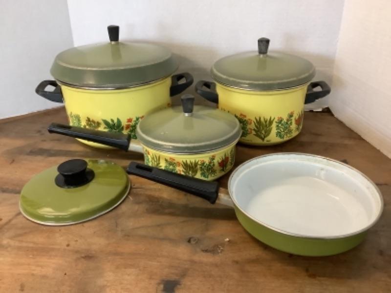 Three vintage yellow enamelware pots with lids. One vintage green enamelware pot without lid and one lid.