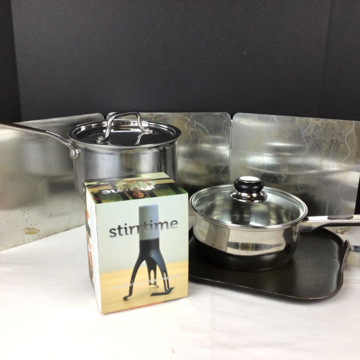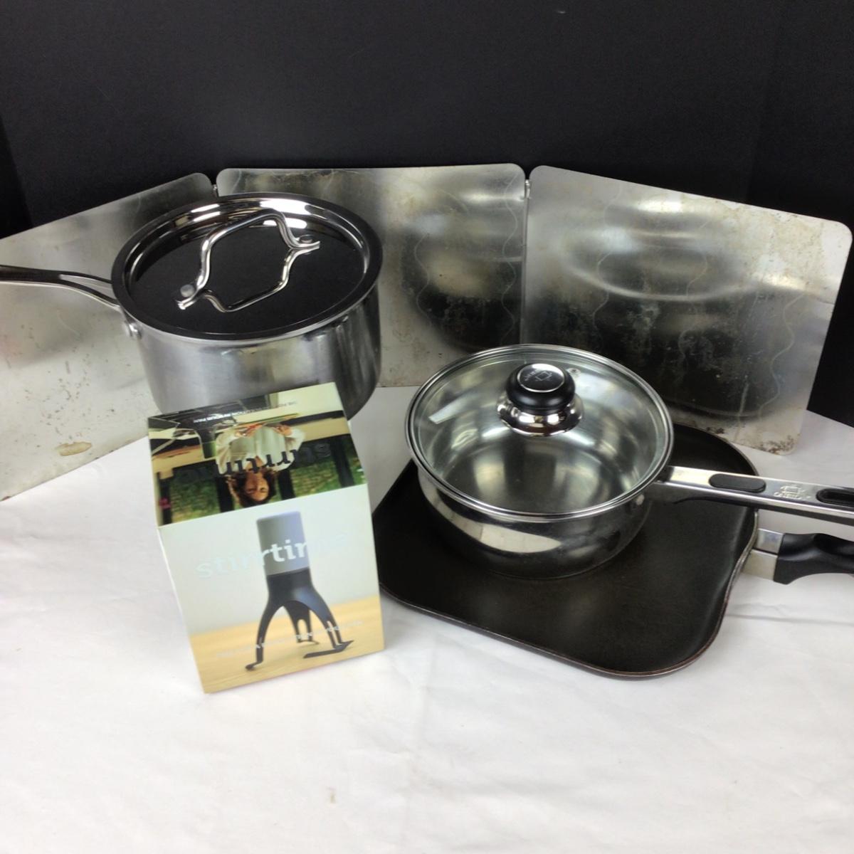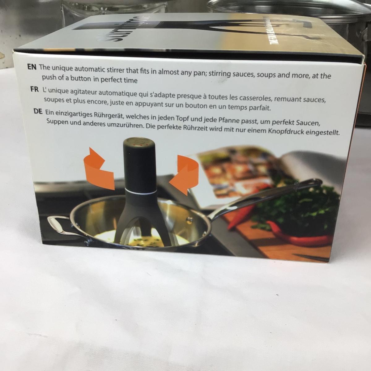 The lot contains new in box automatic stirrer, splatter screen, griddle and pots.