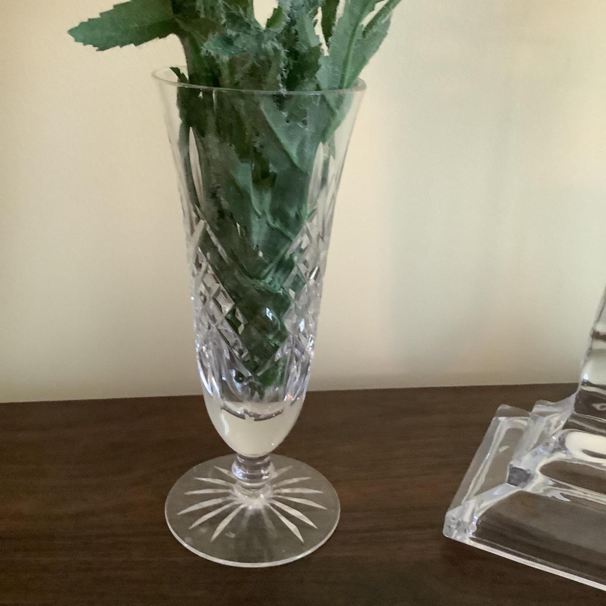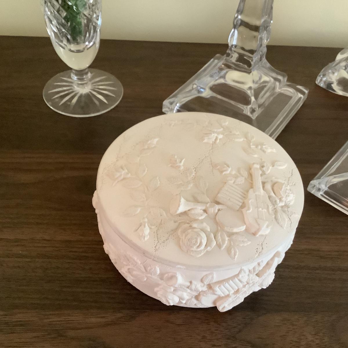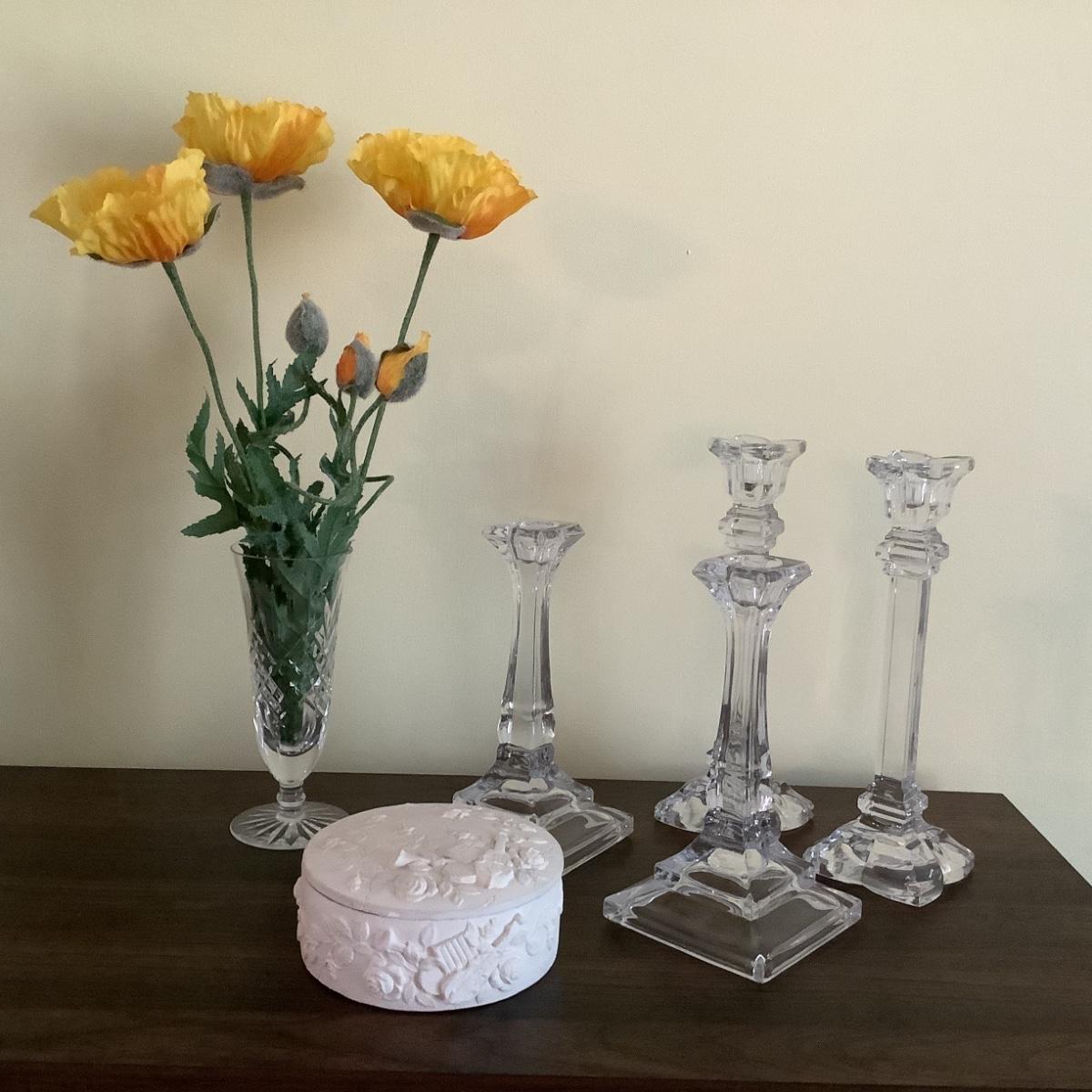 294 Two pairs of Clear Glass Candlesticks , Crystal Vase , Ceramic Vanity Box