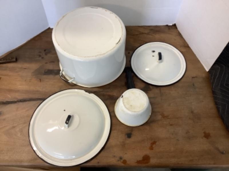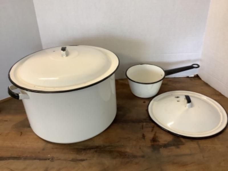 White enamelware kettle measures 11-1/2” round and 7-1/2” deep and comes with lid and small saucepan. Also included is an extra lid, extra lid does not fit either pot