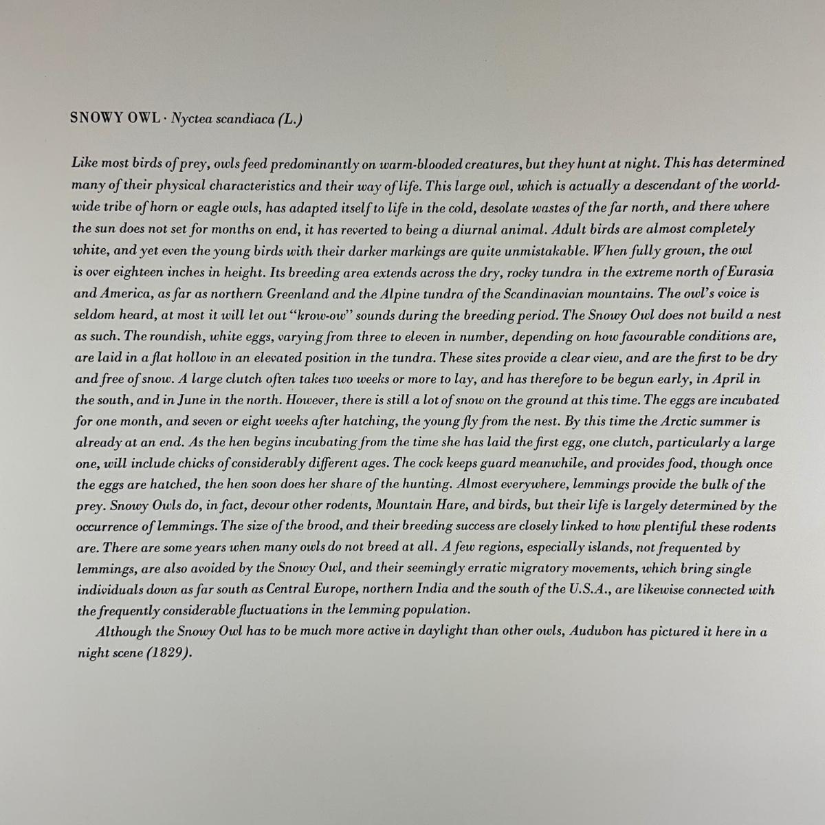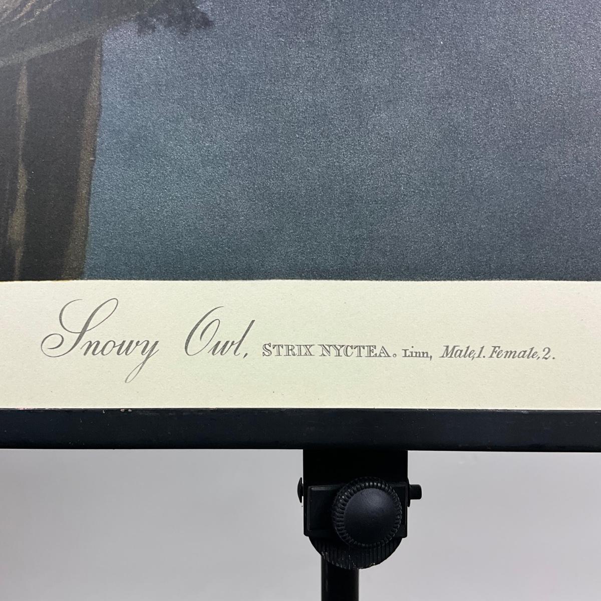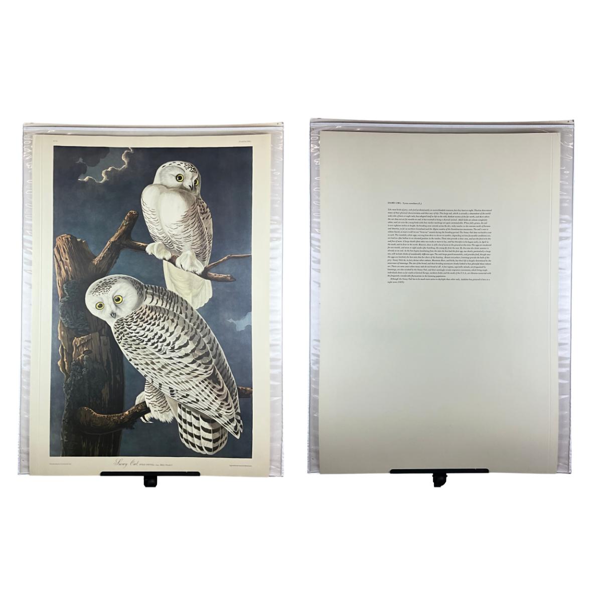 Hand-colored engraving titled “Snowy Owl” (Strix nyctea), depicting male and female birds, drawn from nature by John James Audubon and engraved, printed, and colored by Robert Havell Jr., London. From Audubon’s celebrated Birds of America (Havell edition). The plate is accompanied by its original letterpress text leaf describing the species’ habits and range. A fine 19th-century Audubon ornithological engraving with strong detail and rich hand coloring.