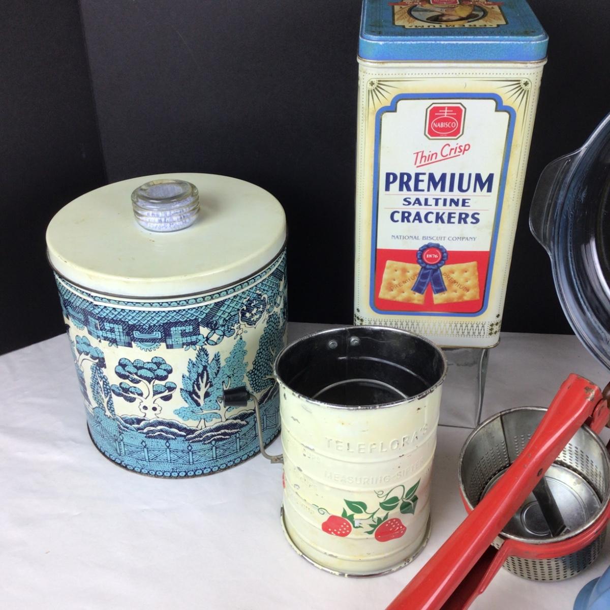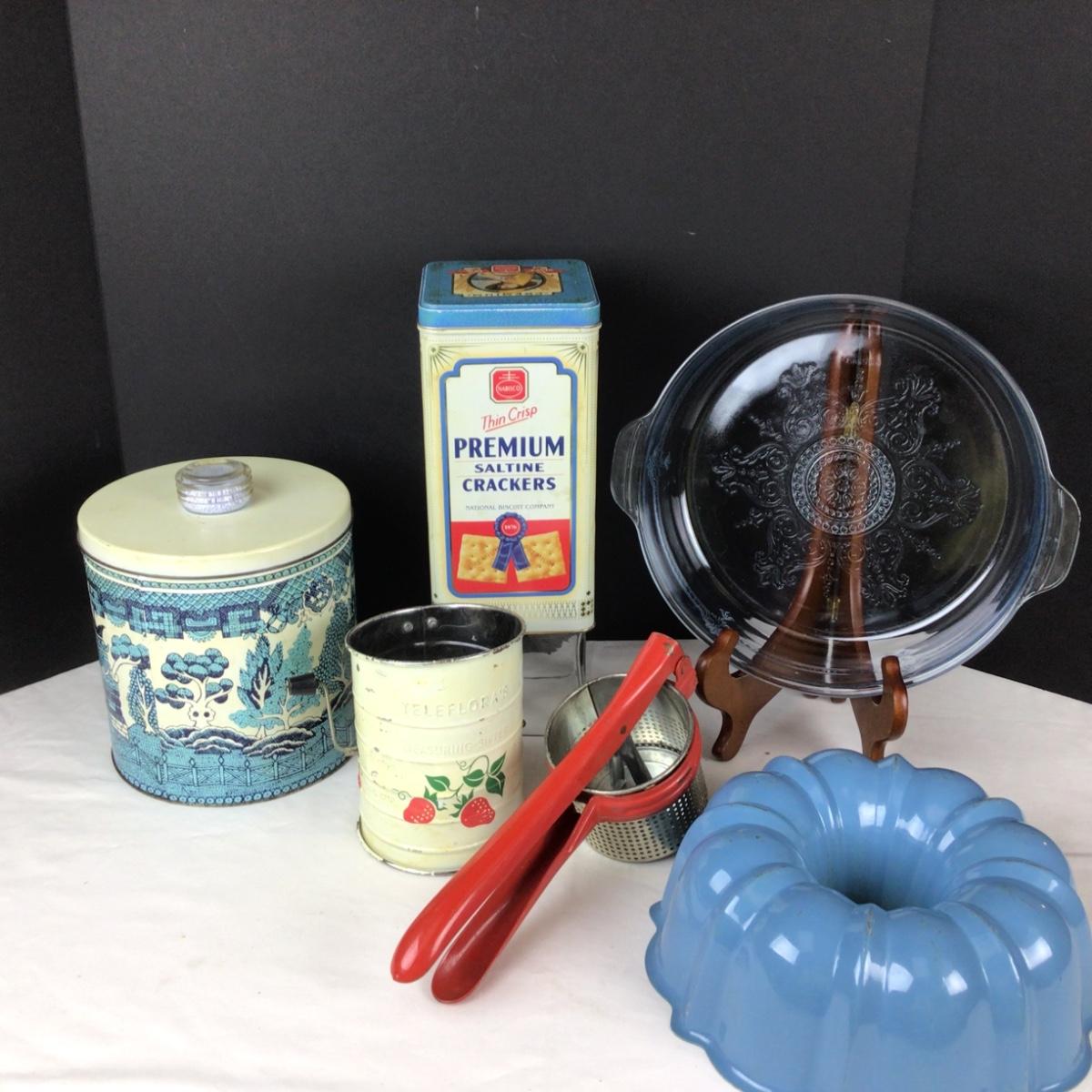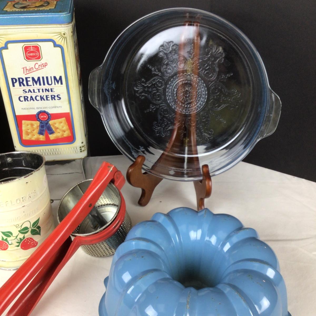 Fire King casserole dish, vintage tins, potato ricer, blue Bundt pan.