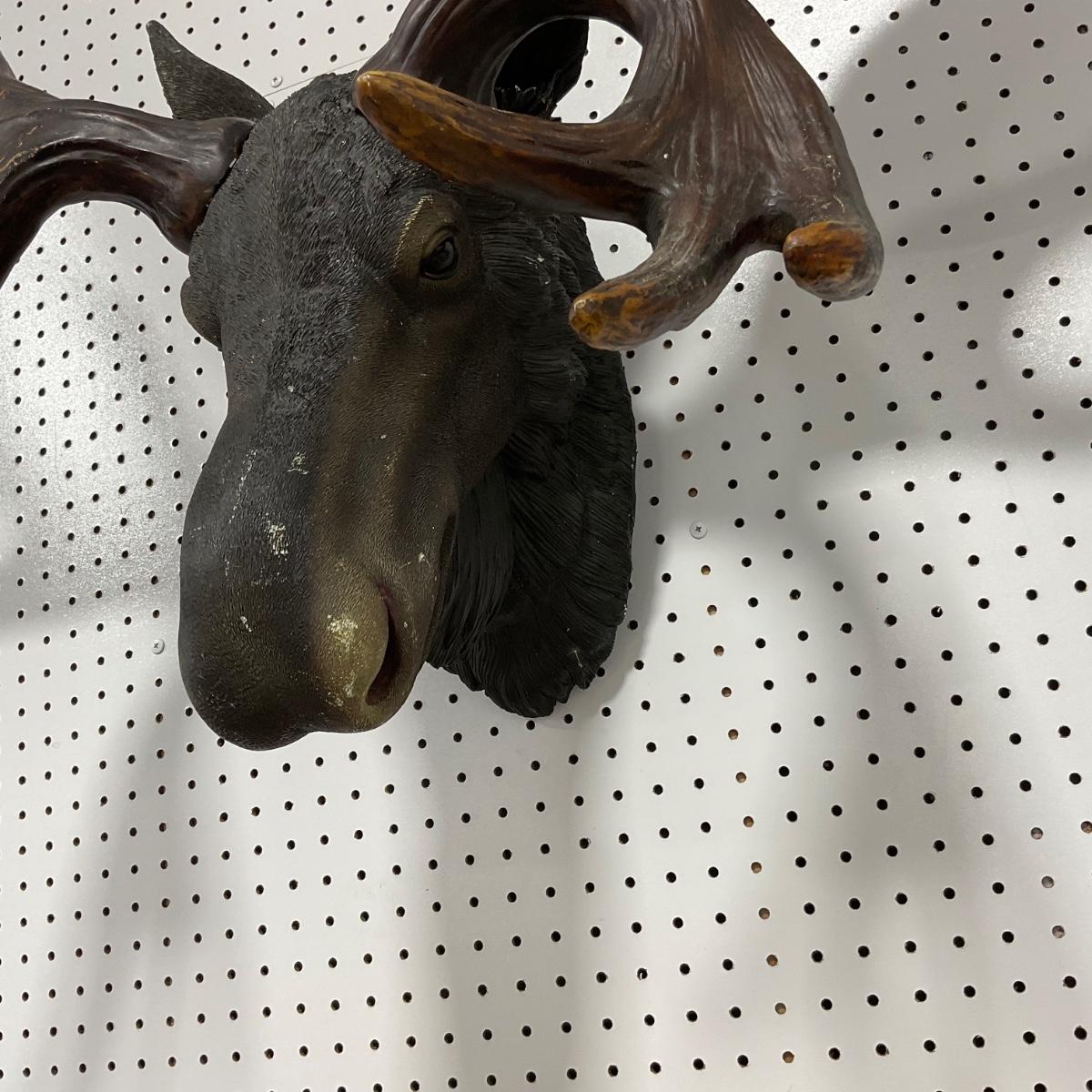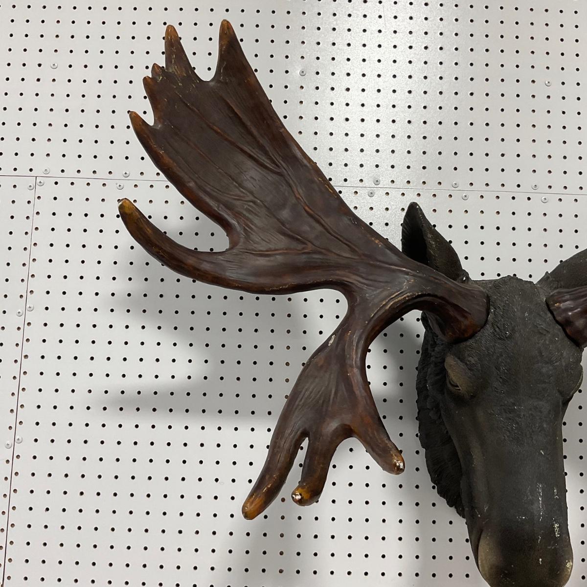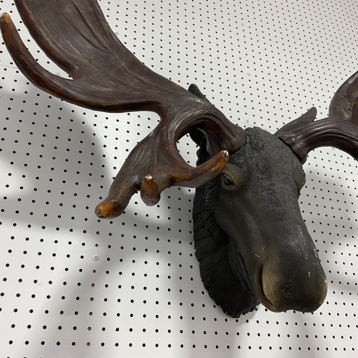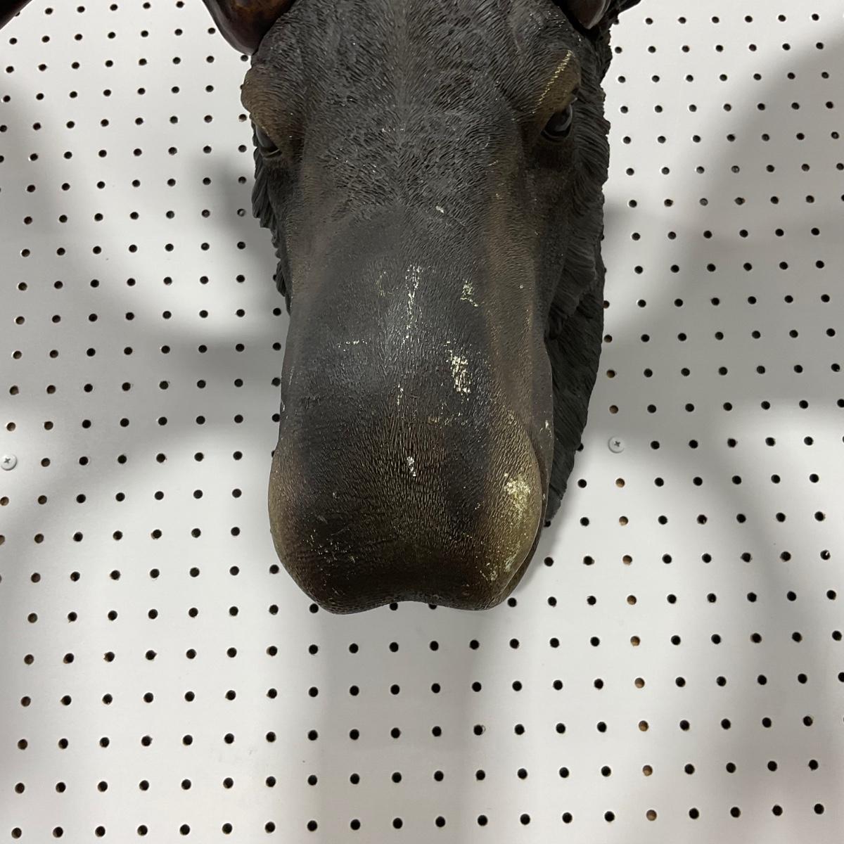 One large North American Moose Trophy Head Wall Sculpture. There is quite a bit of damage to this piece. Both ears have been glued back on there is some chipping, scraps, and so on. However this is a beautiful large heavy piece. Both antler are detachable for transportation. Please see photos for details and condition. ::: Shipping is NOT available on this lot. If you have any questions regarding this lot please contact the auctioneer either via this website, by direct email or by phone. PICK UP TIMES and other important information can be found in the TERMS and DESCRIPTION of the auction. Please take a look for pertinent information. Thanks!