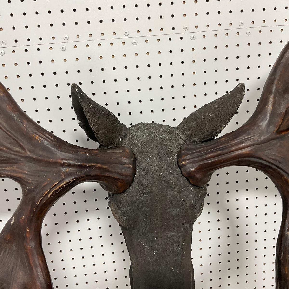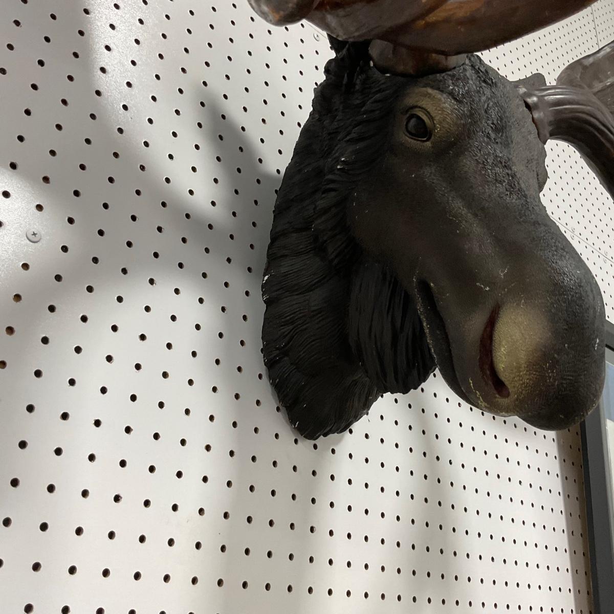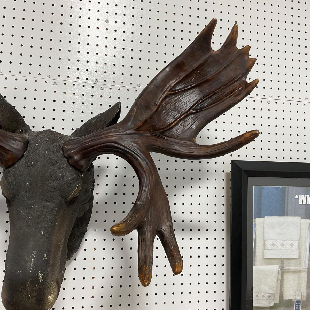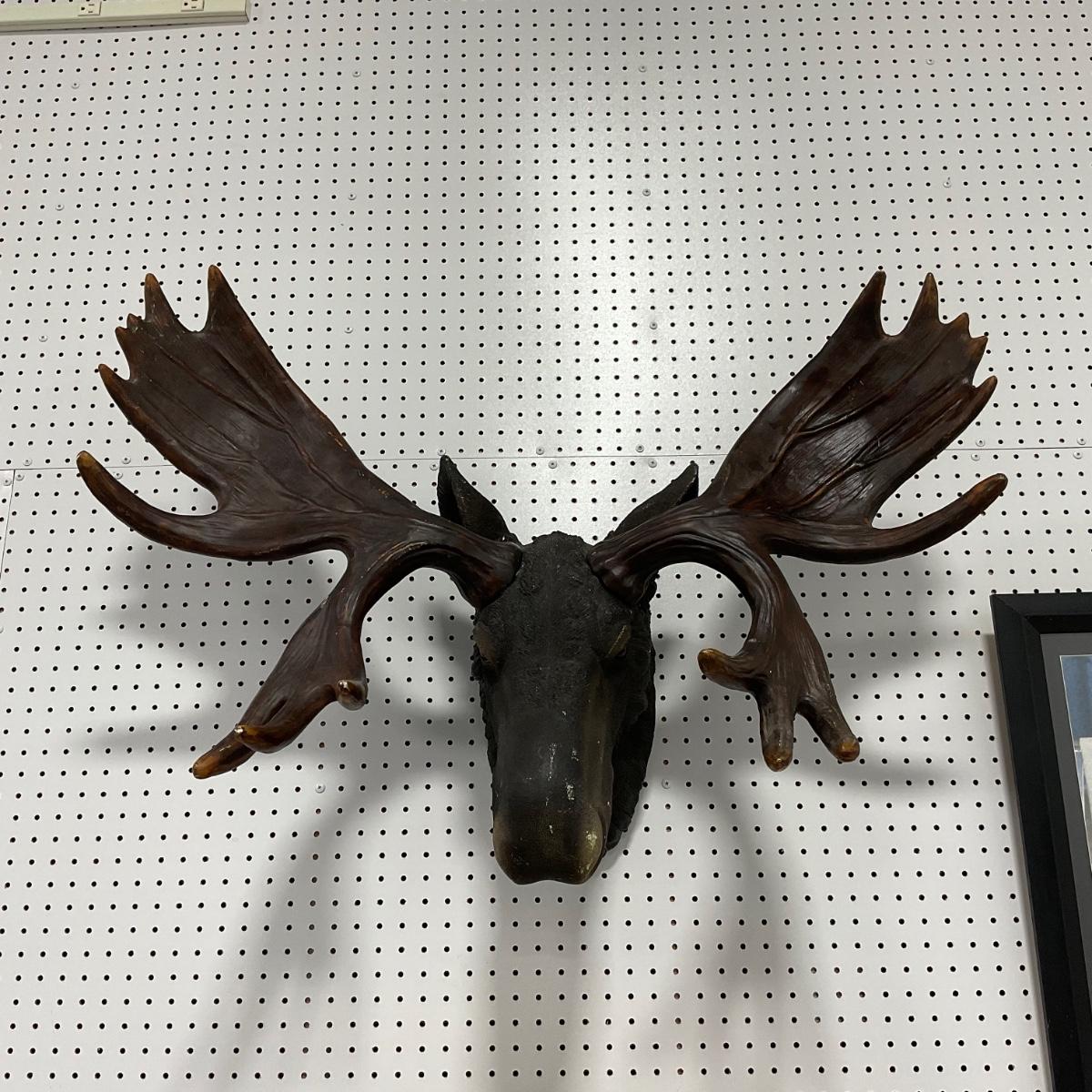 One large North American Moose Trophy Head Wall Sculpture. There is quite a bit of damage to this piece. Both ears have been glued back on there is some chipping, scraps, and so on. However this is a beautiful large heavy piece. Both antler are detachable for transportation. Please see photos for details and condition. ::: Shipping is NOT available on this lot. If you have any questions regarding this lot please contact the auctioneer either via this website, by direct email or by phone. PICK UP TIMES and other important information can be found in the TERMS and DESCRIPTION of the auction. Please take a look for pertinent information. Thanks!
