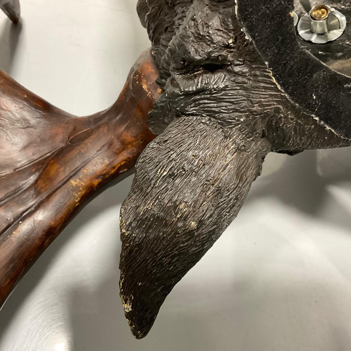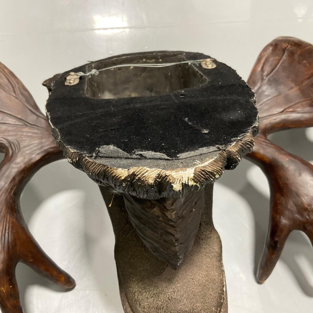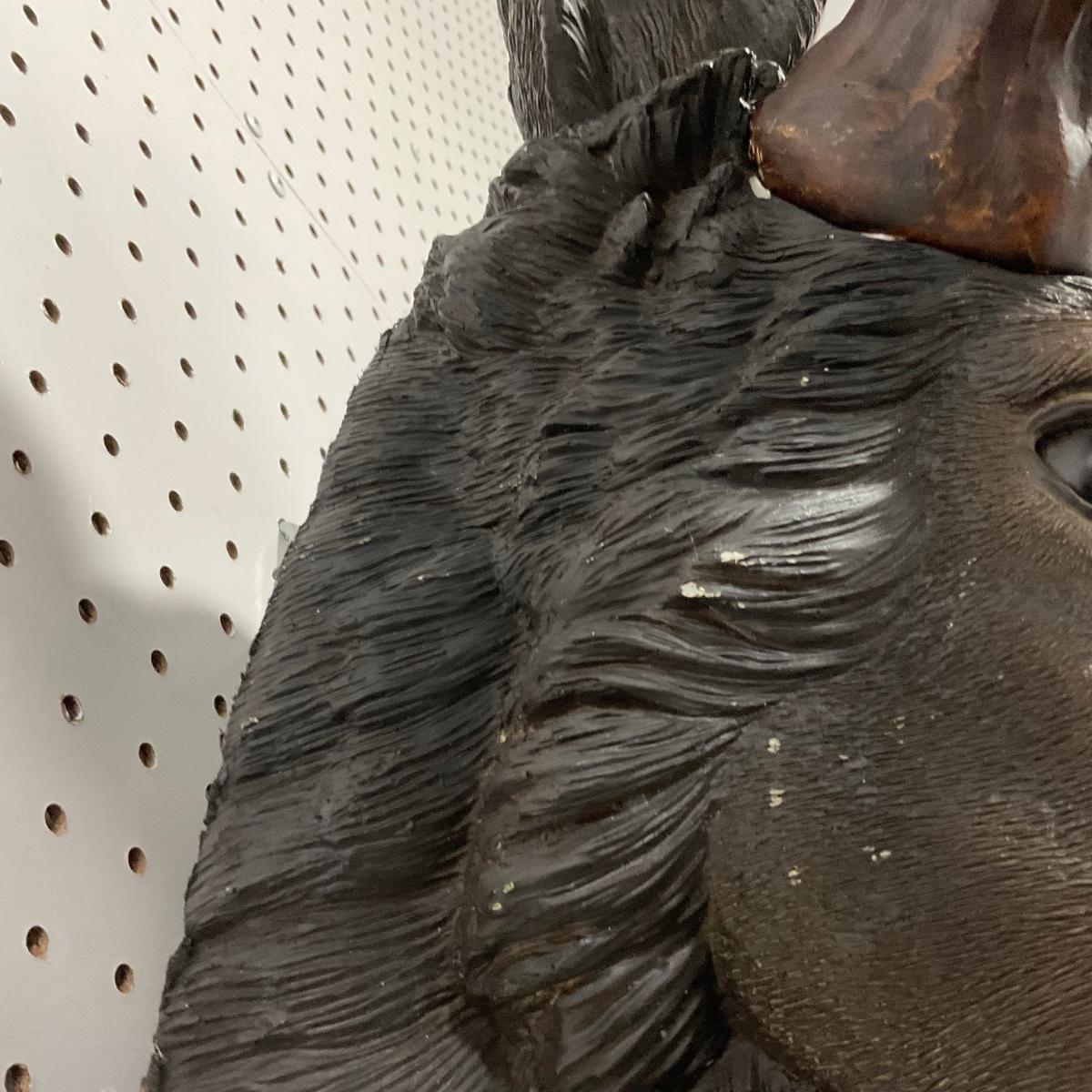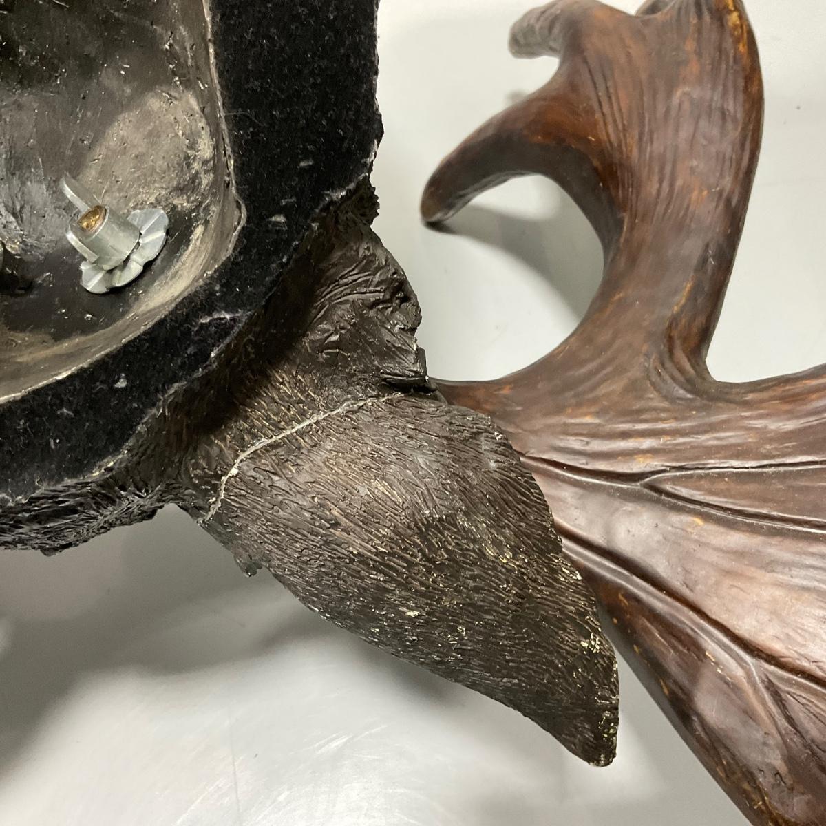 One large North American Moose Trophy Head Wall Sculpture. There is quite a bit of damage to this piece. Both ears have been glued back on there is some chipping, scraps, and so on. However this is a beautiful large heavy piece. Both antler are detachable for transportation. Please see photos for details and condition. ::: Shipping is NOT available on this lot. If you have any questions regarding this lot please contact the auctioneer either via this website, by direct email or by phone. PICK UP TIMES and other important information can be found in the TERMS and DESCRIPTION of the auction. Please take a look for pertinent information. Thanks!