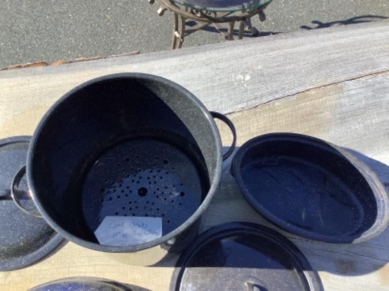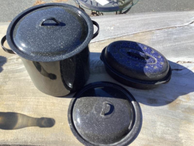 Large enamelware steamer pot with extra lid measures 11”round and 10-1/2” deep and small enamelware roaster pan measures 12” long 8” wide and 5-1/2” deep including lid