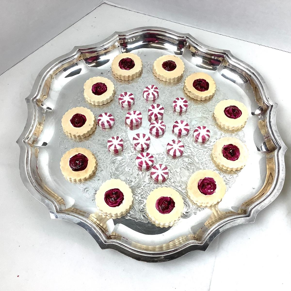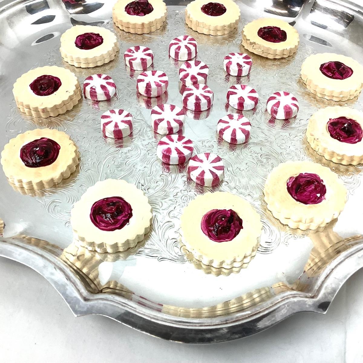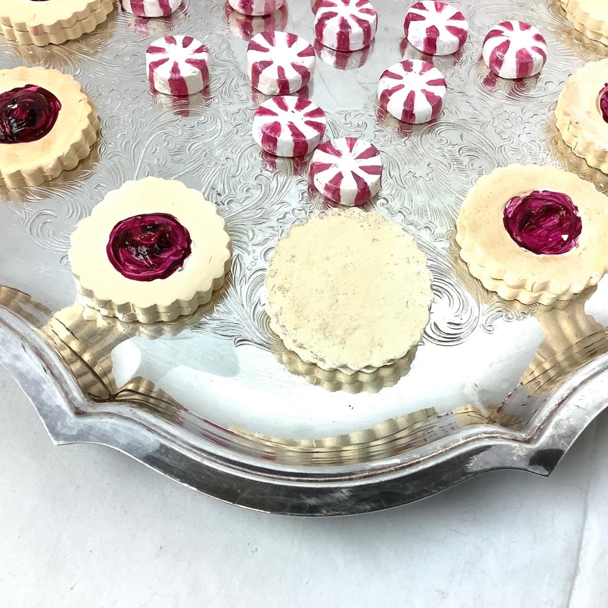 Virginia Perram made these 14 mints (1") and 11 jelly filled cookies (2"). They are made of clay and the tray is not included.