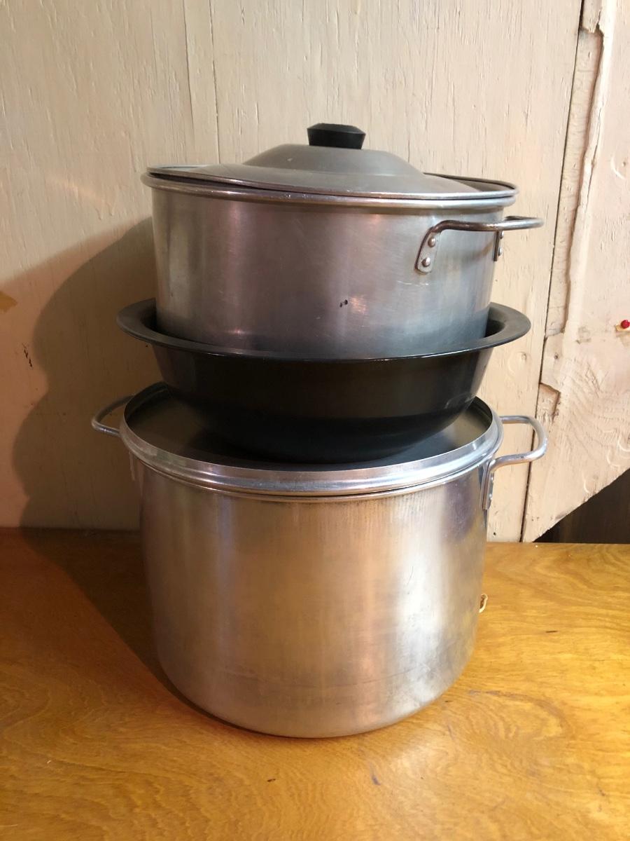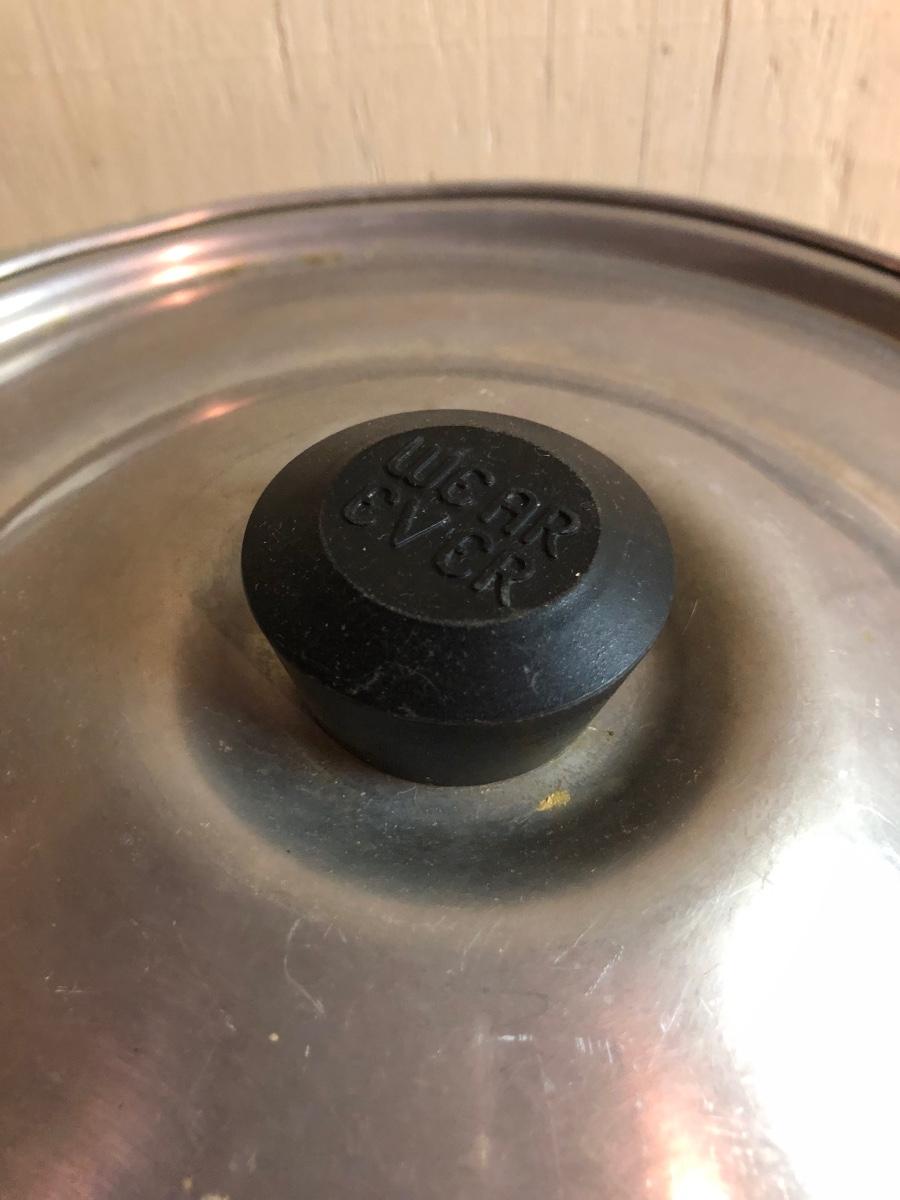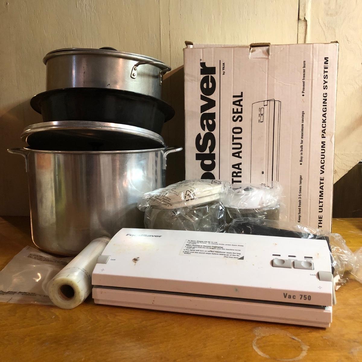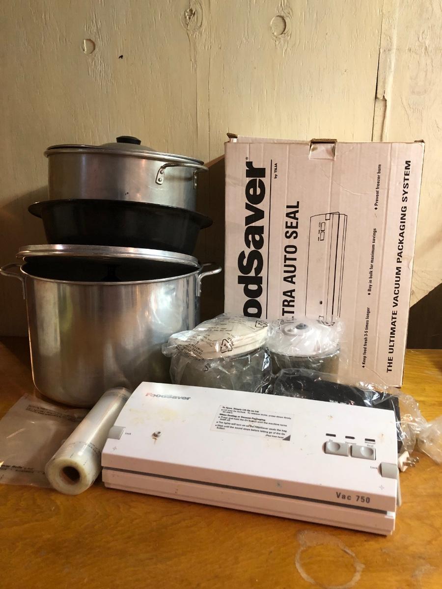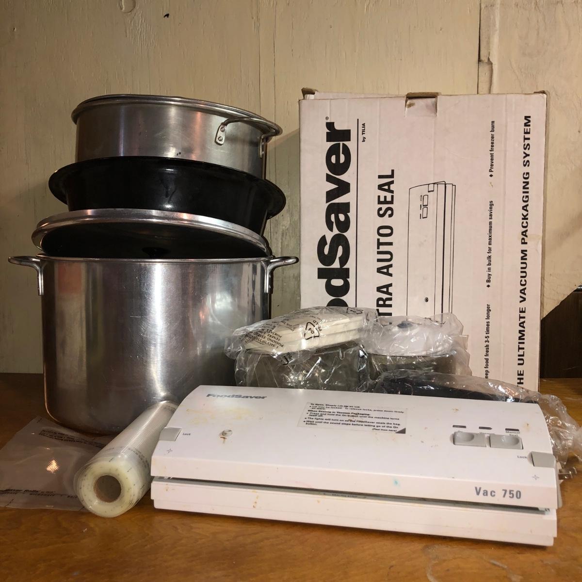 Includes vaccuum sealer with bags and containers to use with the machine. Wear Ever pot, another large pot with a lid and a bowl.