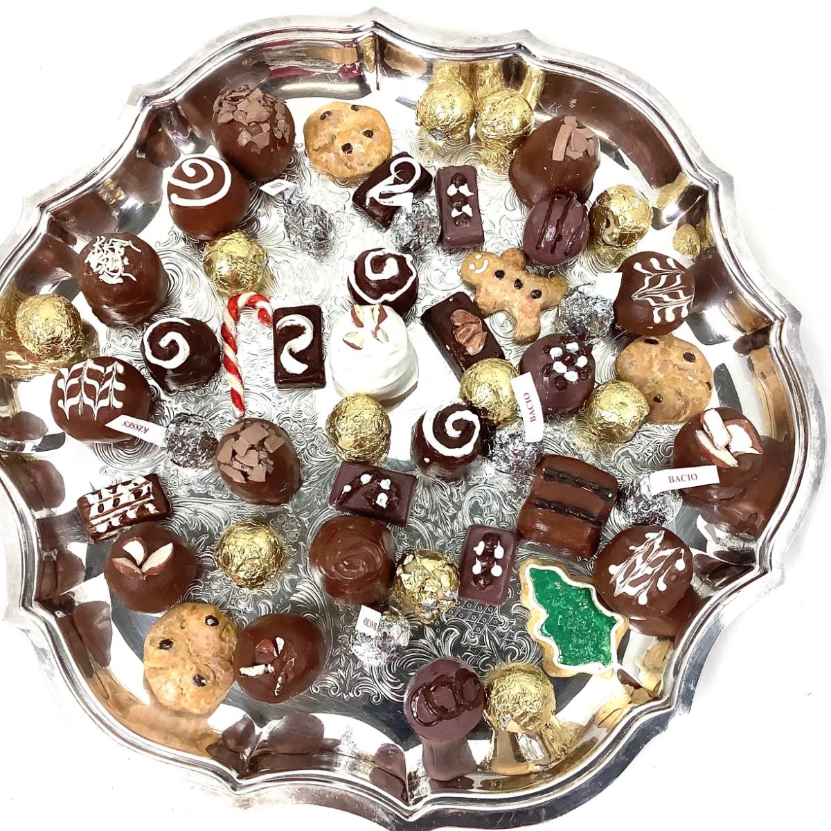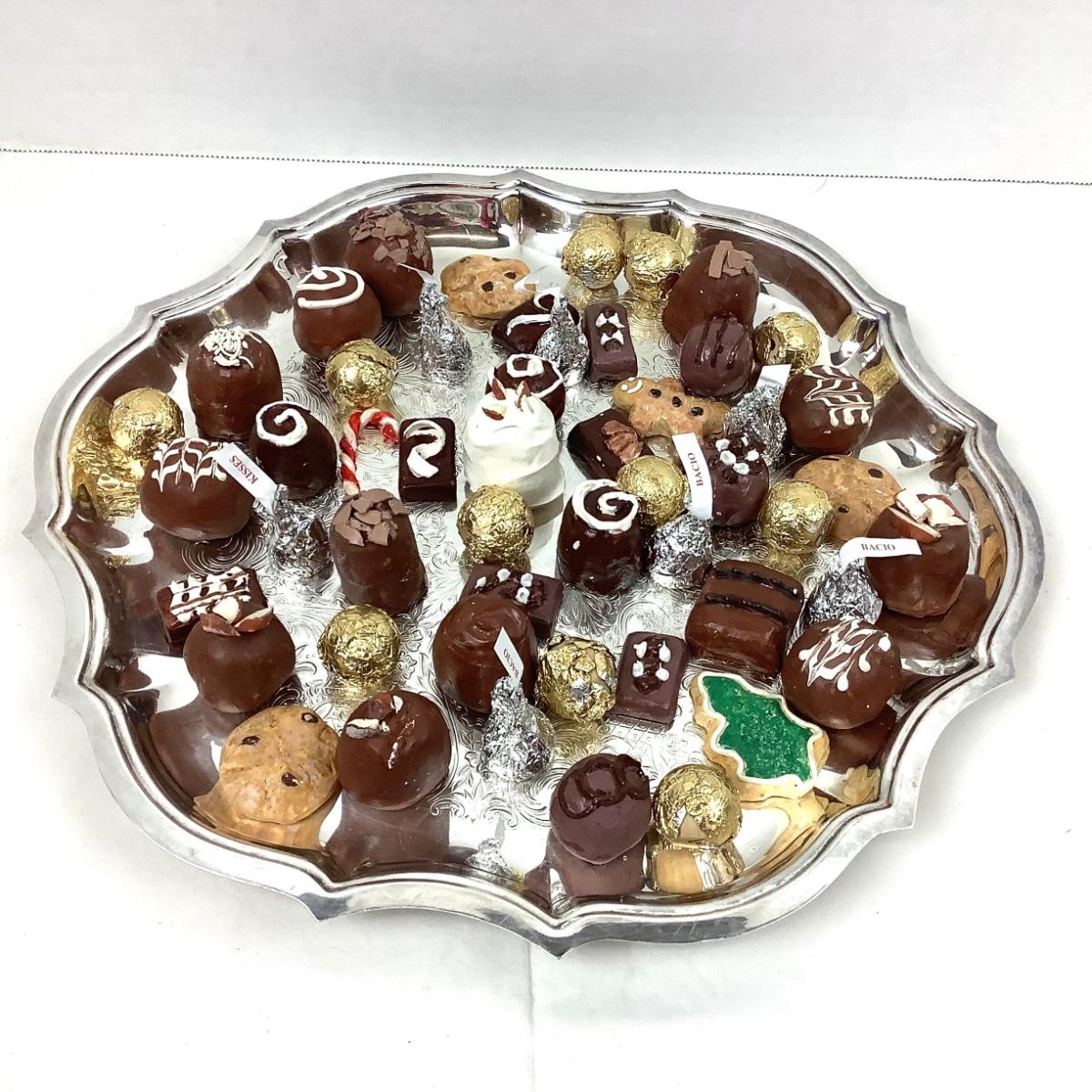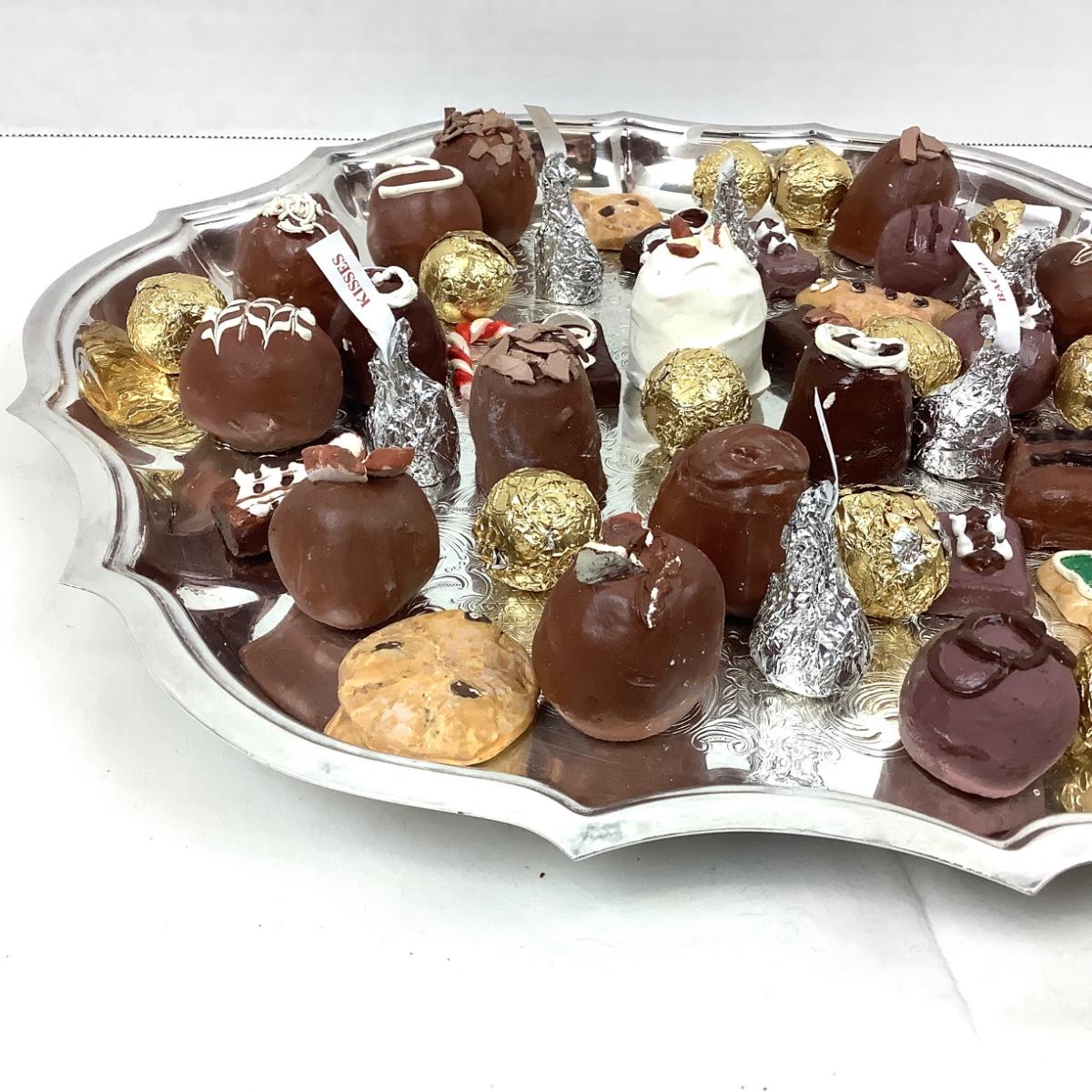 There is an assortment of faux chocolates, candies, bon bons, hershey kisses and more. The tray is not included. Artist is Virginia Perram.