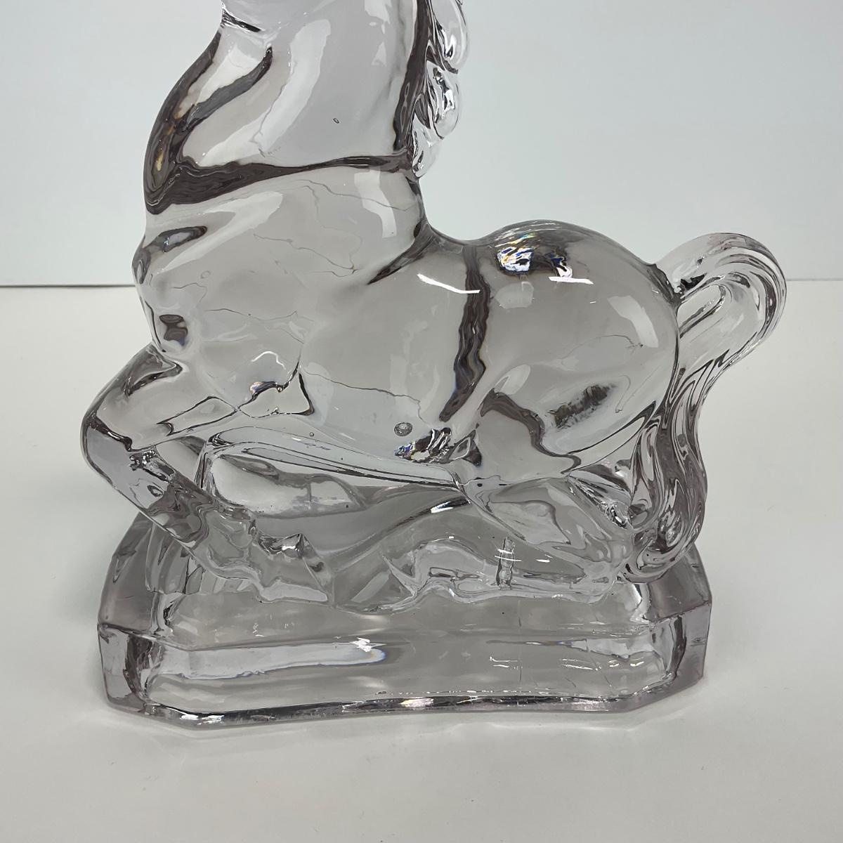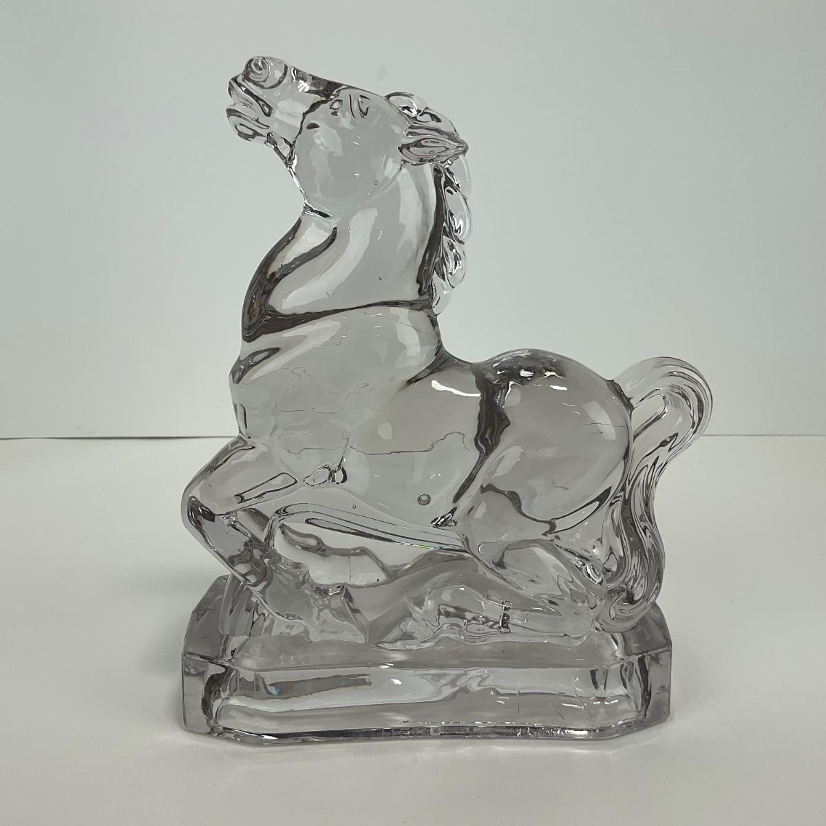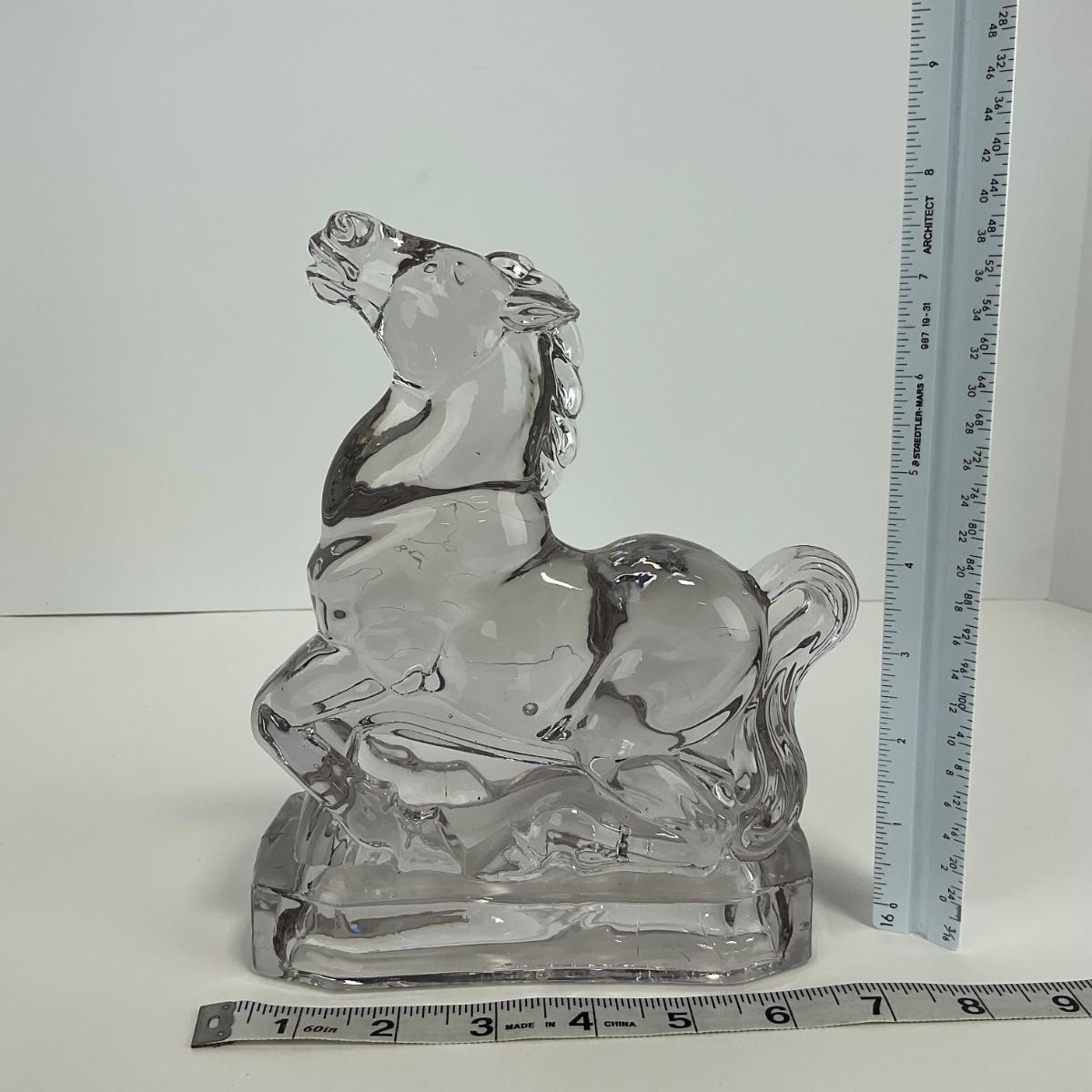 One clear glass New Martinsville Horse bookend. This piece does have some scuffs, scratches, marks, or slight damage, but otherwise appears to be in great shape. Please see photos for details and condition. Any condition statement is given as a courtesy to a client, is an opinion, and should not be treated as a statement of fact. Reference to condition written, oral or within a condition report shall not be regarded as a full account of condition and may not include all defects, alterations, or restorations. Absence of a condition report does not imply a lot is flawless or lacking imperfections or damage. Katherine’s Auction & Appraisal Service shall have no responsibility for any error or omission. Returns shall not be accepted on the basis of condition. ::: Shipping is available on this lot. If you require shipping you must let us know at the close of the auction. We will coordinate with you after the item has been won. Shipping fees will include insurance up to or exceeding the value of all items being mailed. If you have any questions regarding this lot please contact the auctioneer either via this website, by direct email or by phone. PICK UP TIMES and other important information can be found in the TERMS and DESCRIPTION of the auction. Please take a look for pertinent information. Thanks!