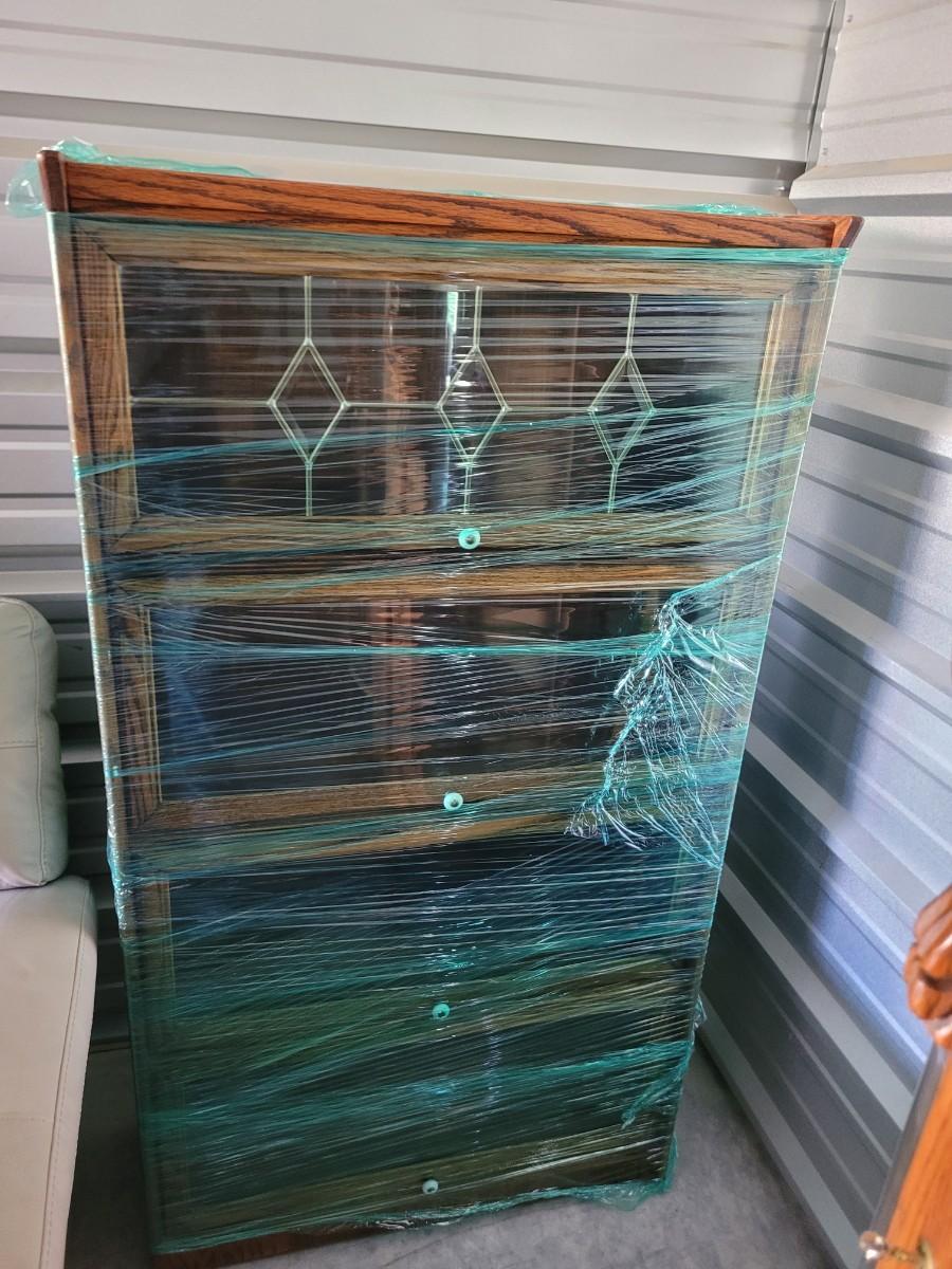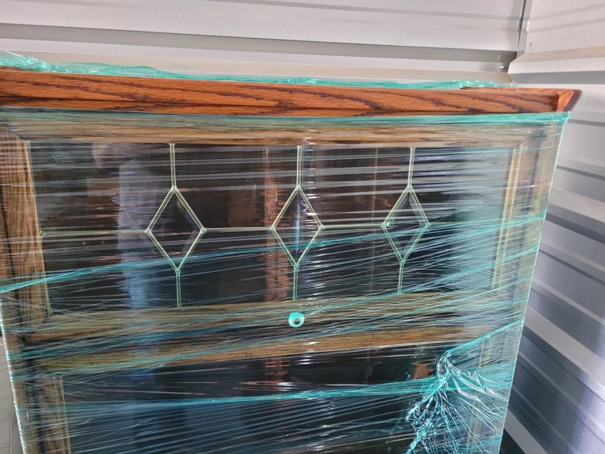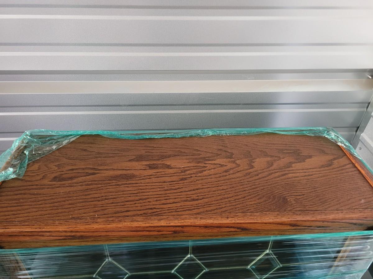 I've left this one wrapped and will wrap it more for transport and for the buyer to view. It's in perfect condition, doors open upwards and slide in, top is leaded glass, measures 60" tall, 33" wide and 12" deep. There is am earlier matching one up for auction as well.