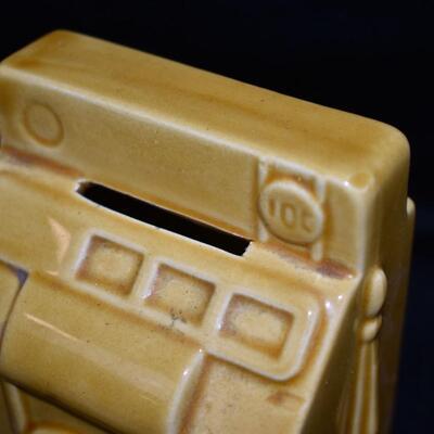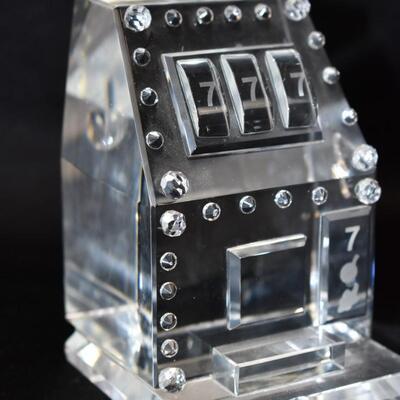 2pc Slot Machine Desk Decor: Glass Paperweight & Ceramic Coin Bank - Used, some chips