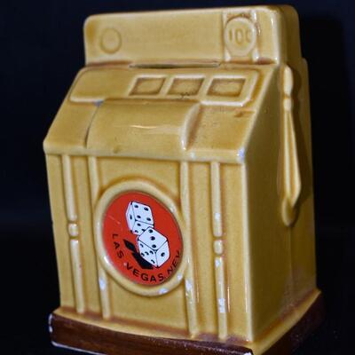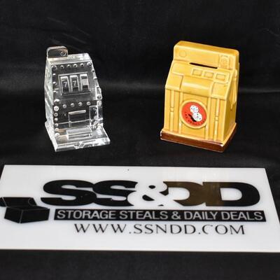 2pc Slot Machine Decor: Glass Paperweight & Ceramic Coin Bank - Used, some chips