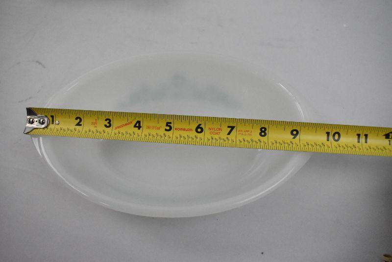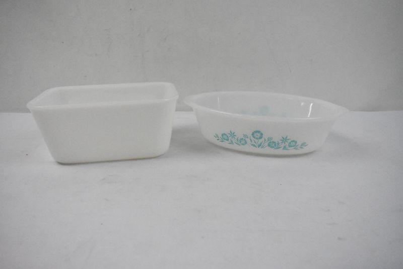 2 Piece Vintage Glass Bakeware: White Glasbake 1.5 Quart Rectangle & Maid of Honor Oval White w/ Blue Flowers