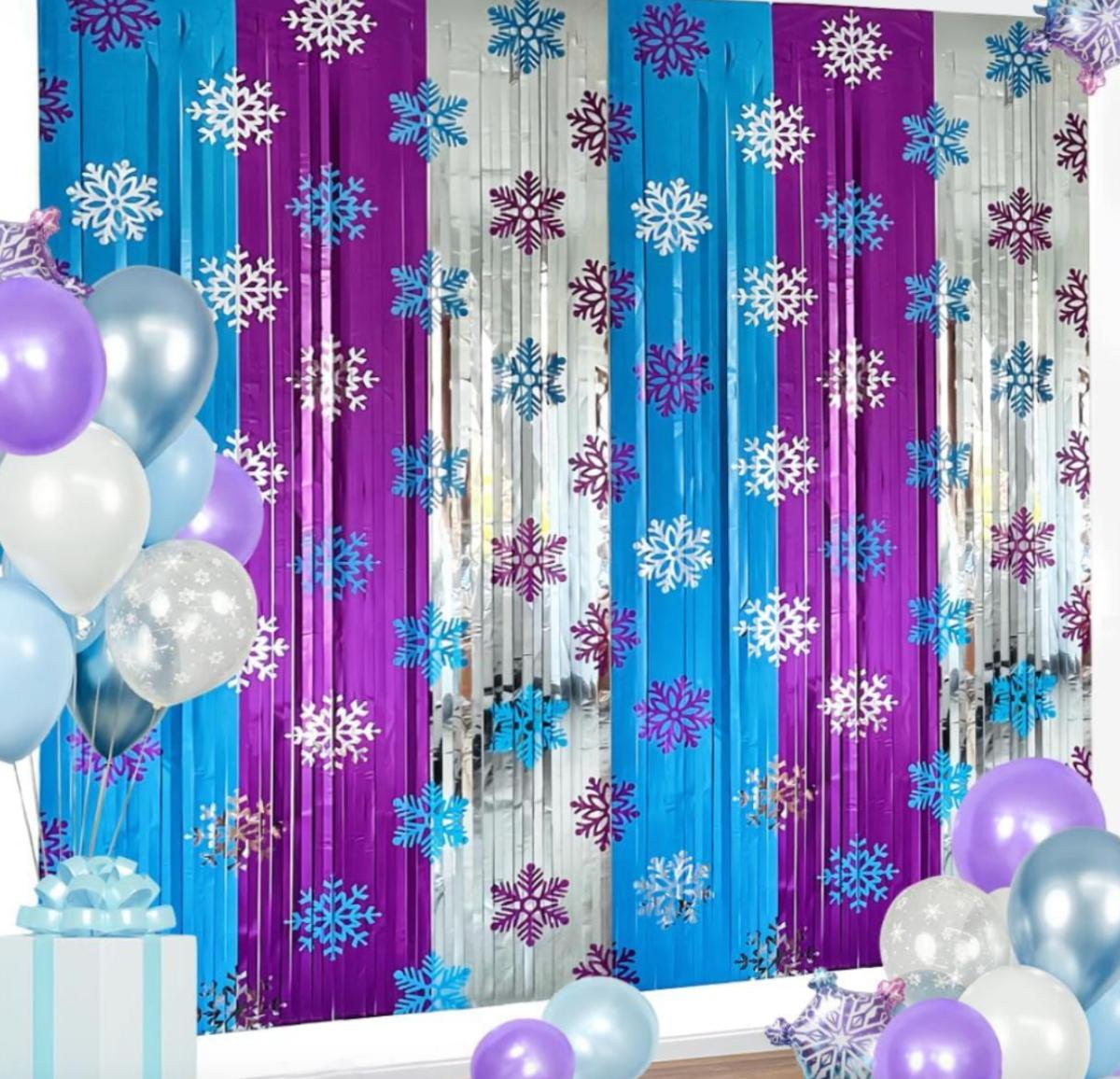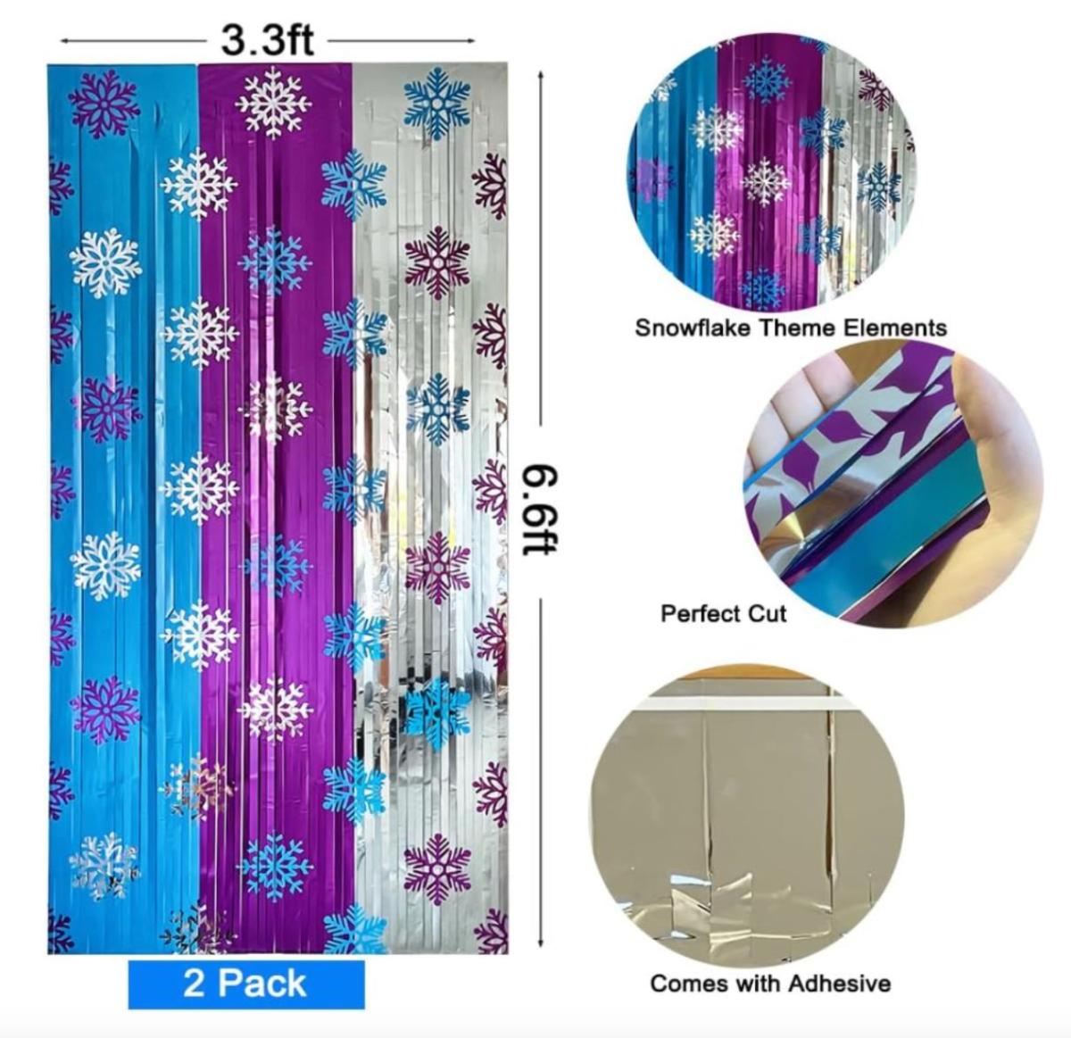 2pcs Winter Party Decorations 3.3x6.6ft Snowflake Pattern Backdrop Foil Fringe Curtains Blue Purple Silver Winter Snowflake Party Streamers Photo Booth Props